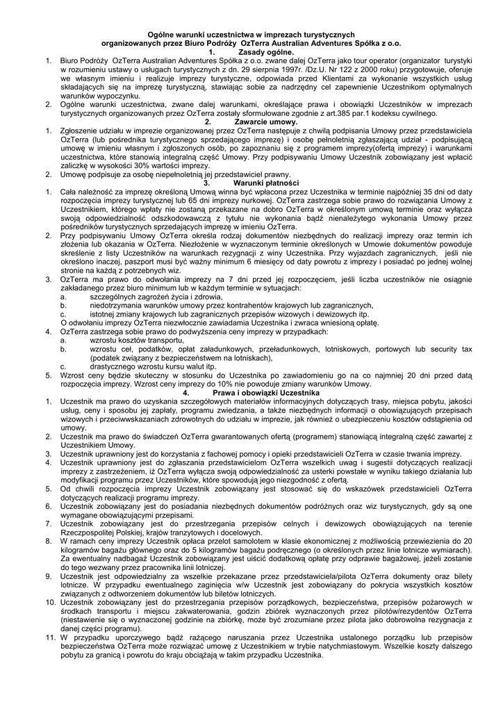 Ogólne warunki uczestnictwa w imprezach turystycznych organizowanych przez Biuro Podróży OzTerra Australian Adventures Spółka z o.o. 1. Zasady ogólne. 1. Biuro Podróży OzTerra Australian Adventures Spółka z o.o. zwane dalej OzTerra jako tour operator (organizator turystyki w rozumieniu ustawy o usługach turystycznych z dn. 29 sierpnia 1997r. /Dz.U. Nr 122 z 2000 roku) przygotowuje, oferuje we własnym imieniu i realizuje imprezy turystyczne, odpowiada przed Klientami za wykonanie wszystkich usług składających się na imprezę turystyczną, stawiając sobie za nadrzędny cel zapewnienie Uczestnikom optymalnych warunków wypoczynku. 2. Ogólne warunki uczestnictwa, zwane dalej warunkami, określające prawa i obowiązki Uczestników w imprezach turystycznych organizowanych przez OzTerra zostały sformułowane zgodnie z art.385 par.1 kodeksu cywilnego. 2. Zawarcie umowy. 1. Zgłoszenie udziału w imprezie organizowanej przez OzTerra następuje z chwilą podpisania Umowy przez przedstawiciela OzTerra (lub pośrednika turystycznego sprzedającego imprezę) i osobę pełnoletnią zgłaszającą udział - podpisującą umowę w imieniu własnym i zgłoszonych osób, po zapoznaniu się z programem imprezy(ofertą imprezy) i warunkami uczestnictwa, które stanowią integralną część Umowy. Przy podpisywaniu Umowy Uczestnik zobowiązany jest wpłacić zaliczkę w wysokości 30% wartości imprezy. 2. Umowę podpisuje za osobę niepełnoletnią jej przedstawiciel prawny. 3. Warunki płatności 1. Cała należność za imprezę określoną Umową winna być wpłacona przez Uczestnika w terminie najpóźniej 35 dni od daty rozpoczęcia imprezy turystycznej lub 65 dni imprezy nurkowej. OzTerra zastrzega sobie prawo do rozwiązania Umowy z Uczestnikiem, którego wpłaty nie zostaną przekazane na dobro OzTerra w określonym umową terminie oraz wyłącza swoją odpowiedzialność odszkodowawczą z tytułu nie wykonania bądź nienależytego wykonania Umowy przez pośredników turystycznych sprzedających imprezę w imieniu OzTerra. 2. Przy podpisywaniu Umowy OzTerra określa rodzaj dokumentów niezbędnych do realizacji imprezy oraz termin ich złożenia lub okazania w OzTerra. Niezłożenie w wyznaczonym terminie określonych w Umowie dokumentów powoduje skreślenie z listy Uczestników na warunkach rezygnacji z winy Uczestnika. Przy wyjazdach zagranicznych, jeśli nie określono inaczej, paszport musi być ważny minimum 6 miesięcy od daty powrotu z imprezy i posiadać po jednej wolnej stronie na każdą z potrzebnych wiz. 3. OzTerra ma prawo do odwołania imprezy na 7 dni przed jej rozpoczęciem, jeśli liczba uczestników nie osiągnie zakładanego przez biuro minimum lub w każdym terminie w sytuacjach: a. szczególnych zagrożeń życia i zdrowia, b. niedotrzymania warunków umowy przez kontrahentów krajowych lub zagranicznych, c. istotnej zmiany krajowych lub zagranicznych przepisów wizowych i dewizowych itp. O odwołaniu imprezy OzTerra niezwłocznie zawiadamia Uczestnika i zwraca wniesioną opłatę. 4. OzTerra zastrzega sobie prawo do podwyższenia ceny imprezy w przypadkach: a. wzrostu kosztów transportu, b. wzrostu ceł, podatków, opłat załadunkowych, przeładunkowych, lotniskowych, portowych lub security tax (podatek związany z bezpieczeństwem na lotniskach), c. drastycznego wzrostu kursu walut itp. 5. Wzrost ceny będzie skuteczny w stosunku do Uczestnika po zawiadomieniu go na co najmniej 20 dni przed datą rozpoczęcia imprezy. Wzrost ceny imprezy do 10% nie powoduje zmiany warunków Umowy. 4. Prawa i obowiązki Uczestnika 1. Uczestnik ma prawo do uzyskania szczegółowych materiałów informacyjnych dotyczących trasy, miejsca pobytu, jakości usług, ceny i sposobu jej zapłaty, programu zwiedzania, a także niezbędnych informacji o obowiązujących przepisach wizowych i przeciwwskazaniach zdrowotnych do udziału w imprezie, jak również o ubezpieczeniu kosztów odstąpienia od umowy. 2. Uczestnik ma prawo do świadczeń OzTerra gwarantowanych ofertą (programem) stanowiącą integralną część zawartej z Uczestnikiem Umowy. 3. Uczestnik uprawniony jest do korzystania z fachowej pomocy i opieki przedstawicieli OzTerra w czasie trwania imprezy. 4. Uczestnik uprawniony jest do zgłaszania przedstawicielom OzTerra wszelkich uwag i sugestii dotyczących realizacji imprezy z zastrzeżeniem, iż OzTerra wyłącza swoją odpowiedzialność za usterki powstałe w wyniku takiego działania lub modyfikacji programu przez Uczestników, które spowodują jego niezgodność z ofertą. 5. Od chwili rozpoczęcia imprezy Uczestnik zobowiązany jest stosować się do wskazówek przedstawicieli OzTerra dotyczących realizacji programu imprezy. 6. Uczestnik zobowiązany jest do posiadania niezbędnych dokumentów podróżnych oraz wiz turystycznych, gdy są one wymagane obowiązującymi przepisami. 7. Uczestnik zobowiązany jest do przestrzegania przepisów celnych i dewizowych obowiązujących na terenie Rzeczpospolitej Polskiej, krajów tranzytowych i docelowych. 8. W ramach ceny imprezy Uczestnik opłaca przelot samolotem w klasie ekonomicznej z możliwością przewiezienia do 20 kilogramów bagażu głównego oraz do 5 kilogramów bagażu podręcznego (o określonych przez linie lotnicze wymiarach). Za ewentualny nadbagaż Uczestnik zobowiązany jest uiścić dodatkową opłatę przy odprawie bagażowej, jeżeli zostanie do tego wezwany przez pracownika linii lotniczej. 9. Uczestnik jest odpowiedzialny za wszelkie przekazane przez przedstawiciela/pilota OzTerra dokumenty oraz bilety lotnicze. W przypadku ewentualnego zaginięcia w/w Uczestnik jest zobowiązany do pokrycia wszystkich kosztów związanych z odtworzeniem dokumentów lub biletów lotniczych. 10. Uczestnik zobowiązany jest do przestrzegania przepisów porządkowych, bezpieczeństwa, przepisów pożarowych w środkach transportu i miejscu zakwaterowania, godzin zbiórek wyznaczonych przez pilotów/rezydentó