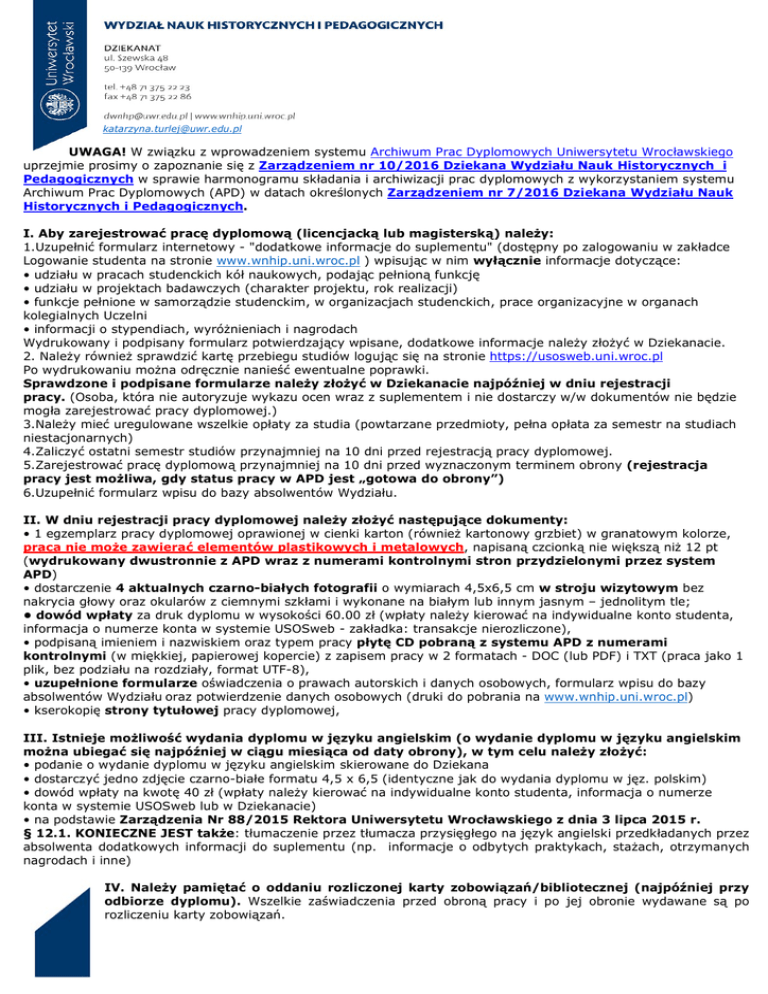 [email protected] UWAGA! W związku z wprowadzeniem systemu Archiwum Prac Dyplomowych Uniwersytetu Wrocławskiego uprzejmie prosimy o zapoznanie się z Zarządzeniem nr 10/2016 Dziekana Wydziału Nauk Historycznych i Pedagogicznych w sprawie harmonogramu składania i archiwizacji prac dyplomowych z wykorzystaniem systemu Archiwum Prac Dyplomowych (APD) w datach określonych Zarządzeniem nr 7/2016 Dziekana Wydziału Nauk Historycznych i Pedagogicznych. I. Aby zarejestrować pracę dyplomową (licencjacką lub magisterską) należy: 1.Uzupełnić formularz internetowy - "dodatkowe informacje do suplementu" (dostępny po zalogowaniu w zakładce Logowanie studenta na stronie www.wnhip.uni.wroc.pl ) wpisując w nim wyłącznie informacje dotyczące: • udziału w pracach studenckich kół naukowych, podając pełnioną funkcję • udziału w projektach badawczych (charakter projektu, rok realizacji) • funkcje pełnione w samorządzie studenckim, w organizacjach studenckich, prace organizacyjne w organach kolegialnych Uczelni • informacji o stypendiach, wyróżnieniach i nagrodach Wydrukowany i podpisany formularz potwierdzający wpisane, dodatkowe informacje należy złożyć w Dziekanacie. 2. Należy również sprawdzić kartę przebiegu studiów logując się na stronie https://usosweb.uni.wroc.pl Po wydrukowaniu można odręcznie nanieść ewentualne poprawki. Sprawdzone i podpisane formularze należy złożyć w Dziekanacie najpóźniej w dniu rejestracji pracy. (Osoba, która nie autoryzuje wykazu ocen wraz z suplementem i nie dostarczy w/w dokumentów nie będzie mogła zarejestrować pracy dyplomowej.) 3.Należy mieć uregulowane wszelkie opłaty za studia (powtarzane przedmioty, pełna opłata za semestr na studiach niestacjonarnych) 4.Zaliczyć ostatni semestr studiów przynajmniej na 10 dni przed rejestracją pracy dyplomowej. 5.Zarejestrować pracę dyplomową przynajmniej na 10 dni przed wyznaczonym terminem obrony (rejestracja pracy jest możliwa, gdy status pracy w APD jest „gotowa do obrony”) 6.Uzupełnić formularz wpisu do bazy absolwentów Wydziału. II. W dniu rejestracji pracy dyplomowej należy złożyć następujące dokumenty: • 1 egzemplarz pracy dyplomowej oprawionej w cienki karton (również kartonowy grzbiet) w granatowym kolorze, praca nie może zawierać elementów plastikowych i metalowych, napisaną czcionką nie większą niż 12 pt (wydrukowany dwustronnie z APD wraz z numerami kontrolnymi stron przydzielonymi przez system APD) • dostarczenie 4 aktualnych czarno-białych fotografii o wymiarach 4,5x6,5 cm w stroju wizytowym bez nakrycia głowy oraz okularów z ciemnymi szkłami i wykonane na białym lub innym jasnym – jednolitym tle; • dowód wpłaty za druk dyplomu w wysokości 60.00 zł (wpłaty należy kierować na indywidualne konto studenta, informacja o numerze konta w systemie USOSweb - zakładka: transakcje nierozliczone), • podpisaną imieniem i nazwiskiem oraz typem pracy płytę CD pobraną z systemu APD z numerami kontrolnymi (w miękkiej, papierowej kopercie) z zapisem pracy w 2 formatach - DOC (lub PDF) i TXT (praca jako 1 plik, bez podziału na rozdziały, format UTF-8), • uzupełnione formularze oświadczenia o prawach autorskich i danych osobowych, formularz wpisu do bazy absolwentów Wydziału oraz potwierdzenie danych osobowych (druki do pobrania na www.wnhip.uni.wroc.pl) • kserokopię strony tytułowej pracy dyplomowej, III. Istnieje możliwość wydania dyplomu w języku angielskim (o wydanie dyplomu w języku angielskim można ubiegać się najpóźniej w ciągu miesiąca od daty obrony), w tym celu należy złożyć: • podanie o wydanie dyplomu w języku angielskim skierowane do Dziekana • dostarczyć jedno zdjęcie czarno-białe formatu 4,5 x 6,5 (identyczne jak do wydania dyplomu w jęz. polskim) • dowód wpłaty na kwotę 40 zł (wpłaty należy kierować na indywidualne konto studenta, informacja o numerze konta w systemie USOSweb lub w Dziekanacie) • na podstawie Zarządzenia Nr 88/2015 Rektora Uniwersytetu Wrocławskiego z dnia 3 lipca 2015 r. § 12.1. KONIECZNE JEST także: tłumaczenie przez tłumacza przysięgłego na język angielski przedkładanych przez absolwenta dodatkowych informacji do suplementu (np. informacje o odbytych praktykach, stażach, otrzymanych nagrodach i inne) IV. Należy pamiętać o oddaniu rozliczonej karty zobowiązań/bibliotecznej (najpóźniej przy odbiorze dyplomu). Wszelkie zaświadczenia przed obroną pracy i po jej obronie wydawane są po rozliczeniu karty zobowiązań.