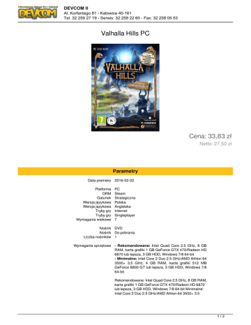 DEVCOM II Al. Korfantego 81 - Katowice 40-161 Tel. 32 259 27 19 - Serwis: 32 259 22 60 - Fax: 32 258 05 53 Valhalla Hills PC Cena: 33,83 zł Netto: 27,50 zł Parametry Data premiery 2016-02-02 Platforma DRM Gatunek Wersja językowa Wersja językowa Tryby gry Tryby gry Wymagania wiekowe PC Steam Strategiczna Polska Angielska Internet Singleplayer 7 Nośnik DVD Nośnik Do pobrania Liczba nośników 1 Wymagania sprzętowe - Rekomendowane: Intel Quad Core 2.5 GHz, 8 GB RAM, karta grafiki 1 GB GeForce GTX 470/Radeon HD 6870 lub lepsza, 3 GB HDD, Windows 7/8 64-bit - Minimalne: Intel Core 2 Duo 2.5 GHz/AMD Athlon 64 3500+ 3.5 GHz, 4 GB RAM, karta grafiki 512 MB GeForce 8800 GT lub lepsza, 3 GB HDD, Windows 7/8 64-bit Rekomendowane: Intel Quad Core 2.5 GHz, 8 GB RAM, karta grafiki 1 GB GeForce GTX 470/Radeon HD 6870 lub lepsza, 3 GB HDD, Windows 7/8 64-bit Minimalne: Intel Core 2 Duo 2.5 GHz/AMD Athlon 64 3500+ 3.5 1/2 DEVCOM II Al. Korfantego 81 - Katowice 40-161 Tel. 32 259 27 19 - Serwis: 32 259 22 60 - Fax: 32 258 05 53 GHz, 4 GB RAM, karta grafiki 512 MB GeForce 8800 GT lub lepsza, 3 GB HDD, Windows 7/8 64-bit Źródło: http://www.gry-online.pl/S016.asp?ID=28613 Video 2/2 Powered by TCPDF (www.tcpdf.org)