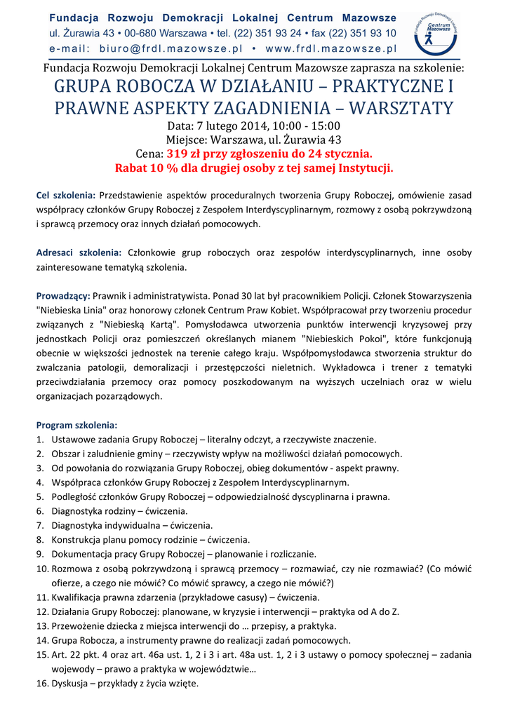 Fundacja Rozwoju Demokracji Lokalnej Centrum Mazowsze zaprasza na szkolenie: GRUPA ROBOCZA W DZIAŁANIU – PRAKTYCZNE I PRAWNE ASPEKTY ZAGADNIENIA – WARSZTATY Data: 7 lutego 2014, 10:00 - 15:00 Miejsce: Warszawa, ul. Żurawia 43 Cena: 319 zł przy zgłoszeniu do 24 stycznia. Rabat 10 % dla drugiej osoby z tej samej Instytucji. Cel szkolenia: Przedstawienie aspektów proceduralnych tworzenia Grupy Roboczej, omówienie zasad współpracy członków Grupy Roboczej z Zespołem Interdyscyplinarnym, rozmowy z osobą pokrzywdzoną i sprawcą przemocy oraz innych działań pomocowych. Adresaci szkolenia: Członkowie grup roboczych oraz zespołów interdyscyplinarnych, inne osoby zainteresowane tematyką szkolenia. Prowadzący: Prawnik i administratywista. Ponad 30 lat był pracownikiem Policji. Członek Stowarzyszenia "Niebieska Linia" oraz honorowy członek Centrum Praw Kobiet. Współpracował przy tworzeniu procedur związanych z "Niebieską Kartą". Pomysłodawca utworzenia punktów interwencji kryzysowej przy jednostkach Policji oraz pomieszczeń określanych mianem "Niebieskich Pokoi", które funkcjonują obecnie w większości jednostek na terenie całego kraju. Współpomysłodawca stworzenia struktur do zwalczania patologii, demoralizacji i przestępczości nieletnich. Wykładowca i trener z tematyki przeciwdziałania przemocy oraz pomocy poszkodowanym na wyższych uczelniach oraz w wielu organizacjach pozarządowych. Program szkolenia: 1. Ustawowe zadania Grupy Roboczej – literalny odczyt, a rzeczywiste znaczenie. 2. Obszar i zaludnienie gminy – rzeczywisty wpływ na możliwości działań pomocowych. 3. Od powołania do rozwiązania Grupy Roboczej, obieg dokumentów - aspekt prawny. 4. Współpraca członków Grupy Roboczej z Zespołem Interdyscyplinarnym. 5. Podległość członków Grupy Roboczej – odpowiedzialność dyscyplinarna i prawna. 6. Diagnostyka rodziny – ćwiczenia. 7. Diagnostyka indywidualna – ćwiczenia. 8. Konstrukcja planu pomocy rodzinie – ćwiczenia. 9. Dokumentacja pracy Grupy Roboczej – planowanie i rozliczanie. 10. Rozmowa z osobą pokrzywdzoną i sprawcą przemocy – rozmawiać, czy nie rozmawiać? (Co mówić ofierze, a czego nie mówić? Co mówić sprawcy, a czego nie mówić?) 11. Kwalifikacja prawna zdarzenia (przykładowe casusy) – ćwiczenia. 12. Działania Grupy Roboczej: planowane, w kryzysie i interwencji – praktyka od A do Z. 13. Przewożenie dziecka z miejsca interwencji do … przepisy, a praktyka. 14. Grupa Robocza, a instrumenty prawne do realizacji zadań pomocowych. 15. Art. 22 pkt. 4 oraz art. 46a ust. 1, 2 i 3 i art. 48a ust. 1, 2 i 3 ustawy o pomocy społecznej – zadania wojewody – prawo a praktyka w województwie… 16. Dyskusja – przykłady z życia wzięte. ZGŁOSZENIE GRUPA ROBOCZA W DZIAŁANIU – PRAKTYCZNE I PRAWNE ASPEKTY ZAGADNIENIA – WARSZTATY Data: 7 lutego 2014, 10:00 - 15:00 Miejsce: Warszawa, ul. Żurawia 43 Cena: 319 zł przy zgłoszeniu do 24 stycznia. Rabat 10 % dla drugiej osoby z tej samej Instytucji. Instytucja: ........................................................................................................................... Adres: ................................................................................................................................. NIP: ..................................................................................................................................... L.p. Imię i nazwisko Wydział tel. e-mail 1.......................................................................................................................................... 2.......................................................................................................................................... 3.......................................................................................................................................... ........................................................... podpis i pieczątka osoby delegującej Zgłoszenie na szkolenie Zgłoszenia prosimy przesyłać do 31 stycznia 2014 r. fax: (22) 351 93 10, e-mail: [email protected] lub wybrać opcje zapisu przez stronę www.frdl.mazowsze.pl Przy zgłoszeniu w ramach Forów prosimy o wpisanie w uwagach: „Zgłoszenie w ramach Forum (nazwa odpowiedniego Forum)”. Ewentualną rezygnację ze szkolenia można zgłosić najpóźniej na dwa dni przed szkoleniem. W przypadku niewykorzystania zgłoszonego uczestnictwa - Urząd będzie zobowiązany do sfinansowania 60% odpłatności za uczestnictwo i materiały. FRDL zastrzega sobie prawo odwołania szkolenia. Miejsce szkolenia: Warszawa, ul. Żurawia 43, Sala Konferencyjna FRDL. Lokalizacja 300 metrów od Metra Centrum. Cena: 319 zł netto przy zgłoszeniu do 24 stycznia. Cena po 24 stycznia to 369 zł. Rabat 10 % dla drugiej osoby z tej samej Instytucji. Zwolnienie z VAT w przypadku finansowania ze środków publicznych. W cenie materiały szkoleniowe, zaświadczenie, lunch oraz przerwy kawowe. Płatność przelewem, na podstawie faktury wystawionej w dniu szkolenia.
