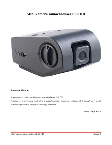 Mini kamera samochodowa Full HD Szanowny Kliencie, dziękujemy za zakup mini kamery samochodowej Full HD. Prosimy o przeczytanie instrukcji i przestrzeganie podanych wskazówek i porad, aby mogli Państwo optymalnie korzystać z nowego produktu. Pearl24 Sp. z o. o. Mini kamera samochodowa Full HD Strona 1 Zawartość zestawu: • Kamera samochodowa • Adapter do zapalniczki samochodowej • Kabel samochodowy 3,5 m • Kabel USB • Płyta CD • 2 nakładki samoprzylepne • Instrukcja obsługi. Dodatkowo potrzebna karta micro SD. Mini kamera samochodowa Full HD Strona 2 Szczegóły produktu 1. Przycisk ON / OFF: włączanie i wyłączanie urządzenia 2. Przycisk blokady (funkcja SOS): należy nacisnąć ten przycisk, aby zapisać bieżące nagranie 3. Wyzwalacz: należy nacisnąć ten przycisk, aby wykonać zdjęcie 4. REC: należy nacisnąć przycisk REC, aby nagrać film. Naciśnij przycisk ponownie, aby zatrzymać nagrywanie 5. Obiektyw 6. Port USB 7. LED 8. Uchwyt z samoprzylepną folią 9. Mikrofon 10. Przycisk reset: należy nacisnąć przycisk reset, aby ponownie uruchomić urządzenie 11. Gniazdo na kartę pamięci micro SD Mini kamera samochodowa Full HD Strona 3 Montaż w samochodzie Używając dołączonego do zestawu kabla można podłączyć kamerę samochodową do akumulatora samochodowego. Kabel zakończony jest czerwonym i czarnym przewodem. Czerwony przewód (plus) należy podłączyć do połączenia ACC, wtedy kamera będzie zasilania po włączeniu zapłonu. Czarny kabel (minus) musi być uziemiony. WSKAZÓWKA Zaleca się podłączenie kamery przez osobę wyspecjalizowaną. Funkcje specjalne 1. G-sensor: przy przyspieszeniu 6 g (1 g = 9,8 m / s), kamera automatycznie zapisuje bieżący plik wideo z blokadą zapobiegającą przypadkowemu usunięciu. 2. Automatyczne włączanie / wyłączanie: po uruchomieniu lub wyłączeniu silnika samochodu, kamera automatycznie włącza lub wyłącza się. 3. SOS: należy nacisnąć przycisk blokady, aby zapisać bieżące nagranie. 4. Ciągłe nagrywanie wideo Mini kamera samochodowa Full HD Strona 4 Uruchomienie 1. Najpierw należy zdjąć folię ochronną znajdującą się z tyłu urządzenia. Kamerę należy przymocować na przedniej szybie samochodu. 2. Kamerę należy podłączyć do gniazda zapalniczki samochodu za pomocą kabla. 3. Kamera włączy się automatycznie po uruchomieniu silnika. Będzie świecić się czerwona dioda LED. 4. Należy nacisnąć i przytrzymać przycisk włączania / wyłączania, aby wyłączyć urządzenie. Nagrywanie wideo i wykonywanie zdjęć Włączanie / wyłączanie zasilania: należy nacisnąć i przytrzymać przycisk ON / OFF przez kilka sekund, aby włączyć urządzenie. Świeci się czerwona dioda LED. Aby wyłączyć kamerę należy nacisnąć i przytrzymać przycisk ON / OFF. Dioda LED zgaśnie. Nagrywanie wideo: należy nacisnąć przycisk REC, aby nagrać film. Zdjęcie: należy nacisnąć przycisk migawki, aby wykonać zdjęcie. Następnie kamera nagrywa wideo. Synchronizacja daty i czasu Kamerę należy podłączyć za pomocą kabla USB do komputera. Plik „Time (4)” należy skopiować na kartę micro SD. Teraz można zmienić datę i czas, i zapisać wprowadzone dane. Nazwę pliku należy zmienić na „Time”. Uwaga: datę można zmienić tylko na karcie pamięci micro SD, a nie w menu kamery. Mini kamera samochodowa Full HD Strona 5 Bezpieczeństwo • Niniejsza instrukcja ma na celu zapoznanie Państwa z zasadami prawidłowego korzystania z produktu. Zaleca się przechowywanie instrukcji w łatwo dostępnym miejscu, aby w razie potrzeby mogli Państwo zweryfikować informacje. • Wszelkie modyfikacje produktu obniżają poziom jego bezpieczeństwa. UWAGA! Istnieje ryzyko obrażeń! • Nie należy rozkładać ani naprawiać urządzenia samodzielnie! • Zaleca się ostrożne obchodzenie się z produktem. Produkt może ulec uszkodzeniu w wyniku uderzenia, wstrząsów lub upadku nawet z niewielkiej wysokości. • Produkt należy trzymać z dala od wilgoci i wysokiej temperatury. • Nie należy zanurzać urządzenia w wodzie oraz innych płynach. • Wszelkie prawa do wprowadzania zmian technicznych oraz eliminacji błędów są zastrzeżone. Ważne wskazówki dotyczące utylizacji Urządzenia elektrycznego nie zalicza się do odpadów gospodarstwa domowego. W celu właściwej utylizacji urządzenia należy skontaktować się z organizacją odpowiedzialną za zbiórkę elektroodpadów w wybranej miejscowości. Deklaracja zgodności PEARL.GmbH oświadcza, że produkt NX-4123 jest zgodny z dyrektywą EMV 2004/108/EG i dyrektywą RoHS 2011/65/EU. Mini kamera samochodowa Full HD Strona 6 Dane techniczne • Funkcje: kamera HD; nagrywanie wideo • G-Sensor: automatyczna funkcja awaryjna. Nagrywanie wideo przy wysokim przyspieszeniu (np. podczas wypadku). Nie można usunąć takiego pliku. • Kamera: 100 A + wysokiej rozdzielczości szerokokątny obiektyw • Format pliku: AVI • Rozdzielczość: 1080p • Format pliku wideo: AVI • Kolor: standardowy • Ciągłe nagrywanie: ciągłe nagrywanie wideo; bez opóźnienia pomiędzy ujęciami • Automatyczne ON/OFF: urządzenie włącza się po uruchomieniu silnika i wyłącza się, gdy silnik jest wyłączony • Synchronizacja daty/czasu: RR / MM / DD / min / sek. • Nośnik danych: karta pamięci • Tryb zdjęć: 12 MP • Format obrazu: JPEG • Karta pamięci: micro SD (max. 32 GB) • Mikrofon: tak • Odtwarzanie stereo: tak • Nocne widzenie: tak • Format wideo: PAL / NTSC • Zakres częstotliwości: 50 Hz / 60 Hz • Funkcja USB: 1 – USB Disk; 2 – Kamera PC • Napięcie: 5 V / 600 mA • Akumulator: 300 mAh. Mini kamera samochodowa Full HD Strona 7 ROZWIĄZYWANIE PROBLEMÓW 1. Urządzenie nie nagrywa filmów i nie robi zdjęć – należy sprawdzić czy karta pamięci jest prawidłowo włożona. 2. Nagrywanie jest przerywane – należy użyć kompatybilnej karty SDHC, ponieważ nagania HD wymagają dużej 