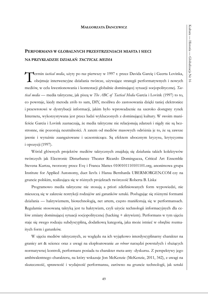 PERFORMANS W GLOBALNYCH PRZESTRZENIACH MIASTA I SIECI NA PRZYKŁADZIE DZIAŁAŃ TACTICAL MEDIA T ermin tactical media, użyty po raz pierwszy w 1997 r. przez Davida Garcię i Geerta Lovinka, obejmuje interwencyjne działania twórcze, używające strategii performatywnych i nowych mediów, w celu kwestionowania i kontestacji globalnie dominującej sytuacji socjopolitycznej. Tactical media — media taktyczne, jak piszą w The ABC of Tactical Media Garcia i Lovink (1997) to to, co powstaje, kiedy metoda zrób to sam, DIY, możliwa do zastosowania dzięki taniej elektronice i przewrotowi w dystrybucji informacji, jakim było wprowadzenie na szeroko dostępny rynek Internetu, wykorzystywana jest przez ludzi wykluczonych z dominującej kultury. W swoim manifeście Garcia i Lovink zaznaczają, że media taktyczne nie relacjonują zdarzeń i nigdy nie są bezstronne, nie pozorują neutralności. A zatem od mediów masowych odróżnia je to, że są zawsze jawnie i wyraźnie zaangażowane i uczestniczące. Są efektem ubocznym kryzysu, krytycyzmu i opozycji (1997). Wśród głównych projektów mediów taktycznych znajdują się działania takich kolektywów twórczych jak Electronic Disturbance Theater Ricardo Domingueza, Critical Art Ensemble Stevena Kurtza, tworzony przez Evę i Franca Mattes 0100101110101101.org, anonimowa grupa Institute for Applied Autonomy, duet lizvlx i Hansa Bernharda UBERMORGEN.COM czy na gruncie polskim, realizująca się w różnych projektach twórczość Roberta B. Liska. Programowo media taktyczne nie stosują a priori zdefiniowanych form wypowiedzi, nie mieszczą się w zakresie restrykcji rodzajów ani gatunków sztuki. Posługując się różnymi formami działania — haktywizmem, biotechnologią, net artem, często manifestują się w performansach. Regularnie stosowaną taktyką jest tu haktywizm, czyli użycie technologii informacyjnych dla celów zmiany dominującej sytuacji socjopolitycznej (hacking + aktywizm). Performans w tym ujęciu staje się swego rodzaju subdyscypliną, dodatkową kategorią, jaka może istnieć w obrębie rozmaitych form i gatunków. W ujęciu mediów taktycznych, ze względu na ich wyjątkowo interdyscyplinarny charakter na granicy art & science oraz z uwagi na eksploatowanie au rebour narzędzi powstałych i służących normatywnej kontroli, performans posiada tu charakter meta-anty -dyskursu. Z perspektywy jego ambiwalentnego charakteru, na który wskazuje Jon McKenzie (McKenzie, 2011, 342), z uwagi na skuteczność, sprawność i wydajność performansu, zarówno na gruncie technologii, jak sztuki 49 Kultura — Historia — Globalizacja Nr 16 MAŁGORZATA DANCEWICZ Małgorzata Dancewicz, Performans w globalnych przestrzeniach miasta i sieci na przykładzie działań tactical media i nauki, w tym nauk społecznych, może on być zarówno narzędziem umożliwiającym dyktat kultury autorytarnej, jak i strategią subwersywną w stosunku do tejże kultury. Może być i jest jednym i drugim jednocześnie. Ten ambiwalentny charakter szczególnie widoczny staje się właśnie w przypadku tactical media, gdzie wydajność technologii i subwersywność taktyki współistnieją w niebezpiecznym związku globalnych oddziaływań i implikacji. Garcia i Lovink wskazując na źródła mediów taktycznych przywołują koncepcje Michela De Certeau (De Certeau, 2008), który rozdzielił działania kultury codziennej na oficjalne, zorganizowane i służące utrzymaniu kontroli strategie oraz stosowane potajemnie, rozproszone i opozycyjne taktyki. Jak podkreślają w The ABC of Tactical Media autorzy taktycznego manifestu, De Certeau analizował kulturę nie jako domenę tekstów i artefaktów, ale jako zbiór praktyk lub działań wykonywanych/performowanych na tekstualnych strukturach — a set of practices or operations performed on textual or text like structures (Garcia, Lovink, 1997). Media taktyczne, jak piszą Garcia i Lovink, nigdy nie są doskonałe, są zawsze płynne, zaangażowane, performatywne i pragmatyczne (Garcia, Lovink, 1997). Zatem dwa wykładniki, techniczna sprawność i skuteczność, którą akcentował McKenzie oraz aktywność, zmienność i pragmatyczność, którą przywołują za De Certeau Garcia i Lovink wskazują na właściwość ujęcia tactical media w kategorii performatywności. W przypadku tez McKenziego, performans technologiczny posiada charakter zarówno taktyczny, jak i strategiczny. W przypadku De Certeau wyłącznie taktyczny. Oba ujęcia nie wykluczają się wzajemnie, ale raczej są z jednej strony przejściem od normatywnego wykorzystania technologii medialnych do ich anarchistycznego zaprzeczenia, z drugiej wskazują na ambiwalentny charakter zarówno performansu, jak i samych mediów taktycznych. Sprawność i skuteczność performansu taktycznego to jego techniczne warunki możliwe do zaistnienia i ujawnienia jedynie we współczesnych warunkach sieci lub metropolii. Tu, gdzie aktualnie zachodzące zmiany ukrywają się przed masami i wydobywane zostają w subwersywnym procesie twórczym. W Dzieleniu postrzegalnego Jacques Rancière (2008) określa estetykę, jako tryb artykulacji związków między sposobami działania, formami widzialności tego działania i sposobami, w jaki dają się pomyśleć ich współzależności. Estetyka ujęta jest tu jako reżim tożsamości sztuki i refleksji nad nią (Rancière, 2008, 67). Paralelnie można by określić estetykę mediów taktycznych jako reżim tożsamości kultury autorytarnej i refleksji nad nią, manifestujący się poprzez subwersywne strategie performatywne, zastosowane w globalnych obszarach sieci oraz w strukturach miast, a zwłaszcza metropolii. 50 Electronic Disturbance Theater jest grupą cyberaktywistów, która powołana została w celu rozpowszechniania w teorii i praktyce rozmaitych form elektronicznego obywatelskiego nieposłuszeństwa (Electronic Disturbance Theater, 1998). Założona w kwietniu 1998 roku przez lidera grupy Ric
