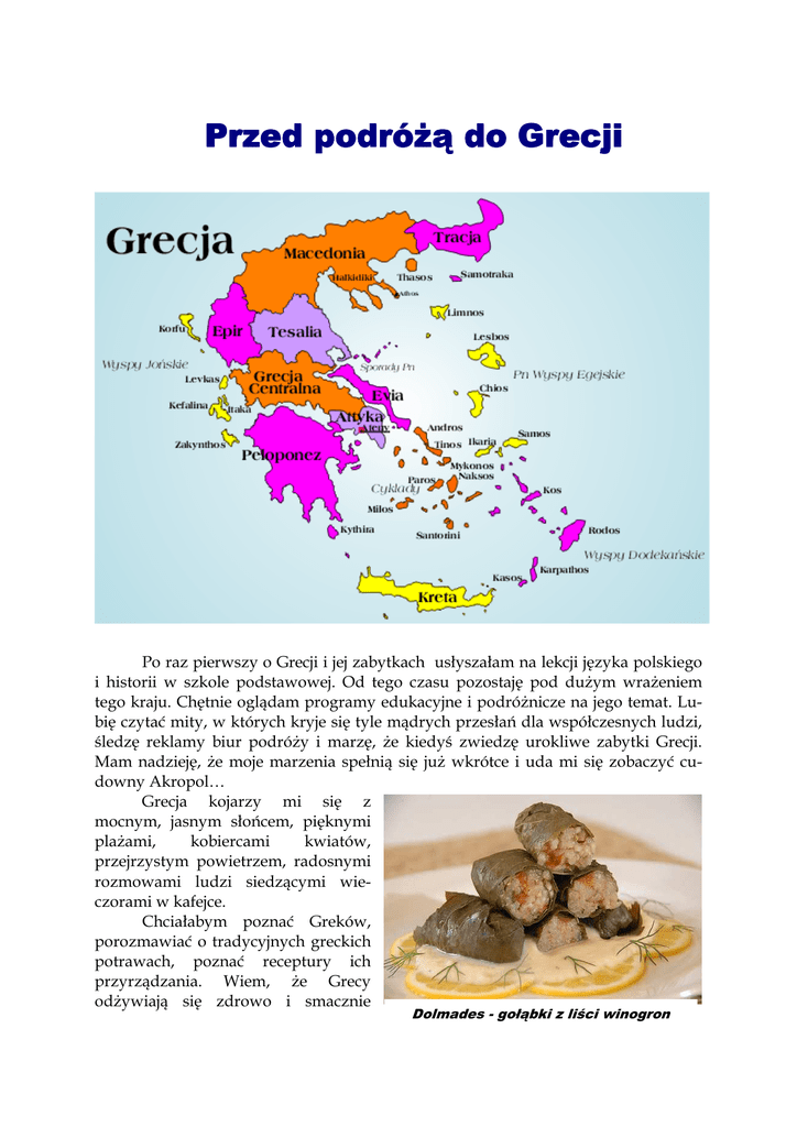 Przed podróŜą do Gre Grecji Po raz pierwszy o Grecji i jej zabytkach usłyszałam na lekcji języka polskiego i historii w szkole podstawowej. Od tego czasu pozostaję pod duŜym wraŜeniem tego kraju. Chętnie oglądam programy edukacyjne i podróŜnicze na jego temat. Lubię czytać mity, w których kryje się tyle mądrych przesłań dla współczesnych ludzi, śledzę reklamy biur podróŜy i marzę, Ŝe kiedyś zwiedzę urokliwe zabytki Grecji. Mam nadzieję, Ŝe moje marzenia spełnią się juŜ wkrótce i uda mi się zobaczyć cudowny Akropol… Grecja kojarzy mi się z mocnym, jasnym słońcem, pięknymi plaŜami, kobiercami kwiatów, przejrzystym powietrzem, radosnymi rozmowami ludzi siedzącymi wieczorami w kafejce. Chciałabym poznać Greków, porozmawiać o tradycyjnych greckich potrawach, poznać receptury ich przyrządzania. Wiem, Ŝe Grecy odŜywiają się zdrowo i smacznie Dolmades - gołąbki z liści winogron zarazem, a ja jestem wielkim smakoszem. Wyjazd w ramach projektu COMENIUS będzie równieŜ dla mnie okazją do poznania moich greckich rówieśników. Jestem ciekawa, czy znajdziemy wspólne tematy do rozmowy. Mam nadzieję, Ŝe tak jak my tu w Polsce, tak oni w Grecji narzekają na szkołę, bez której przecieŜ nie da się Ŝyć. Myślę, Ŝe wycieczka do Grecji będzie podróŜą mojego Ŝycia. Zaopatrzona w zdobyte wiadomości i zakupione przewodniki, poszerzę swą wiedzę o świecie i nabędę nowe i ciekawe doświadczenia. Do wyjazdu motywuje nie tylko pasja wzbogacania wiedzy o świecie, ale równieŜ chęć poznania ludzi, ich zwyczajów, języka, kultury, sposobu Ŝycia. Pragnę zrozumieć, co nas łączy, ale równieŜ i co dzieli. Katarzyna Długo czekałam na mój wyjazd za granicę z programu COMENIUS i wreszcie jest. Oczywiście ogromnie się z tego powodu cieszę. Po pierwsze, spędzę tydzień z młodzieŜą z innych krajów, z którą porozumiewać będę się mogła tylko w języku angielskim. Myślę, Ŝe będzie to dla mnie bardzo ciekawe i interesujące doświadczenie, zwłaszcza Ŝe język angielski bardzo lubię i chętnie go podszkolę. Kolejnym wspaniałym przeŜyciem będzie moŜliwość poznania Grecji. Oczywiście, słyszałam bardzo duŜo ciekawych rzeczy o tym kraju. Jego korzenie tkwią w staroŜytności, co oznacza, Ŝe na jego terenie znajduje się wiele pięknych i starych zabytków. Szczyci się bardzo bogatą i ciekawą historię. Jest połoŜone nad Morzem Śródziemnym i ma bardzo ciepły klimat. Grecja – kraj nad Morzem Śródziemnym o tradycji sięgającej staroŜytności Cieszę się, Ŝe, gdy tu w Polsce będzie zimno i deszczowo, będę mogła korzystać z upalnego słońca, przedłuŜając sobie lato. Mam teŜ nadzieję, Ŝe zdołam wrócić opalona;)) Dzięki swemu wyjazdowi poznam wielu nowych ludzi, zresztą nie tylko z Grecji, i chętnie zapoznam się z ich kulturą, zwyczajami i tradycją. Myślę teŜ, Ŝe będę mogła się z nimi zaprzyjaźnić. Wyjazd do Grecji będzie dla mnie niesamowitym wydarzeniem i mam nadzieję, Ŝe nigdy go nie zapomnę;)) Kasia JuŜ wkrótce w ramach realizowanego przez szkołę projektu COMENIUS wyruszę w tygodniową podróŜ do Grecji – do Salonik. Saloniki, drugie pod względem wielkości miasto w Grecji UwaŜam, Ŝe ten wyjazd to wspaniała wycieczka, dzięki której będę mogła poznać tradycję innego kraju. Będę miała takŜe okazję doskonalić język angielski, którym mamy posługiwać się z innymi uczestnikami spotkania w Salonikach. Chcę zawrzeć nowe przyjaźnie z rówieśnikami z innych szkół europejskich. Mam nadzieję, Ŝe nawet po odjeździe będziemy utrzymywać ze sobą kontakt. Ta wycieczka jest dla nas wszystkich bardzo waŜna, poniewaŜ otwiera nam oczy na świat i kształtuje naszą wyobraźnię. Dzięki wyjazdowi do Grecji poznam wielu ciekawych ludzi i zobaczę świat z innej perspektywy. Program COMENIUS spełni moje najskrytsze marzenie. Sądzę, Ŝe Grecja to kraj, którym warto się zainteresować. Jest tam wiele zabytków do obejrzenia. W czasie pobytu bardzo chciałabym zwiedzić Białą WieŜę, poniewaŜ słyszałam, Ŝe to najwspanialszy zabytek w Salonikach, a z jej szczytu widać całe miasto. Natalia Natalia Saloniki - Biała WieŜa, pozostałość murów obronnych z czasów bizantyjskich i tureckich Jak traktuję wycieczkę do Grecji? Jako wyjazd edukacyjny, krajoznawczy czy moŜe chęć zaspokojenia ciekawości świata? Myślę, Ŝe wszystkie określenia są dobre. Ale najlepiej pasuje „wyjazd edukacyjny”, gdyŜ COMENIUS to edukacja między krajami Europy, to poznawanie świata poprzez naukę, to nowe znajomości, nowi koledzy, ale przede wszystkim to radość podróŜowania. KaŜdy cieszy się, gdy pozna jakiś kraj. Wróciwszy znowu do domu, wszystkim opowiada, jak było. Tak zapewne zrobił mój kolega Mircea Dragan, gdy w ubiegłym roku powrócił z Polski do Hiszpanii. Nie chcę być od niego gorszy. Edukacja jest bardzo waŜna, więc przede wszystkim weźmy sobie ten aspekt podróŜowania pod uwagę. Krajoznawstwo i ciekawość świata nie odgrywają tak wielkiej roli jak edukacja, ale w duŜym stopniu są waŜnymi cechami w poznaniu i doświadczeniu tego, co nas tam czeka. MoŜe ktoś sobie myśli, Ŝe my to mamy dobrze. O nie, to tylko pozory. W szkole moŜe tego tak nie widać ale w domu musimy długo uczyć się języka angielskiego, rozmówek angielskich. Nawet najlepszy uczeń czy nawet anglista musi długo się przygotowywać do takiego wyjazdu. Od dawna chciałem pojechać do Grecji, pooglądać trochę świat. Jak widać, marzenia czasem się spełniają. Myślę, Ŝe niejeden człowiek pragnie zwiedzać inne kraje, inne otoczenie. COMENIUS pozwala nam na zwiedzanie wielu miast w całej Europie. Zawsze nurtowało mnie jedno pytanie: Jak jest gdzieindziej? Niedługo juŜ poznam odpowiedź. Kiedyś dziadek opowiadał mi o swoim pobycie we Francji. Tak zaciekawiło mnie jego opowiadanie, Ŝe sam chciałem zobaczyć