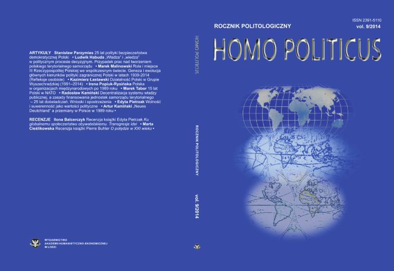 Akademia Humanistyczno-Ekonomiczna w £odzi Redaktor naczelny: prof. dr hab. Stanis³aw Parzymies Redakcja tematyczna: dr Rados³aw Kamiñski (sekretarz), dr Edyta Pietrzak Rada programowa prof. dr hab. Zbigniew Rau (U£) prof. dr hab. Stanis³aw Sulowski (UW, AHE) prof. dr hab. Konstanty Adam Wojtaszczyk (UW) prof. dr hab. Marek ¯migrodzki (UMCS Lublin) prof. dr hab. Arkadiusz ¯ukowski (UWM Olsztyn) prof. dr hab. Katarzyna ¯ukrowska (SGH) dr hab. prof. WAT Janusz Œwiniarski (WAT) Redaktor odpowiedzialny za vol. 9/2014 dr Rados³aw Kamiñski Recenzenci prof. DSW, dr hab. Tomasz Balbus Dolnoœl¹ska Szko³a Wy¿sza prof. UG, dr hab. Piotr Niwiñski Uniwersytet Gdañski Redakcja czasopisma „Homo Politicus” Akademia Humanistyczno-Ekonomiczna w £odzi 90-212 £ódŸ, ul. Sterlinga 26 tel. 0-42 63 15 070 © Copyright by Akademia Humanistyczno-Ekonomiczna w £odzi £ódŸ 2014 ISSN 1896-1770 (wersja drukowana jest wersj¹ pierwotn¹) Wersja elektroniczna e-ISSN 2391-5110 (numery stron zgodne z wersj¹ drukowan¹) Sk³ad DTP Iwona C³apiñska Wydawnictwo Akademii Humanistyczno-Ekonomicznej w £odzi 90-212 £ódŸ, ul. Sterlinga 26 tel./fax +42 63 15 908 [email protected] www.wydawnictwo.ahe.lodz.pl Spis treści Stanisław Parzymies 25 lat polityki bezpieczeństwa demokratycznej Polski........................................................ 5 Ludwik Habuda „Władza” i „wiedza” w politycznym procesie decyzyjnym. Przypadek prac nad tworzeniem polskiego samorządu terytorialnego.......................... 15 Marek J. Malinowski Rola i miejsce III Rzeczypospolitej Polskiej we współczesnym świecie. Geneza i ewolucja głównych kierunków polityki zagranicznej Polski w latach 1939–2014 (refleksje osobiste)................................................................................. 31 Kazimierz Łastawski Działalność Polski w Grupie Wyszehradzkiej (1991–2014)............................................... 45 Irena Popiuk-Rysińska Polska w organizacjach międzynarodowych po 1989 r. ..................................................... 59 Marek Tabor 15 lat Polski w NATO....................................................................................................................... 79 Radosław Kamiński Decentralizacja systemu władzy publicznej a zasady finansowania jednostek samorządu terytorialnego w Polsce – 25 lat doświadczeń. Wnioski i spostrzeżenia.................................................................................................................. 103 Edyta Pietrzak Wolność i suwerenność jako wartości polityczne.................................................................. 115 Artur Kamiński „Neues Deutschland” a przemiany w Polsce w 1989 r........................................................ 125 Ilona Balcerczyk Recenzja książki Edyty Pietrzak Ku globalnemu społeczeństwu obywatelskiemu. Transgresje idei................................................................................................................................. 141 Marta Cieślikowska Recenzja książki Pierre’a Buhlera O potędze w XXI wieku................................................. 145 Homo Politicus vol. 9/2014 Stanisław Parzymies Akademia Finansów i Biznesu Vistula 25 lat polityki bezpieczeństwa demokratycznej Polski1 Agresja Federacji Rosyjskiej przeciwko Ukrainie i przyłączenie do Rosji części Ukrainy, jaką jest Krym, wywołała zaniepokojenie w Polsce i w innych krajach sąsiadujących z Rosją. Społeczność międzynarodowa mogła oczekiwać, że ćwierć wieku po zakończeniu zimnej wojny nie znajdzie się żadne mocarstwo, które ośmieli się tak wyraźnie pogwałcić podstawowe zasady prawa międzynarodowego publicznego. Takie pogwałcenie może bowiem pociągnąć za sobą paraliż porządku europejskiego i globalnego, który wydawał się trwały. Adam Michnik, redaktor naczelny „Gazety Wyborczej”, napisał w artykule wstępnym, zatytułowanym Nie wolno się cofać, że „Kreml Putina pcha Europę w stronę odbudowy agresywnego imperium (…) gdzie rządzić mają przemoc i kłamstwo”. Przyzwolenie dla Putina – kontynuował A. Michnik – nie skończy się na Krymie (…). Bierność Zachodu będzie oznaczała zwycięstwo ducha Monachium z 1938 r. i Jałty z 1945 r.” („Gazeta Wyborcza”, 17.04.2014, s. 1). W 2012 r. Federacja Rosyjska zwiększyła o 25% swój budżet obronny, który przekracza już budżet obronny Francji. Do 2020 r. Rosja wyda na nowoczesne uzbrojenie odpowiednik 515 miliardów euro. Dla prezydenta Rosji modernizacja armii stała się narodowym priorytetem (L’OTAN teste sa force de réaction rapide près de la Russie, 2013). Federacja Rosyjska w swej doktrynie obronnej uważa NATO za potencjalnego przeciwnika. Nasyca bronią Okręg Kaliningradzki i organizuje regularnie manewry „Zapad”. Groźba rozmieszczenia rakiet Iskander w regionie Kaliningradu, dotychczas niezrealizowana, stanowi element szantażu. W zbliżonej wersji artykuł ukazał się we francuskim kwartalniku „Questions Internationales”, nr 69/2014. 1 6 Stanisław Parzymies Potencjał obronny Polski i jej rola we współpracy międzynarodowej w dziedzinie bezpieczeństwa W tej sytuacji Polska dokonuje oceny swych środków bezpieczeństwa i możliwości obronnych wynikających ze współpracy międzynarodowej w dziedzinie bezpieczeństwa. Polska jako największy kraj w Europie Środkowej zarówno pod względem terytorialnym, jak i demograficznym opiera swoje bezpieczeństwo na kilku filarach, jakimi są: własny potencjał obronny, członkostwo w Sojuszu Północnoatlantyckim i w Unii Europejskiej z ich zdolnościami obronnymi oraz jej współpraca bilateralna, zwłaszcza ze Stanami Zjednoczonymi. Polska posiada armię liczącą 96 000 osób, szóstą w Unii Europejskiej i ósmą w Sojuszu Północnoatlantyckim. Polska poświęca 1,95% swego PKB na obronę i pod tym względem znajduje się wśród pierwszych pięciu k