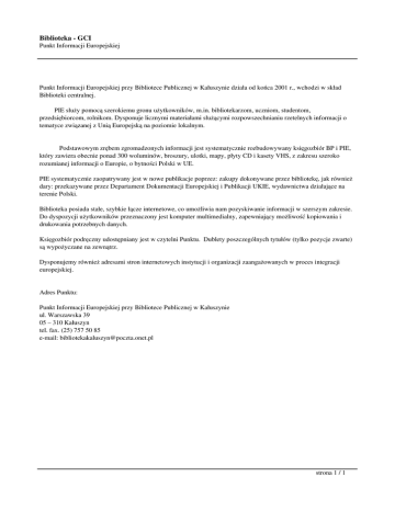 Biblioteka - GCI Punkt Informacji Europejskiej Punkt Informacji Europejskiej przy Bibliotece Publicznej w Kałuszynie działa od końca 2001 r., wchodzi w skład Biblioteki centralnej. PIE służy pomocą szerokiemu gronu użytkowników, m.in. bibliotekarzom, uczniom, studentom, przedsiębiorcom, rolnikom. Dysponuje licznymi materiałami służącymi rozpowszechnianiu rzetelnych informacji o tematyce związanej z Unią Europejską na poziomie lokalnym. Podstawowym zrębem zgromadzonych informacji jest systematycznie rozbudowywany księgozbiór BP i PIE, który zawiera obecnie ponad 300 woluminów, broszury, ulotki, mapy, płyty CD i kasety VHS, z zakresu szeroko rozumianej informacji o Europie, o bytności Polski w UE. PIE systematycznie zaopatrywany jest w nowe publikacje poprzez: zakupy dokonywane przez bibliotekę, jak również dary: przekazywane przez Departament Dokumentacji Europejskiej i Publikacji UKIE, wydawnictwa działające na terenie Polski. Biblioteka posiada stałe, szybkie łącze internetowe, co umożliwia nam pozyskiwanie informacji w szerszym zakresie. Do dyspozycji użytkowników przeznaczony jest komputer multimedialny, zapewniający możliwość kopiowania i drukowania potrzebnych danych. Księgozbiór podręczny udostępniany jest w czytelni Punktu. Dublety poszczególnych tytułów (tylko pozycje zwarte) są wypożyczane na zewnątrz. Dysponujemy również adresami stron internetowych instytucji i organizacji zaangażowanych w proces integracji europejskiej. Adres Punktu: Punkt Informacji Europejskiej przy Bibliotece Publicznej w Kałuszynie ul. Warszawska 39 05 – 310 Kałuszyn tel. fax. (25) 757 50 85 e-mail: [email protected] strona 1 / 1