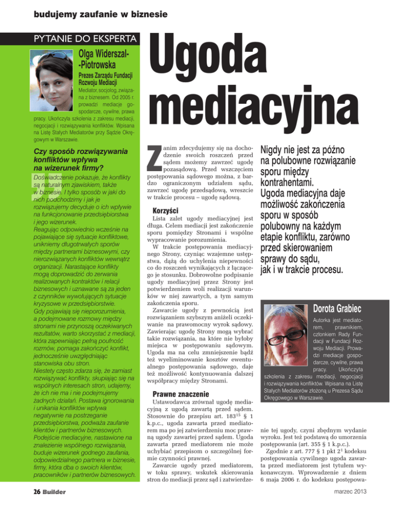budujemy zaufanie w biznesie PYTANIE DO EKSPERTA Olga Widerszal-Piotrowska Prezes Zarządu Fundacji Rozwoju Mediacji Mediator, socjolog, związana z biznesem. Od 2005 r. prowadzi mediacje gospodarcze, cywilne, prawa pracy. Ukończyła szkolenia z zakresu mediacji, negocjacji i rozwiązywania konfliktów. Wpisana na Listę Stałych Mediatorów przy Sądzie Okręgowym w Warszawie. Czy sposób rozwiązywania konfliktów wpływa na wizerunek firmy? Doświadczenie pokazuje, że konflikty są naturalnym zjawiskiem, także w biznesie. I tylko sposób w jaki do nich podchodzimy i jak je rozwiązujemy decyduje o ich wpływie na funkcjonowanie przedsiębiorstwa i jego wizerunek. Reagując odpowiednio wcześnie na pojawiające się sytuacje konfliktowe, unikniemy długotrwałych sporów między partnerami biznesowymi, czy nierozwiązanych konfliktów wewnątrz organizacji. Narastające konflikty mogą doprowadzić do zerwania realizowanych kontraktów i relacji biznesowych i uznawane są za jeden z czynników wywołujących sytuacje kryzysowe w przedsiębiorstwie. Gdy pojawiają się nieporozumienia, a podejmowane rozmowy między stronami nie przynoszą oczekiwanych rezultatów, warto skorzystać z mediacji, która zapewniając pełną poufność rozmów, pomaga zakończyć konflikt, jednocześnie uwzględniając stanowiska obu stron. Niestety często zdarza się, że zamiast rozwiązywać konflikty, skupiając się na wspólnych interesach stron, udajemy, że ich nie ma i nie podejmujemy żadnych działań. Postawa ignorowania i unikania konfliktów wpływa negatywnie na postrzeganie przedsiębiorstwa, podważa zaufanie klientów i partnerów biznesowych. Podejście mediacyjne, nastawione na znalezienie wspólnego rozwiązania, buduje wizerunek godnego zaufania, odpowiedzialnego partnera w biznesie, firmy, która dba o swoich klientów, pracowników i partnerów biznesowych. 26 Builder Ugoda mediacyjna Z anim zdecydujemy się na dochodzenie swoich roszczeń przed sądem możemy zawrzeć ugodę pozasądową. Przed wszczęciem postępowania sądowego można, z bardzo ograniczonym udziałem sądu, zawrzeć ugodę przedsądową, wreszcie w trakcie procesu – ugodę sądową. Korzyści Lista zalet ugody mediacyjnej jest długa. Celem mediacji jest zakończenie sporu pomiędzy Stronami i wspólne wypracowanie porozumienia. W trakcie postępowania mediacyjnego Strony, czyniąc wzajemne ustępstwa, dążą do uchylenia niepewności co do roszczeń wynikających z łączącego je stosunku. Dobrowolne podpisanie ugody mediacyjnej przez Strony jest potwierdzeniem woli realizacji warunków w niej zawartych, a tym samym zakończenia sporu. Zawarcie ugody z pewnością jest rozwiązaniem szybszym aniżeli oczekiwanie na prawomocny wyrok sądowy. Zawierając ugodę Strony mogą wybrać takie rozwiązania, na które nie byłoby miejsca w postępowaniu sądowym. Ugoda ma na celu zmniejszenie bądź też wyeliminowanie kosztów ewentualnego postępowania sądowego, daje też możliwość kontynuowania dalszej współpracy między Stronami. Prawne znaczenie Ustawodawca zrównał ugodę mediacyjną z ugodą zawartą przed sądem. Stosownie do przepisu art. 18315 § 1 k.p.c., ugoda zawarta przed mediatorem ma po jej zatwierdzeniu moc prawną ugody zawartej przed sądem. Ugoda zawarta przed mediatorem nie może uchybiać przepisom o szczególnej formie czynności prawnej. Zawarcie ugody przed mediatorem, w toku sprawy, wskutek skierowania stron do mediacji przez sąd i zatwierdze- Nigdy nie jest za późno na polubowne rozwiązanie sporu między kontrahentami. Ugoda mediacyjna daje możliwość zakończenia sporu w sposób polubowny na każdym etapie konfliktu, zarówno przed skierowaniem sprawy do sądu, jak i w trakcie procesu. Dorota Grabiec Autorka jest mediatorem, prawnikiem, członkiem Rady Fundacji w Fundacji Rozwoju Mediacji. Prowadzi mediacje gospodarcze, cywilne, prawa pracy. Ukończyła szkolenia z zakresu mediacji, negocjacji i rozwiązywania konfliktów. Wpisana na Listę Stałych Mediatorów złożoną u Prezesa Sądu Okręgowego w Warszawie. nie tej ugody, czyni zbędnym wydanie wyroku. Jest też podstawą do umorzenia postępowania (art. 355 § 1 k.p.c.). Zgodnie z art. 777 § 1 pkt 21 kodeksu postępowania cywilnego ugoda zawarta przed mediatorem jest tytułem wykonawczym. Wprowadzenie z dniem 6 maja 2006 r. do kodeksu postępowamarzec 2013 nia cywilnego art. 7951, spowodowało wzrost znaczenia ugody mediacyjnej. Daje on wierzycielowi możliwość wystąpienia do sądu, który zatwierdził ugodę z wnioskiem o wydanie zaświadczenia, że stanowi ona europejski tytuł egzekucyjny. Roszczenie stwierdzone ugodą zawartą przed mediatorem i zatwierdzoną przez sąd przedawnia się z upływem lat 10, chociażby termin przedawnienia roszczeń tego rodzaju był krótszy. Jeżeli stwierdzone w ten sposób roszczenie obejmuje świadczenia okresowe, roszczenie o świadczenia okresowe należne w przyszłości ulega przedawnieniu 3-letniemu (art. 125 § 1 k.c.). Protokół i ugoda mediacyjna Warunki ugody wypracowane wspólnie przez Strony podczas mediacji, a następnie spisane w formie ugody mediacyjnej i podpisane przez Strony mogą zostać załączone do protokołu z przebiegu mediacji. Ugoda zawarta przed mediatorem może też zostać zamieszczona w protokole z przebiegu mediacji. Dla skuteczności ugody zawartej przed mediatorem nie ma wpływu fakt, iż jej treść wykracza poza przedmiot postępowania sądowego. Za istotne należy uznać tylko to, czy wymienione w ugodzie ustalenia, wynikające z wzajemnych ustępstw Stron ugody mediacyjnej, są niezbędnym i koniecznym czynnikiem decydującym o zakończeniu sporu między nimi. Zatwierdzenie ugody Ugoda zawarta przez Strony przed mediatorem dla uzyskania mocy prawnej ugody sądowej wymaga zatwierdzenia przez sąd. Przez podpisanie ugody strony wyrażają zgodę na wystąpienie do sądu z wnioskiem o jej zatwierdzenie. (art. 18312 § 21 k.p.c.). Sąd niezwł