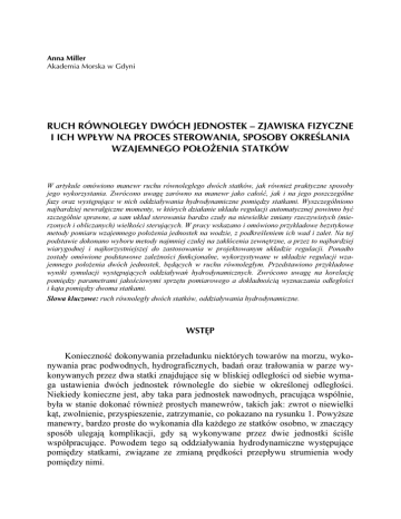 Anna Miller Akademia Morska w Gdyni RUCH RÓWNOLEGŁY DWÓCH JEDNOSTEK – ZJAWISKA FIZYCZNE I ICH WPŁYW NA PROCES STEROWANIA, SPOSOBY OKREŚLANIA WZAJEMNEGO POŁOŻENIA STATKÓW W artykule omówiono manewr ruchu równoległego dwóch statków, jak również praktyczne sposoby jego wykorzystania. Zwrócono uwagę zarówno na manewr jako całość, jak i na jego poszczególne fazy oraz występujące w nich oddziaływania hydrodynamiczne pomiędzy statkami. Wyszczególniono najbardziej newralgiczne momenty, w których działanie układu regulacji automatycznej powinno być szczególnie sprawne, a sam układ sterowania bardzo czuły na niewielkie zmiany rzeczywistych (mierzonych i obliczanych) wielkości sterujących. W pracy wskazano i omówiono przykładowe bezstykowe metody pomiaru wzajemnego położenia jednostek na wodzie, z podkreśleniem ich wad i zalet. Na tej podstawie dokonano wyboru metody najmniej czułej na zakłócenia zewnętrzne, a przez to najbardziej wiarygodnej i najkorzystniejszej do zastosowania w projektowanym układzie regulacji. Ponadto zostały omówione podstawowe zależności funkcjonalne, wykorzystywane w układzie regulacji wzajemnego położenia dwóch jednostek, będących w ruchu równoległym. Przedstawiono przykładowe wyniki symulacji występujących oddziaływań hydrodynamicznych. Zwrócono uwagę na korelację pomiędzy parametrami jakościowymi sprzętu pomiarowego a dokładnością wyznaczania odległości i kąta pomiędzy dwoma statkami. Słowa kluczowe: ruch równoległy dwóch statków, oddziaływania hydrodynamiczne. WSTĘP Konieczność dokonywania przeładunku niektórych towarów na morzu, wykonywania prac podwodnych, hydrograficznych, badań oraz trałowania w parze wykonywanych przez dwa statki znajdujące się w bliskiej odległości od siebie wymaga ustawienia dwóch jednostek równolegle do siebie w określonej odległości. Niekiedy konieczne jest, aby taka para jednostek nawodnych, pracująca wspólnie, była w stanie dokonać również prostych manewrów, takich jak: zwrot o niewielki kąt, zwolnienie, przyspieszenie, zatrzymanie, co pokazano na rysunku 1. Powyższe manewry, bardzo proste do wykonania dla każdego ze statków osobno, w znaczący sposób ulegają komplikacji, gdy są wykonywane przez dwie jednostki ściśle współpracujące. Powodem tego są oddziaływania hydrodynamiczne występujące pomiędzy statkami, związane ze zmianą prędkości przepływu strumienia wody pomiędzy nimi. A. Miller, Ruch równoległy dwóch jednostek – zjawiska fizyczne i ich wpływ na proces sterowania,... 77 Rys. 1. Podstawowe manewry wykonywane przez statki poruszające się równolegle w parze Fig. 1. Basic maneuvers carried out by pair of ships moving in parallel Dla zachowania bezpieczeństwa podczas wykonywania manewru, którym jest ruch równoległy, należy rozpatrzeć, jakie siły i momenty występują w poszczególnych fazach ruchu oraz jaki mają one wpływ na zachowanie każdego ze statków w danej fazie manewru. Ponadto kluczowe jest określenie dokładnego wzajemnego położenia obu statków. Bardzo ważny element stanowi również, poza dużą dokładnością, ciągłość ustalania wzajemnej pozycji dwóch jednostek. Dodatkowo nie bez znaczenia jest czułość układu sterowania na zmiany zmiennych sterujących, takich jak odległość, różnica kursów oraz prędkość, szczególnie w najbardziej newralgicznych momentach, czyli takich, w których występują największe siły ssące i momenty skręcające [7]. 1. RUCH RÓWNOLEGŁY DWÓCH JEDNOSTEK, FAZY RUCHU Dwa statki poruszające się równolegle przede wszystkim nie powinny się zderzyć, jak również nie powinno dojść między nimi do sytuacji w inny sposób zagrażającej bezpieczeństwu załóg i urządzeń przeładunkowych, samego ładunku oraz innych urządzeń badawczych lub trału, znajdujących się między burtami statków podczas wykonywania określonych zadań. Z powyższych powodów ważne jest rozpatrzenie poszczególnych faz tego manewru. Cały manewr ruchu równoległego można podzielić na trzy etapy: podejścia, ruchu właściwego oraz odejścia, co ilustruje rysunek 2. W pierwszej fazie konieczne jest dostosowanie prędkości dwóch jednostek w taki sposób, żeby statek podchodzący (ang. approaching ship) do statku prowadzącego (ang. guide ship) poruszał się z niewiele większą prędkością, w tym samym kierunku. Należy monitorować ich wzajemne położenie i reagować w taki sposób, aby nie zbliżały się zbyt szybko do siebie oraz żeby różnica ich kursów malała do zera. W drugiej fazie – ruchu właściwym ważne jest zachowanie równoległości statków oraz równych prędkości. Należy również doprowadzić do sytuacji, w której śródokręcia obu 78 ZESZYTY NAUKOWE AKADEMII MORSKIEJ W GDYNI, nr 78, marzec 2013 jednostek znajdą się na jednej linii. W trzeciej fazie oba statki powinny powrócić na swój pierwotny bądź też inny określony kurs. Ważne jest zachowanie odpowiedniej odległości pomiędzy jednostkami i uwagi na środek obrotu statku podchodzącego, co uniemożliwia im zderzenie lub otarcie. Na tym etapie konieczne jest zachowanie prędkości i kursu statku prowadzącego, a manewrowanie jedynie kursem i prędkością statku odchodzącego. Statek podchodzący Faza III – odejście Faza I – podejście Faza II – ruch równoległy Statek prowadzący Rys. 2. Fazy ruchu równoległego dwóch statków: podejście, ruch właściwy oraz odejście Fig. 2. Three phases of the ships parallel motion: approaching, proper motion, departure Parametry ruchu, które są wykorzystywane w procesie sterowania, można podzielić na dwie grupy. Pierwsze odnoszą się do poszczególnych jednostek i są to: prędkość oraz kurs. W skład drugiej grupy wchodzą takie parametry ruchu, jak: odległość poprzeczna pomiędzy elementami statków znajdującymi się najbliżej siebie (dy), odległość wzdłużna pomiędzy śródokrę