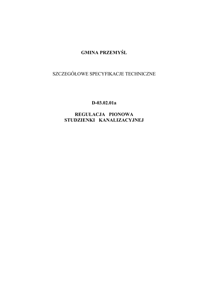 GMINA PRZEMYŚL SZCZEGÓŁOWE SPECYFIKACJE TECHNICZNE D-03.02.01a REGULACJA PIONOWA STUDZIENKI KANALIZACYJNEJ SPIS TREŚCI 1. WSTĘP ..................................................................................................................... 3 2. MATERIAŁY ........................................................................................................... 4 3. SPRZĘT .................................................................................................................... 4 4. TRANSPORT ........................................................................................................... 5 5. WYKONANIE ROBÓT ........................................................................................... 5 6. KONTROLA JAKOŚCI ROBÓT............................................................................ 7 7. OBMIAR ROBÓT.................................................................................................... 8 8. ODBIÓR ROBÓT .................................................................................................... 9 9. PODSTAWA PŁATNOŚCI...................................................................................... 9 10. PRZEPISY ZWIĄZANE .......................................................................................... 9 NAJWAŻNIEJSZE OZNACZENIA I SKRÓTY OST SST - ogólna specyfikacja techniczna - szczegółowa specyfikacja techniczna D-03.02.01a Regulacja pionowa uszkodzonej studzienki kanalizacyjnej 3 1. WSTĘP 1.1. Przedmiot SST Przedmiotem niniejszej szczegółowej specyfikacji technicznej (SST) są wymagania dotyczące wykonania i odbioru robót związanych z wykonaniem regulacji pionowej studzienki kanalizacyjnej na zadaniach: Przebudowy dróg: - Przebudowa drogi Nehrybka PGR - Przebudowa drogi wewnętrznej w Nehrybce dz. Nr 88 1.2. Zakres stosowania SST Ogólna specyfikacja techniczna (OST) stanowi podstawę opracowania szczegółowej specyfikacji technicznej (SST) stosowanej jako dokument przetargowy i kontraktowy przy zlecaniu i realizacji robót na drogach gminnych. 1.3. Zakres robót objętych SST Ustalenia zawarte w niniejszej specyfikacji dotyczą zasad prowadzenia robót związanych z wykonaniem i odbiorem przypowierzchniowej regulacji pionowej studzienek kanalizacyjnych (np. studzienek rewizyjnych, wpustów ulicznych). 1.4. Określenia podstawowe 1.4.1. Studzienka kanalizacyjna - urządzenie połączone z kanałem, przeznaczone do kontroli lub prawidłowej eksploatacji kanału. 1.4.2. Studzienka rewizyjna (kontrolna) - urządzenie nieprzełazowych, ich konserwacji i przewietrzania. do kontroli kanałów 1.4.3. Wpust uliczny (wpust ściekowy, studzienka ściekowa) - urządzenie do przejęcia wód opadowych z powierzchni i odprowadzenia poprzez przykanalik do kanalizacji deszczowej lub ogólnospławnej. 1.4.4. Właz studzienki - element żeliwny przeznaczony do przykrycia podziemnych studzienek rewizyjnych, umożliwiający dostęp do urządzeń kanalizacyjnych. 1.4.5. Kratka ściekowa - urządzenie, przez które wody opadowe przedostają się od góry do wpustu ulicznego. 1.4.6. Nasada (żeliwna) z wlewem bocznym (w krawężniku) - urządzenie, przez które wody opadowe przedostają się w płaszczyźnie krawężnika do wpustu ulicznego. 1.4.7. Pozostałe określenia podstawowe są zgodne z obowiązującymi, odpowiednimi polskimi normami i z definicjami podanymi w OST D-M-00.00.00 „Wymagania ogólne” [1] pkt 1.4. Regulacja pionowa uszkodzonej studzienki kanalizacyjnej 4 D-03.02.01a 1.5. Ogólne wymagania dotyczące robót Ogólne wymagania dotyczące robót podano w OST D-M-00.00.00 „Wymagania ogólne” [1] pkt 1.5. 2. MATERIAŁY 2.1. Ogólne wymagania dotyczące materiałów Ogólne wymagania dotyczące materiałów, ich pozyskiwania i składowania, podano w OST D-M-00.00.00 „Wymagania ogólne” [1] pkt 2. 2.2. Materiały do kanalizacyjnej wykonania regulacji pionowej uszkodzonej studzienki Do przypowierzchniowej naprawy uszkodzonej studzienki kanalizacyjnej należy użyć: a) materiały otrzymane z rozbiórki studzienki oraz z rozbiórki otaczającej nawierzchni, nadające się do ponownego wbudowania, b) materiały nowe, będące materiałem uzupełniającym, tego samego typu, gatunku i wymiarów, jak materiał rozbiórkowy, odpowiadające wymaganiom: OST D-03.02.01 [2] w przypadku materiałów do naprawy studzienki, OST, wymienionych w pkcie 5.6 niniejszej specyfikacji, w przypadku materiałów potrzebnych do ułożenia nowej nawierzchni. 3. SPRZĘT 3.1. Ogólne wymagania dotyczące sprzętu Ogólne wymagania dotyczące sprzętu podano w OST D-M-00.00.00 „Wymagania ogólne” [1] pkt 3. 3.2. Sprzęt stosowany do wykonania regulacji pionowej uszkodzonej studzienki kanalizacyjnej Wykonawca przystępujący do wykonania naprawy, powinien wykazać się możliwością korzystania z następującego sprzętu: piły tarczowej, młota pneumatycznego, sprężarki powietrza, dźwigu samochodowego, zagęszczarki wibracyjnej, sprzętu pomocniczego (szczotka, łopata, szablon itp.). D-03.02.01a Regulacja pionowa uszkodzonej studzienki kanalizacyjnej 5 4. TRANSPORT 4.1. Ogólne wymagania dotyczące transportu Ogólne wymagania dotyczące transportu podano w OST „Wymagania ogólne” [1] pkt 4. D-M-00.00.00 4.2. Transport materiałów Transport nowych materiałów do wykonania naprawy, powinien odpowiadać wymaganiom określonym w: a) OST D-03.02.01 [2], w przypadku materiałów do naprawy studzienki, b) OST, wymienionych w pkcie 5.6 niniejszej specyfikacji, w przypadku materiałów wykorzystywanych do wykonania nowej nawierzchni. 5. WYKONANIE ROBÓT 5.1. Ogólne zasady wykonania robót Ogólne zasady wykonania robót podano w OST D-M-00.00.00 „Wymagania ogólne” [1] pkt 5. 5.2. Uszkodzenia zapadniętych studzienek, podlegające naprawie Uszkodzenie studzienek urządzeń podziemnych występuje, gdy różnica poziomów pomiędzy: kratką wpustu ulicznego a górną powierzchnią warstwy ściera
