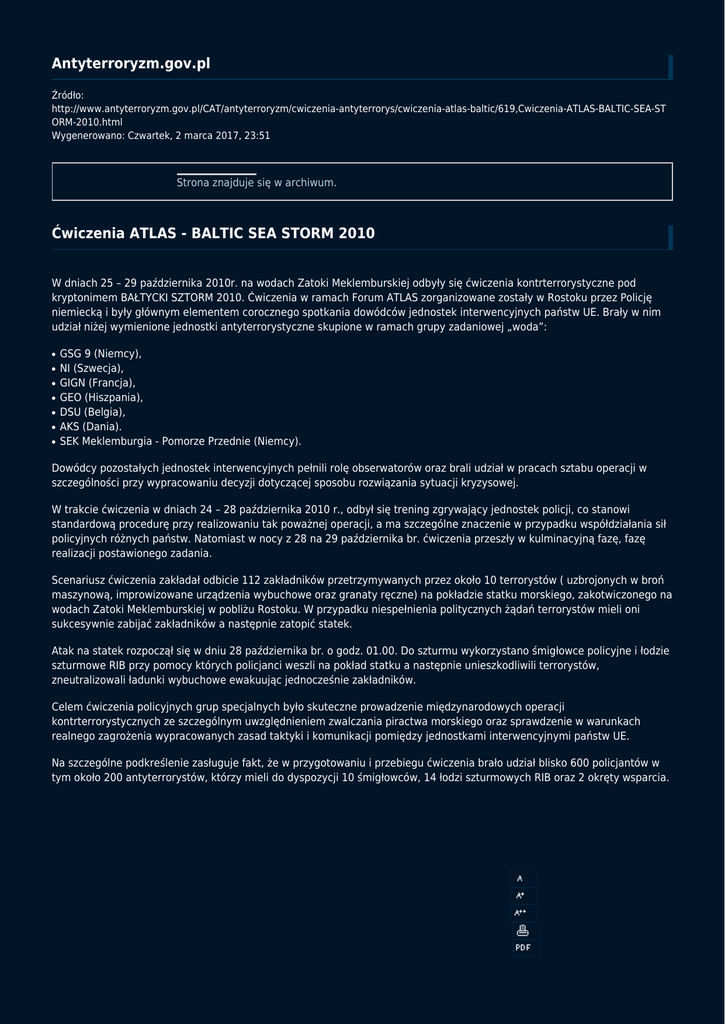Antyterroryzm.gov.pl Źródło: http://www.antyterroryzm.gov.pl/CAT/antyterroryzm/cwiczenia-antyterrorys/cwiczenia-atlas-baltic/619,Cwiczenia-ATLAS-BALTIC-SEA-ST ORM-2010.html Wygenerowano: Czwartek, 2 marca 2017, 23:51 Strona znajduje się w archiwum. Ćwiczenia ATLAS - BALTIC SEA STORM 2010 W dniach 25 – 29 października 2010r. na wodach Zatoki Meklemburskiej odbyły się ćwiczenia kontrterrorystyczne pod kryptonimem BAŁTYCKI SZTORM 2010. Ćwiczenia w ramach Forum ATLAS zorganizowane zostały w Rostoku przez Policję niemiecką i były głównym elementem corocznego spotkania dowódców jednostek interwencyjnych państw UE. Brały w nim udział niżej wymienione jednostki antyterrorystyczne skupione w ramach grupy zadaniowej „woda”: ● ● ● ● ● ● ● GSG 9 (Niemcy), NI (Szwecja), GIGN (Francja), GEO (Hiszpania), DSU (Belgia), AKS (Dania). SEK Meklemburgia - Pomorze Przednie (Niemcy). Dowódcy pozostałych jednostek interwencyjnych pełnili rolę obserwatorów oraz brali udział w pracach sztabu operacji w szczególności przy wypracowaniu decyzji dotyczącej sposobu rozwiązania sytuacji kryzysowej. W trakcie ćwiczenia w dniach 24 – 28 października 2010 r., odbył się trening zgrywający jednostek policji, co stanowi standardową procedurę przy realizowaniu tak poważnej operacji, a ma szczególne znaczenie w przypadku współdziałania sił policyjnych różnych państw. Natomiast w nocy z 28 na 29 października br. ćwiczenia przeszły w kulminacyjną fazę, fazę realizacji postawionego zadania. Scenariusz ćwiczenia zakładał odbicie 112 zakładników przetrzymywanych przez około 10 terrorystów ( uzbrojonych w broń maszynową, improwizowane urządzenia wybuchowe oraz granaty ręczne) na pokładzie statku morskiego, zakotwiczonego na wodach Zatoki Meklemburskiej w pobliżu Rostoku. W przypadku niespełnienia politycznych żądań terrorystów mieli oni sukcesywnie zabijać zakładników a następnie zatopić statek. Atak na statek rozpoczął się w dniu 28 października br. o godz. 01.00. Do szturmu wykorzystano śmigłowce policyjne i łodzie szturmowe RIB przy pomocy których policjanci weszli na pokład statku a następnie unieszkodliwili terrorystów, zneutralizowali ładunki wybuchowe ewakuując jednocześnie zakładników. Celem ćwiczenia policyjnych grup specjalnych było skuteczne prowadzenie międzynarodowych operacji kontrterrorystycznych ze szczególnym uwzględnieniem zwalczania piractwa morskiego oraz sprawdzenie w warunkach realnego zagrożenia wypracowanych zasad taktyki i komunikacji pomiędzy jednostkami interwencyjnymi państw UE. Na szczególne podkreślenie zasługuje fakt, że w przygotowaniu i przebiegu ćwiczenia brało udział blisko 600 policjantów w tym około 200 antyterrorystów, którzy mieli do dyspozycji 10 śmigłowców, 14 łodzi szturmowych RIB oraz 2 okręty wsparcia.