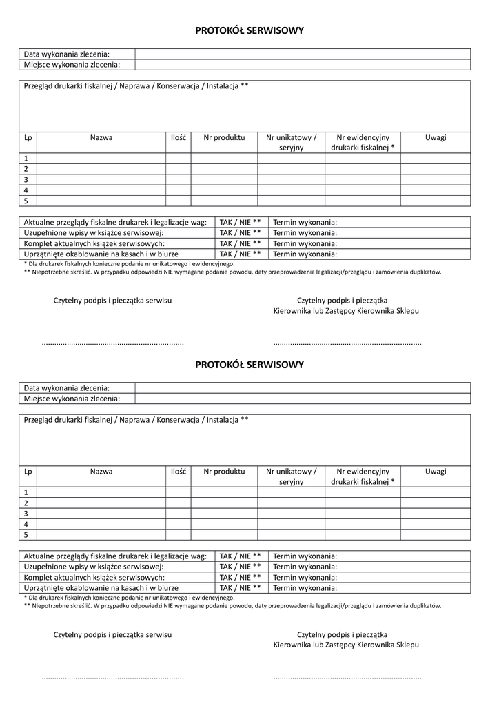 PROTOKÓŁ SERWISOWY Data wykonania zlecenia: Miejsce wykonania zlecenia: Przegląd drukarki fiskalnej / Naprawa / Konserwacja / Instalacja ** Lp Nazwa Ilość Nr produktu Nr unikatowy / seryjny Nr ewidencyjny drukarki fiskalnej * Uwagi 1 2 3 4 5 Aktualne przeglądy fiskalne drukarek i legalizacje wag: Uzupełnione wpisy w książce serwisowej: Komplet aktualnych książek serwisowych: Uprzątnięte okablowanie na kasach i w biurze TAK / NIE ** TAK / NIE ** TAK / NIE ** TAK / NIE ** Termin wykonania: Termin wykonania: Termin wykonania: Termin wykonania: * Dla drukarek fiskalnych konieczne podanie nr unikatowego i ewidencyjnego. ** Niepotrzebne skreślić. W przypadku odpowiedzi NIE wymagane podanie powodu, daty przeprowadzenia legalizacji/przeglądu i zamówienia duplikatów. Czytelny podpis i pieczątka serwisu Czytelny podpis i pieczątka Kierownika lub Zastępcy Kierownika Sklepu ................................................................... ...................................................................... PROTOKÓŁ SERWISOWY Data wykonania zlecenia: Miejsce wykonania zlecenia: Przegląd drukarki fiskalnej / Naprawa / Konserwacja / Instalacja ** Lp Nazwa Ilość Nr produktu Nr unikatowy / seryjny Nr ewidencyjny drukarki fiskalnej * Uwagi 1 2 3 4 5 Aktualne przeglądy fiskalne drukarek i legalizacje wag: Uzupełnione wpisy w książce serwisowej: Komplet aktualnych książek serwisowych: Uprzątnięte okablowanie na kasach i w biurze TAK / NIE ** TAK / NIE ** TAK / NIE ** TAK / NIE ** Termin wykonania: Termin wykonania: Termin wykonania: Termin wykonania: * Dla drukarek fiskalnych konieczne podanie nr unikatowego i ewidencyjnego. ** Niepotrzebne skreślić. W przypadku odpowiedzi NIE wymagane podanie powodu, daty przeprowadzenia legalizacji/przeglądu i zamówienia duplikatów. Czytelny podpis i pieczątka serwisu Czytelny podpis i pieczątka Kierownika lub Zastępcy Kierownika Sklepu ................................................................... ......................................................................