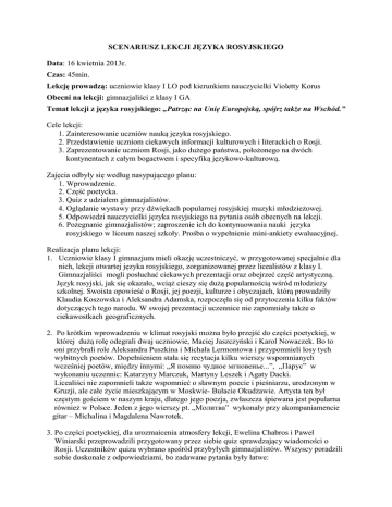 SCENARIUSZ LEKCJI JĘZYKA ROSYJSKIEGO Data: 16 kwietnia