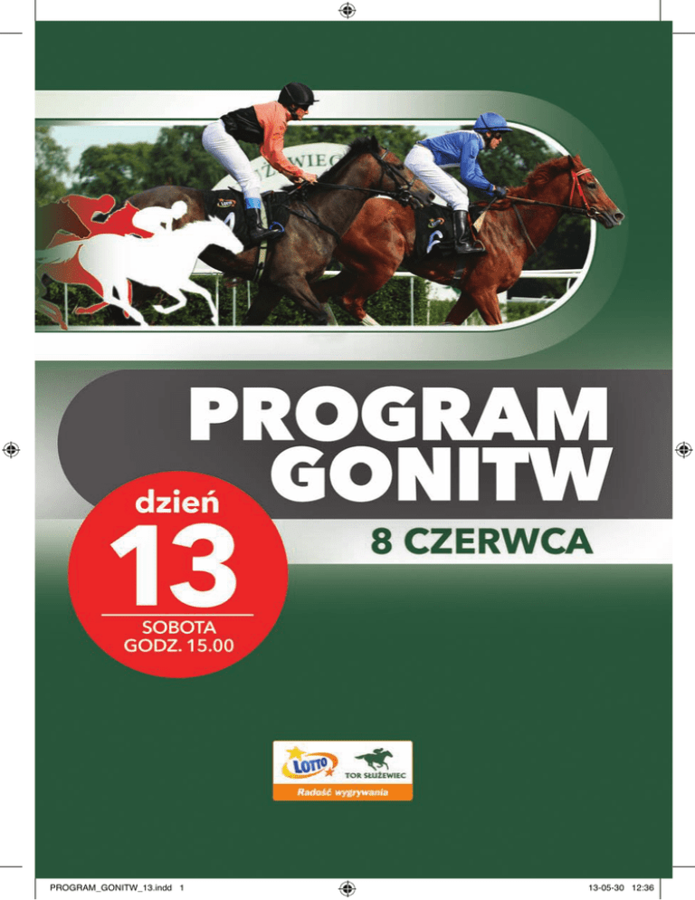 PROGRAM_GONITW_13.indd 1 13-05-30 12:36 UWAGA! : gonitwy_14-2013-06-09 [cs6].indd 2 ZMIANA: zakład Kwinta (KWN) gramy od 2-ej gonitwy 2013-05-30 12:38:37 SPIS GONITW 1 15:00 2 15:30 3 16:00 4 16:30 5 17:00 6 17:30 7 18:00 8 18:30 13 dzień 8 czerwca 2013 Nagroda Hadriana Gonitwa płotowa międzynarodowa dla 4-letnich i starszych koni. Konie, które od 1.01.2012 roku wygrały gonitwę płotową lub przeszkodową za każdą wygraną gonitwę 2 kg nadwagi. Konie, które nie zajęły płatnego miejsca dystans 3400 m 2 kg, a konie, które debiutują, 3 kg ulgi wagi. Nie jest stosowana ulga wagi za kategorie jeździeckie. suma nagród 14 000 zł Nagroda dodatkowa PKWK. Gonitwa handikapowa II grupy dla 4-letnich i starszych koni czystej krwi arabskiej hodowli krajowej wpisanych do Polskiej Księgi Stadnej Koni Arabskich Czystej Krwi (PASB). Wagi według handikapu generalnego: 5-letnie i starsze minus 3 kg, 4-letnie minus 6 kg. Memoriał Jerzego Jednaszewskiego dystans 2000 m suma nagród 10 150 zł dystans 2200 m suma nagród 21 875 zł Gonitwa dla 3-letnich koni I grupy. Nagroda dodatkowa PKWK. Gonitwa handikapowa III grupy dla 4-letnich i starszych koni czystej krwi arabskiej hodowli krajowej wpisanych do Polskiej Księgi Stadnej Koni Arabskich Czystej Krwi (PASB). Wagi według handikapu generalnego: 5-letnie i starsze plus 6 kg, 4-letnie plus 3 kg. Nagroda Widzowa – (kat. B) dystans 1800 m suma nagród 8 400 zł dystans 2400 m suma nagród 45 500 zł Gonitwa dla 4-letnich i starszych koni. Nagroda dodatkowa PKWK. Gonitwa handikapowa III grupy dla 4-letnich i starszych koni. Wagi według handikapu generalnego plus 2 kg. dystans 1600 m suma nagród 11 550 zł Nagroda dodatkowa PKWK. Gonitwa dla 3-letnich klaczy czystej krwi arabskiej II grupy hodowli krajowej wpisanych do Polskiej Księgi Stadnej Koni Arabskich Czystej Krwi (PASB). Gonitwa handikapowa III grupy dla 3-letnich koni. Wagi według handikapu generalnego minus 2 kg. dystans 1800 m suma nagród 12 600 zł dystans 1600 m suma nagród 11 550 zł Nagroda dodatkowa PKWK. JAK CZYTAĆ PROGRAM GONITW numer gonitwy 1 numer gonitwy w sezonie godzina rozpoczęcia gonitwy nagrody za poszczególne miejsca wyniki osiągnięte w danym roku kolejność na celowniku dystans i czas gonitwy PROGRAM_GONITW_13.indd 3 Dandolo – Handikap Otwarcia Gonitwa handikapowa I grupy dla 4-letnich i starszych koni. Wagi według handikapu generalnego minus 11 kg. 15:00 I 15 500 zł wypłaty nieobjęte planem gonitw Nagroda dodatkowa PKWK. (1) 1800 m II 6 200 zł III 3 100 zł IV 1 550 zł V dystans gonitwy 775 zł suma nagród 27 125 zł 1 nazwa nagrody Jansen 2012 • 5-3-5-8-6-2-3-3-5-1 • 6750 zł suma nagród suma nagród zdobytych w danym roku 14.10 IV gr. 5250 zł • Jutrzenka 57, Morfina 54, Jansen 59 (dyst. 2-3-i, 400m 4-y, 100m 3-i – L.Grigoreva), Jasna 57, Lucky Moment 57, Karbonado 57 • 1600m – 1’45,2” (7,9-34,2-32,5-30,6) • tor elastyczny (3,3) • styl silnie wysyłany • 1-1-1¾-9-daleko przebieg gonitwy stan toru 13-05-30 19:33 1 Nagroda Hadriana Gonitwa płotowa międzynarodowa dla 4-letnich i starszych koni. Konie, które od 1.01.2012 roku wygrały gonitwę płotową lub przeszkodową za każdą wygraną gonitwę 2 kg nadwagi. Konie, które nie zajęły płatnego miejsca 2 kg, a konie, które debiutują, 3 kg ulgi wagi. Nie jest stosowana ulga wagi za kategorie jeździeckie. (95) 15:00 I 8 000 zł II Nagroda dodatkowa PKWK. 3 200 zł III 1 600 zł IV 800 zł V 3400 m 400 zł suma nagród 14 000 zł Nr KOŃ Pochodzenie hodowca, właściciel, stajnia, trener 1 Lascadell 2 Empire Hill (SWE) 3 Sekwanka 4 Sunny Money 5 Noridon 6 Acre (GER) 7 Alpha Prim okulary 8 JEŹDZIEC kg (POWOŻĄCY) dż. Z.Lica 70 4 lata wałach gniady P: Scufiott – La Fendi po Goldneyev H: A.Dziuba W: S.W. Chaboski i K.Urbańczyk S: Jaźwie II T: K.Urbańczyk am.dż. P.Peprna 66 5 lat wałach kasztanowaty P: Exaltation – Energy Hill po Muthhil H: K.Jacobson W: K.Jacobson i A.Chrzanowska S: Annsweden T: A.Chrzanowska pr.dż. R.Benš 61 4 lata klacz gniada P: Enjoy Plan – Sekretyna po Special Power H: SK Kozienice W: SK Kozienice S: SK Kozienice T: I.Wróblewska u. G.Kowalski 64 4 lata ogier kasztanowaty P: Solo Banco – Sava po Elmaamul H: Pol-Kaufring Sp. z o.o. W: E.Daporta S: Zwoleń T: M.Jodłowski u. V.Ivanov 69 8 lat ogier kasztanowaty P: Don Corleone – Nebraska po Freedom’s Choice H: H.Łątka W: G.Łątka S: Łaziska T: A.Gajos-Łątka u. A.Chopyk 62 4 lata klacz kasztanowata P: Noel – Agata po Daggers Drawn H: M.Kaszubowski W: „MK” M.Kaszubowski i P.Wróblewski S: Beniaminek II T: P.Wróblewski u. P.Gogolewski 73 9 lat ogier ciemnogniady P: Purist – Alpha Lane po Lando H: Polska Korporacja Inwestycyjna SA W: E.Daporta S: Zwoleń T: M.Jodłowski Golden Profession (IRE) u. K.Brygier 69 5 lat wałach skarogniady P: Golden Snake – Professional Mom po Spinning World H: P.Smyth W: M.Krzyśków i K.Brygier S: Bayonetta T: M.Krzyśków 9 Leading Light 10 Morfina dż. R.G.-Panczew 66 4 lata ogier gniady P: Belenus – Leading Source po Enjoy Plan H: M.Konarski W: Mariusz Konarski i K.Kozłowska S: AM T: J.Kozłowski st.u. D.Pastuszka 66 4 lata klacz ciemnogniada P: Rhodesian winner – Magenta po Jape H: SK Moszna W: M.Falzmann S: Metis T: K.Rogowski PROGRAM_GONITW_13.indd 4 13-05-30 19:33 OcenA szans koni: Dla kolegów ze stajni, ogierów Alpha Prim oraz Sunny Money będzie to debiut w tym sezonie. Zdecydowanie lepszym performance legitymuje się ten pierwszy, który świetnie radził sobie na włoskim torze w Merano. Ogier zajął tam dwa razy trzecie miejsca w gonitwach na dystansach 3500 – 4000 m, ma również na koncie dwie wygrane, dlatego poniesie najwyższą wagę w polu, co nie powinno przeszkodzić mu we włączeniu się w końcową rozgrywkę. Sunny Money ma kiepski bilans, ale obustronnie dystansowy rodowód. Szwedzkiego chowu wałach Empire Hill ścigał się na tamtejszych torach bez sukcesów. Od lutego 2012 r. nie startował