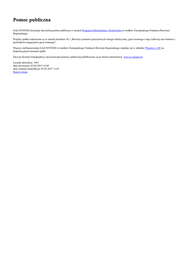 Pomoc publiczna GAZ-SYSTEM otrzymuje dozwoloną pomoc publiczną w ramach Programu Infrastruktura i Środowisko ze środków Europejskiego Funduszu Rozwoju Regionalnego. Projekty spółki realizowane są w ramach działania 10.1 „Rozwój systemów przesyłowych energii elektrycznej, gazu ziemnego i ropy naftowej oraz budowa i przebudowa magazynów gazu ziemnego”. Więcej o dofinansowaniu GAZ-SYSTEM ze środków Europejskiego Funduszu Rozwoju Regionalnego znajduje się w zakładce Wsparcie z UE na korporacyjnych stronach spółki. Decyzje Komisji Europejskiej o przyznawanej pomocy publicznej publikowane są na stronie internetowej www.ec.europa.eu. Licznik odwiedzin: 1967 data utworzenia: 03.02.2015 14:49 data ostatniej modyfikacji: 01.02.2017 11:01 Rejestr zmian