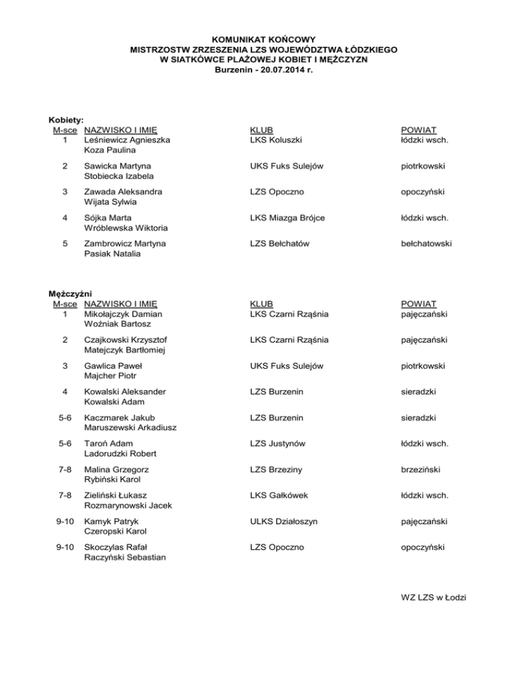 KOMUNIKAT KOŃCOWY MISTRZOSTW ZRZESZENIA LZS WOJEWÓDZTWA ŁÓDZKIEGO W SIATKÓWCE PLAŻOWEJ KOBIET I MĘŻCZYZN Burzenin - 20.07.2014 r. Kobiety: M-sce NAZWISKO I IMIĘ 1 Leśniewicz Agnieszka Koza Paulina KLUB LKS Koluszki POWIAT łódzki wsch. 2 Sawicka Martyna Stobiecka Izabela UKS Fuks Sulejów piotrkowski 3 Zawada Aleksandra Wijata Sylwia LZS Opoczno opoczyński 4 Sójka Marta Wróblewska Wiktoria LKS Miazga Brójce łódzki wsch. 5 Zambrowicz Martyna Pasiak Natalia LZS Bełchatów bełchatowski KLUB LKS Czarni Rząśnia POWIAT pajęczański Mężczyźni M-sce NAZWISKO I IMIĘ 1 Mikołajczyk Damian Woźniak Bartosz 2 Czajkowski Krzysztof Matejczyk Bartłomiej LKS Czarni Rząśnia pajęczański 3 Gawlica Paweł Majcher Piotr UKS Fuks Sulejów piotrkowski 4 Kowalski Aleksander Kowalski Adam LZS Burzenin sieradzki 5-6 Kaczmarek Jakub Maruszewski Arkadiusz LZS Burzenin sieradzki 5-6 Taroń Adam Ladorudzki Robert LZS Justynów łódzki wsch. 7-8 Malina Grzegorz Rybiński Karol LZS Brzeziny brzeziński 7-8 Zieliński Łukasz Rozmarynowski Jacek LKS Gałkówek łódzki wsch. 9-10 Kamyk Patryk Czeropski Karol ULKS Działoszyn pajęczański 9-10 Skoczylas Rafał Raczyński Sebastian LZS Opoczno opoczyński WZ LZS w Łodzi