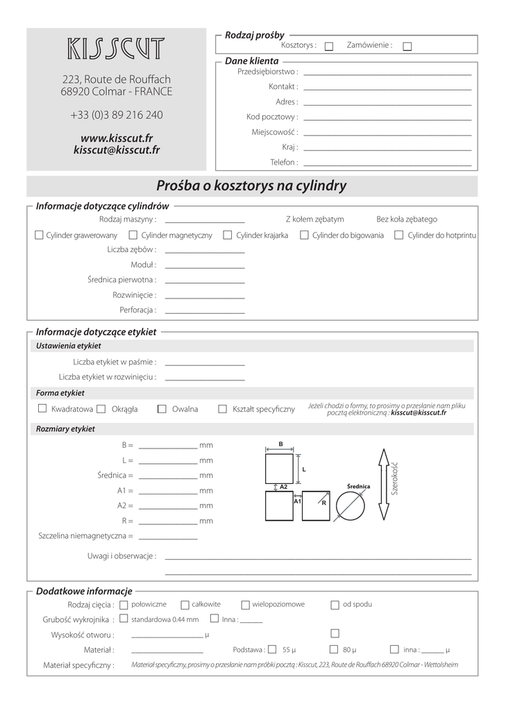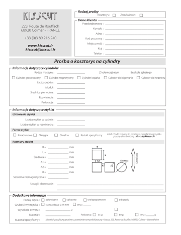 Rodzaj prośby Kosztorys : Zamówienie : Dane klienta Przedsiębiorstwo : ________________________________________ 223, Route de Rouffach 68920 Colmar - FRANCE Kontakt : ________________________________________ Adres : ________________________________________ +33 (0)3 89 216 240 Kod pocztowy : ________________________________________ Miejscowość : ________________________________________ www.kisscut.fr [email protected] Kraj : ________________________________________ Telefon : ________________________________________ Prośba o kosztorys na cylindry Informacje dotyczące cylindrów Rodzaj maszyny : Cylinder grawerowany ___________________ Cylinder magnetyczny Z kołem zębatym Cylinder krajarka Liczba zębów : ___________________ Moduł : ___________________ Średnica pierwotna : ___________________ Rozwinięcie : ___________________ Perforacja : ___________________ Bez koła zębatego Cylinder do bigowania Cylinder do hotprintu Informacje dotyczące etykiet Ustawienia etykiet Liczba etykiet w paśmie : ___________________ Liczba etykiet w rozwinięciu : ___________________ Forma etykiet Kwadratowa Okrągła Owalna Jeżeli chodzi o formy, to prosimy o przesłanie nam pliku pocztą elektroniczną : [email protected] Kształt specyficzny Rozmiary etykiet B = ______________ mm L = ______________ mm L Średnica = ______________ mm Średnica A2 A1 = ______________ mm A1 A2 = ______________ mm Szerokość B R R = ______________ mm Szczelina niemagnetyczna = ______________ Uwagi i obserwacje : _________________________________________________________________________ _________________________________________________________________________ Dodatkowe informacje Rodzaj cięcia : Grubość wykrojnika : Wysokość otworu : Materiał : Materiał specyficzny : połowiczne całkowite standardowa 0.44 mm wielopoziomowe od spodu Inna : ______ ___________________ µ ___________________ Podstawa : 55 µ 80 µ inna : ______ µ Materiał specyficzny, prosimy o przesłanie nam próbki pocztą : Kisscut, 223, Route de Rouffach 68920 Colmar - Wettolsheim