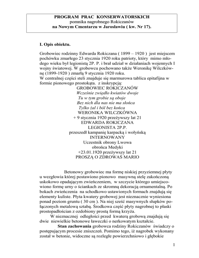 PROGRAM PRAC KONSERWATORSKICH pomnika nagrobnego Rokiczanów na Nowym Cmentarzu w Jarosławiu ( kw. Nr 17). I. Opis obiektu. Grobowiec rodzinny Edwarda Rokiczana ( 1899 – 1920 ) jest miejscem pochówku zmarłego 23 stycznia 1920 roku patrioty, który mimo młodego wieku był legionistą 2P. P. i brał udział w działaniach wojennych I wojny światowej. W grobowcu pochowano także Weronikę Wilczkównę (1899-1920 ) zmarłą 9 stycznia 1920 roku. W centralnej części steli znajduje się marmurowa tablica epitafijna w formie pionowego prostokąta. z inskrypcją: GROBOWIEC ROKICZANÓW Wcześnie zwiędło kwiatów dwoje Tu w tym grobie są oboje Bez nich dla nas nie ma słońca Tylko żal i ból bez końca WERONIKA WILCZKÓWNA + 9 stycznia 1920 przeżywszy lat 21 EDWARDA ROKICZANA LEGIONISTA 2P.P. przeszedł kampanię karpacką i wołyńską INTERNOWANY Uczestnik obrony Lwowa obrońca Medyki +23.01.1920 przeżywszy lat 21 PROSZĄ O ZDROWAŚ MARIO Betonowy grobowiec ma formę niskiej przyziemnej płyty u wezgłowia której postawiono pionowo masywną stelę zakończoną uskokowo opadającym zwieńczeniem, w szczycie którego umiejscowiono formę urny o ściankach ze skromną dekoracją ornamentalną. Po bokach zwieńczenia na schodkowo ustawionych formach znajdują się elementy kuliste. Płyta kwatery grobowej jest nieznacznie wyniesiona ponad poziom gruntu ( 30 cm ). Na niej sześć masywnych słupków połączonych metalową sztabą. Środkowa część płyty nagrobnej to płaski prostopadłościan z ozdobiony prostą formą krzyża. W nieznacznej odległości przed kwaterą grobową znajdują się dwie niewielkie betonowe ławeczki o nerkowatym kształcie. Stan zachowania grobowca rodziny Rokiczanów świadczy o postępującym procesie zniszczeń. Pomimo tego, iż nagrobek wykonany został w betonie, widoczne są rozległe powierzchniowo i głębokie 1 ubytki formy przedniej części grobowca. Ponadto wierzchnia, gładzona warstwa narzutu betonowego wykazuje liczne pęknięcia. W pionowej steli następuje oddzielanie się nadłożonego zwieńczenia od ściany dźwigającej. Świadczy o tym głęboka bruzda i liczne pęknięcia widoczne na tylnej ścianie steli. Na zły stan zachowania obiektu wpływ miały przede wszystkim czynniki atmosferyczne. Szczególną rolę w procesach niszczących odegrała woda poprzez: a. Wymywanie spoiwa b. Transport soli z podłoża c. Zamarzanie / rozsadzanie/ porów kamienia d. Ułatwienie przebiegu procesów chemicznych niszczących kamień. Progresja procesu niszczenia zaprawy betonowej następuje w okresie zimowym przez rozsadzanie materiału zamarzającą wodą. Mikro szczeliny są coraz większe i głębsze; w pierwszej fazie korozji nie widać zniszczeń zachodzących w głębszych partiach betonu, osłabienia jego spoistości. Białe wykwity na spękaniach świadczą o zewnętrznej kumulacji soli i szkodliwych związków chemicznych powstałych na skutek działania gazów atmosferyczne ( dwutlenek węgla, tlenki siarki i azotu, siarkowodór ) w połączeniu z parą wodna lub wodą zawarta wewnątrz kamienia, II. POSTĘPOWANIE KONSERWATORSKIE A. Beton Wszystkim etapom prac towarzyszyć będzie fotograficzna dokumentacja konserwatorska 1. Wstępne czyszczenie powierzchni grobowca z luźnych zanieczyszczeń pochodzenia atmosferycznego ( kurz, brud, luźne naleciałości ), ziemi i roślin. 2. Skucie partii tynków zniszczonych; spękanych, odspojonych od podłoża, osłabionych i kruszących się. Dokładne mechaniczne oczyszczenie odsłoniętych powierzchni (szpachle, noże szewskie, szczotki mosiężne). 3. Przeżyłowanie pęknięć zaprawy 4. Usunięcie szkodliwych nawarstwień z powierzchni kamienia pochodzenia atmosferycznego ( smolista patyna ) a także mikroflory ( mchy, porosty ) i mikroorganizmów przy zastosowaniu metody hydrodynamicznej z użyciem Alkutex Fassadenreiniger Paste firmy Remmers lub zbliżonych ( Altax ). 5. Odsolenie kamienia metodą swobodnej migracji soli do rozszerzonego środowiska w miejscach pęknięć i wykwitów soli. 2 6. Uzupełnienie grubowarstwowych ubytków betonu przy użyciu zaprawy Ausbesserungsmortel grob firmy Remmers. 7. Wypełnienie pęknięć i powierzchniowych ubytków betonu w systemie zapraw PCC-Mortel firmy Remmers. 8. Scalenie kolorystyczne powierzchni grobowca przy użyciu wysokiej jakości farby hydrofobowej, otwartej na dyfuzję pary wodnej. B. Kamień – marmur / tablica inskrypcyjna / 1. Oczyszczenie z korozji metalowych elementów mocujących tablicę. 2. Usunięcie pozostałości spoinowania. 3. Oczyszczenie i regeneracja zmatowiałej powierzchni płyty metodą szlifowania na mokro. 4. Wypełnienie ubytków kitem firmowym na bazie żywicy poliestrowej włoskiej firmy General, barwionej w masie + utwardzacz. 5. Wykonanie nowych spoin wokół tablicy. 6. Opracowanie powierzchni kitów. 7. Impregnacja płyty środkiem Sarsil W. 8. Osadzenie płyty w cokole ( wykonanie spoinowania ) C. Elementy metalowe 1. Oczyszczenie powierzchni metalu ze śladów korozji, odtłuszczenie powierzchni. 2. Zabezpieczenie antykorozyjne elementów ogrodzenia przez zagruntowa- nie farbą podkładową, a następnie pomalowanie wysokiej jakości farbą do metalu. 3