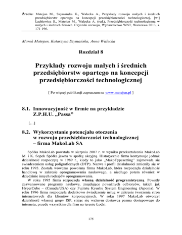 Źródło: Matejun M., Szymańska K., Walecka A., Przykłady rozwoju małych i średnich przedsiębiorstw opartego na koncepcji przedsiębiorczości technologicznej, [w:] Lachiewicz S., Matejun M., Walecka A. (red.), Przedsiębiorczość technologiczna w małych i średnich firmach. Czynniki rozwoju, Wydawnictwo WNT, Warszawa 2013, s. 171-196. Marek Matejun, Katarzyna Szymańska, Anna Walecka Rozdział 8 Przykłady rozwoju małych i średnich przedsiębiorstw opartego na koncepcji przedsiębiorczości technologicznej [ Po więcej publikacji zapraszam na www.matejun.pl ] 8.1. Innowacyjność w firmie na przykładzie Z.P.H.U. „Passa” […] 8.2. Wykorzystanie potencjału otoczenia w rozwoju przedsiębiorczości technologicznej – firma MakoLab SA Spółka MakoLab powstała w sierpniu 2007 r. w wyniku przekształcenia MakoLab M. i K. Sopek Spółka jawna w spółkę akcyjną. Historycznie firma kontynuuje jednak działalność rozpoczętą w 1989 r., kiedy to jako „MakoTypesetting” zajmowała się świadczeniem usług poligraficznych (DTP). Nazwa i profil działalności zmieniły się w roku 1993. Została wówczas powołana firma MakoLab, która rozpoczęła działalność handlową w zakresie oprogramowania naukowego, a niedługo potem również w dziedzinie innych rodzajów oprogramowania. W roku 1995 firma rozpoczęła własną działalność programistyczną. Powstły zaawansowane programy naukowe, znajdujące poważnych odbiorców, takich jak HyperCube – (Canada/USA) czy Fujitstu Kyushu System Engineering (Japonia). W roku 1996 firma rozpoczęła dodatkowo świadczenie usług w zakresie tworzenia stron internetowych dla klientów korporacyjnych. W roku 1997 MakoLab otworzył działalność własnej grupy ISP, stając się ważnym dostawcą pasma dostępowego do internetu, przede wszystkim dla firm na terenie Łodzi. 175 Źródło: Matejun M., Szymańska K., Walecka A., Przykłady rozwoju małych i średnich przedsiębiorstw opartego na koncepcji przedsiębiorczości technologicznej, [w:] Lachiewicz S., Matejun M., Walecka A. (red.), Przedsiębiorczość technologiczna w małych i średnich firmach. Czynniki rozwoju, Wydawnictwo WNT, Warszawa 2013, s. 171-196. Od roku 1998 rozpoczął się dynamiczny rozwój firmy, w związku z nawiązaniem współpracy z firmą Philips, dla której MakoLab tworzy nowoczesną witrynę WWW. Wkrótce potem powstają pierwsze systemy biznesowe dla Philipsa, w tym baza kontaktów handlowych (będąca w istocie systemem CRM), eksploatowany do dziś system zarządzania międzynarodowymi projektami TWS, programy lojalnościowe i wiele innych. W roku 2001 MakoLab rozpoczął współpracę z kolejnym ważnym klientem – firmą Renault. W początkowej fazie realizowane były prace na rzecz intranetu i ekstranetu firmy Renault w Polsce, jednak już w 2002 r. MakoLab uruchomił nową witrynę internetową firmy Renault Polska, implementując system RenaultSITe realizowany w technologii J2EE. W kolejnych latach uruchamiane były następne witryny krajowe, a do końca 2005 r. już sześć krajów Europy posiadało witryny Renault uruchomione i utrzymywane w DataCenter firmy MakoLab. Ponadto opisywana firma rozpoczęła współpracę ze spółką „Dacia” (której głównym udziałowcem jest Renault) na wykonanie i utrzymanie 20 witryn przeznaczonych dla odbiorców z różnych krajów. W roku 2002 MakoLab podpisał umowę dystrybucyjną, dotyczącą zaawansowanej technologii telekomunikacyjnej, z firmą Patton Electronics z USA i rozpoczął dystrybucję urządzeń tej firmy w Polsce. W tym samym roku dział handlowy rozszerzył swoją ofertę o komputery i inny sprzęt IT. W 2003 r. MakoLab rozpoczął współpracę z firmą Point-S, polską korporacją oponiarską, wdrażając rozproszony system biznesowy klasy ERP MegaSale/MegaManage. W roku 2005 MakoLab podpisał umowę partnerską z firmą Comarch. W tym roku powstał też jeden z podstawowych produktów programistycznych firmy – system ColDis wspomagający zarządzanie dużymi centrami handlowymi. W wyniku dynamicznego rozwoju spółka wkroczyła w fazę oderwania się i ekspansji1, przekształcając się w 2007 r. w spółkę akcyjną i debiutując następnie na rynku NewConnect Warszawskiej Giełdy Papierów Wartościowych. W roku 2008 nastąpił dalszy rozwój firmy, głównie przez internacjonalizację działalności2. Od tego roku firma posiadała dwa nowe biura handlowe: w Warszawie i w Łodzi. Oprócz ciągłego rozwoju oferowanych produktów i usług, firma rozbudowuje także struktury handlowe i marketingowe. Obecnie zespół firmy MakoLab SA tworzy ponad 70 osób – w zdecydowanej większości ludzi młodych, absolwentów łódzkich uczelni. Najliczniejszą grupę stanowią programiści. Do zespołu należą także: kierownicy projektów, konsultanci, graficy komputerowi oraz administratorzy sieci komputerowych. Spółka zatrudnia też handlowców pracujących w biurach handlowych w Łodzi i w Warszawie. W roku 2005, po 16 latach działania w wynajmowanych lokalach, firma przeniosła się do własnego, przestronnego budynku w Łodzi przy ulicy Demokratycznej. Obecnie działalność przedsiębiorstwa prowadzona jest zatem w trzech miejscach: 1 2 Rozumianą zgodnie z modelem proponowanym w pracy: Churchill, Lewis [1983, s. 30–50]. Zob. szerzej: Matejun [2009, s. 144–153]. 176 Źródło: Matejun M., Szymańska K., Walecka A., Przykłady rozwoju małych i średnich przedsiębiorstw opartego na koncepcji przedsiębiorczości technologicznej, [w:] Lachiewicz S., Matejun M., Walecka A. (red.), Przedsiębiorczość technologiczna w małych i średnich firmach. Czynniki rozwoju, Wydawnictwo WNT, Warszawa 2013, s. 171-196. w Łodzi przy ul. Demokratycznej 46, gdzie znajduje się siedziba Zarządu, biuro Spółki, księgowość oraz dział usług internetowych (Centrum Danych) i działy realizujące systemy zarządzania; w Łodzi przy ul. Piotrkowskiej 270, gdzie zlokalizowany jest dział ha