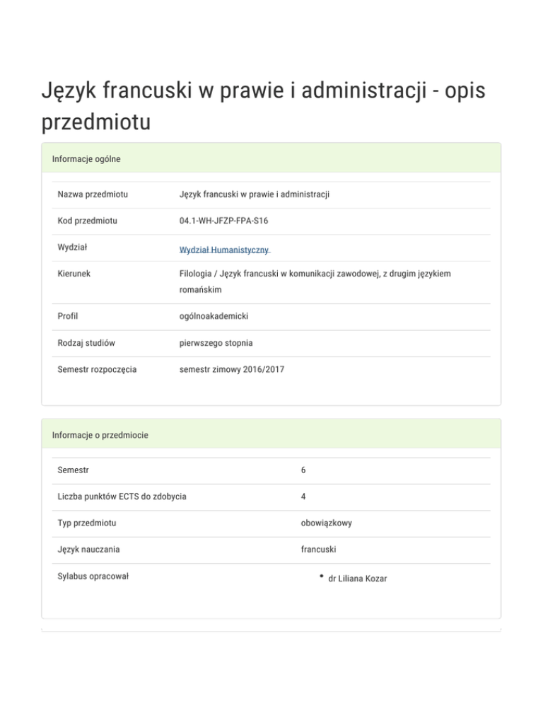 Język francuski w prawie i administracji - opis przedmiotu Informacje ogólne Nazwa przedmiotu Język francuski w prawie i administracji Kod przedmiotu 04.1-WH-JFZP-FPA-S16 Wydział Wydział Humanistyczny Kierunek Filologia / Język francuski w komunikacji zawodowej, z drugim językiem romańskim Profil ogólnoakademicki Rodzaj studiów pierwszego stopnia Semestr rozpoczęcia semestr zimowy 2016/2017 Informacje o przedmiocie Semestr 6 Liczba punktów ECTS do zdobycia 4 Typ przedmiotu obowiązkowy Język nauczania francuski Sylabus opracował dr Liliana Kozar Formy zajęć Forma Liczba godzin w Liczba godzin w Liczba godzin w Liczba godzin w Forma zajęć semestrze tygodniu semestrze tygodniu zaliczenia (stacjonarne) (stacjonarne) (niestacjonarne) (niestacjonarne) 30 2 - - Ćwiczenia Zaliczenie na ocenę Cel przedmiotu Celem przedmiotu jest doskonalenie praktycznej znajomości języka francuskiego ukierunkowanego na cele zawodowe, głównie w zakresie specjalistycznej leksyki (również frazeologii i konstrukcji leksykalno-gramatycznych), typowej dla dziedziny prawa i administracji. Student rozwija umiejętność rozumienia i analizy tekstów prawnych, prawniczych i administracyjnych, poznaje specjalistyczną terminologię, charakterystyczną stylistykę oraz francuskie realia z zakresu dziedziny, zaznajamia się ze specyfiką tłumaczeń prawnych i prawniczych. Wymagania wstępne Znajomość języka francuskiego na poziomie co najmniej B2. Zakres tematyczny Praca z tekstem prawnym i administracyjnym, głównie pisanym, o zróżnicowanej tematyce i problematyce (rozumienie tekstu, interpretacja tekstu, tłumaczenie, praca z tekstem paralelnym): korespondencja urzędowa (prośba, decyzja, odwołanie od decyzji, skarga, zaświadczenie, wezwanie, reklamacja, odpowiedź na reklamację, itp.) dokumenty administracyjne (akt urodzenia, akt małżeństwa, akt zgonu, zaświadczenie o niekaralności, świadectwo maturalne, dyplomy, itp.) wzory umów prawnych (umowa najmu, umowa kupna / sprzedaży, umowa o pracę, umowa ubezpieczenia, itp.) sądownictwo (sądy; le tribunal de police, le tribunal correctionnel, la cour d’assises ; sędziowie, proces / rozprawa sądowa, biegły sadowy, itp.) wzory pism procesowych (pozew sądowy, pozew rozwodowy, pozew o odszkodowanie, itp.) prawo pracy (umowa o pracę, wypowiedzenie, rozwiązanie umowy o pracę, itp) prawo karne (faits divers, wykroczenie, przestępstwo, zbrodnia, podejrzany, osadzony, śledztwo, strony postępowania, wyrok, itp.) prawo handlowe i kodeks postępowania administracyjnego (prawa konsumenta, instytucja rzecznika praw konsumenta, rzecznika praw ubezpieczonych, itp.) prawo budowlane (pozwolenie na budowę, samowola budowlana, zgoda na przebudowę / modernizację, itp.) konstytucja Francji i RP (analiza porównawcza wybranych fragmentów) ubezpieczenia: ubezpieczenia majątkowe (ubezpieczenie domu, OC, AC, od pożaru, itp.) i ubezpieczenia osobowe (chorobowe, wypadkowe, na życie, itp.) Metody kształcenia Lektura, analiza i interpretacja tekstów źródłowych, ćwiczenia leksykalno-gramatyczne, tłumaczenia ustne i pisemne, praca z tekstem paralelnym, ćwiczenia analityczne aktywizujące: burza mózgów, inscenizacja, metoda sytuacyjna, metoda kontrastu / zestawienia. Praca indywidualna, w parach i w grupach. Efekty kształcenia i metody weryfikacji osiągania efektów kształcenia Opis efektu Student opanował podstawową Symbole efektów KN1_W08 Metody weryfikacji aktywność w trakcie wiedzę na temat metod krytycznej zajęć analizy i interpretacji tekstów obserwacje i ocena obcojęzycznych. umiejętności Forma zajęć Ćwiczenia praktycznych studenta odpowiedź ustna praca pisemna Zna i rozumie podstawowe pojęcia i KN1_W09 aktywność w trakcie zasady z zakresu ochrony prawa zajęć autorskiego. obserwacja i ocena aktywności na zajęciach dyskusja Ćwiczenia Opis efektu Symbole efektów Ma podstawową wiedzę o formach Metody weryfikacji KN1_W12 Forma zajęć aktywność w trakcie organizacyjno-prawnych zajęć przedsiębiorstw polskich i odpowiedź ustna francuskich. dyskusja Ćwiczenia Warunki zaliczenia Zaliczenie na ocenę na podstawie: - aktywnego uczestnictwa w zajęciach - 20%, - co najmniej jednej pracy projektowej (w grupach) - 30% - bieżąca kontrola wiedzy w zakresie przerobionego materiału, w formie 2-3 sprawdzianów bądź testów - 50%. Obciążenie pracą Obciążenie pracą Studia Studia niestacjonarne stacjonarne (w godz.) (w godz.) Godziny kontaktowe (udział w zajęciach; konsultacjach; egzaminie, itp.) 40 - Samodzielna praca studenta (przygotowanie do: zajęć, kolokwium, 60 - Łącznie 100 - Punkty ECTS Studia Studia niestacjonarne egzaminu; studiowanie literatury przygotowanie: pracy pisemnej, projektu, prezentacji, raportu, wystąpienia; itp.) stacjonarne Zajęcia z udziałem nauczyciela akademickiego 2 - Zajęcia bez udziału nauczyciela akademickiego 2 - Łącznie 4 - Literatura podstawowa 1. Dollez C., S. Pons, (2013). Alter Ego3+. Méthode de français. Paris. 2. Penfornis J. L., (1999). Français du droit: Affaires, Europe, Administration, Justice, Travail, Contrats. Paris. 3. Soignet, M., (2003), Français juridique. Paris. 4. Machowska, A.(2003). Słownik terminologii prawniczej, polsko-francuski.Bydgoszcz-Kraków: Oficyna Wydawnicza Branta. 5. Gallerne J. M., (2014), Français langue juridique. Niveau avancé, Poznań. 6. Bassi C., A.M. Sainlos, (2005), Administration. com, Paris. 7. Roland E., (1992), Vocabulaire : 350 exercices, textes et glossaires : niveau avancé, Paris. 8. Barféty M., (2007), Compréhension orale : niveau 3, Paris. 9. Barféty M., (2010), Compréhension orale : niveau 4, Paris. 10. http://www.documentissime.fr 11. http://www.wzory.positor.pl 12. http://dokumenty.nf.pl Literatura uzupełniająca 1. Bem M., M. Gebler, (2011), Słownik terminologii prawniczej francusko-polski, polsko-francuski, Warszwa. 2. Pieńkos J., red., (1987), Słownik prawniczy polsko-francuski, Wroc