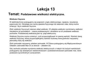 Lekcja 13 Temat: Podstawowe wielkości elektryczne. Wielkości fizyczne W elektrotechnice posługujemy się pojęciami: prądu elektrycznego, napięcia, rezystancji, pojemności itd. Określają one cechę zjawiska fizycznego lub własność ciała, którą moŜna zmierzyć. Są to wielkości fizyczne. Zbiór wielkości fizycznych stanowi układ wielkości. W układzie wielkości rozróŜniamy wielkości niezaleŜne od pozostałych – zwane podstawowymi i określane na ich podstawie wielkości pochodne. Podstawową wielkością jest np. prąd elektryczny. Wielkości fizyczne moŜna zmierzyć, czyli przyporządkować im pewną wartość. Wartość danej wielkości fizycznej, której przyporządkujemy wartość liczbową równą jedności nazywamy jednostką miary tej wielkości. Zbiór jednostek nazywamy układem jednostek. W Polsce posługujemy się Międzynarodowym Układem Jednostek Miar SI (w skrócie – układem SI). Gdy zachodzi potrzeba wyraŜenia wielkości elektrycznych o małych lub duŜych wartościach posługujemy się dziesiętnymi wielokrotnościami i podwielokrotnościami jednostek miar, które podawane są konkretnym oznaczeniem. Tabela 1. Dziesiętne wielokrotności i podwielokrotności jednostek miar. cd. Tabela 1. Dziesiętne wielokrotności i podwielokrotności jednostek miar. Podstawowe wielkości elektryczne Podstawowe wielkości elektryczne to: prąd elektryczny, napięcie i związany z nim potencjał elektryczny, rezystancja, pojemność kondensatora, indukcyjność cewki. Pojęciem prądu elektrycznego określamy zjawisko uporządkowanego ruchu ładunków elektrycznych przez przekrój poprzeczny środowiska pod działaniem pola elektrycznego. Jest to równieŜ wielkość określona jako stosunek elementarnego ładunku elektrycznego δq przenoszonego przez cząsteczki naładowane w ciągu pewnego czasu elementarnego δt przez dany przekrój poprzeczny środowiska, do tego czasu: δq i= δt Wartość tego stosunku nazywamy natęŜeniem prądu elektrycznego. Jednostką natęŜenia prądu elektrycznego jest amper [A]. [i ] = [δq] C = =A [δt ] A Prąd elektryczny moŜe nie zmieniać się w czasie, wtedy mówimy, Ŝe jest to prąd stały. Jeśli natomiast prąd w czasie zmienia swoją wartość, kierunek przepływu (zwany teŜ zwrotem) lub i wartość i kierunek przepływu, mówimy wtedy o prądzie zmiennym. a) b) c) Rys.1. Wykresy czasowe a) prądu stałego; b), c) prądu zmiennego. Napięcie elektryczne to róŜnica potencjałów między dwoma punktami obwodu elektrycznego, umoŜliwiająca przesunięcie ładunku elektrycznego, czyli przepływ prądu. Wielkości charakteryzujące podstawowe elementy elektryczne to: rezystancja dla rezystorów, indukcyjność dla cewek i pojemność dla kondensatorów. Tabela 2. Podstawowe wielkości elektryczne. Przy zapisie iloczynu jednostek stawiamy między nimi kropkę lub oddzielamy je pojedynczym odstępem (zasady tej nie stosuje się przy oznaczaniu: eV, Wh, varh, Ah, VA). Zaletą układu SI jest to, Ŝe kaŜdej wielkości fizycznej odpowiada tylko jedna jednostka.