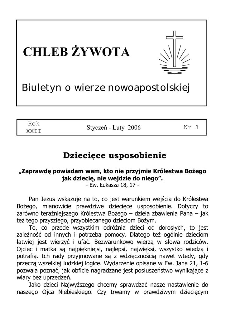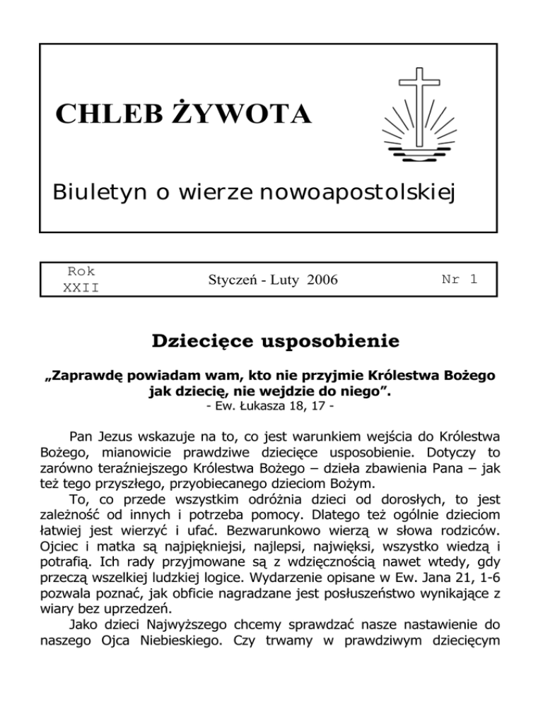 CHLEB ŻYWOTA Biuletyn o wierze nowoapostolskiej Rok XXII Styczeń - Luty 2006 Nr 1 Dziecięce usposobienie „Zaprawdę powiadam wam, kto nie przyjmie Królestwa Bożego jak dziecię, nie wejdzie do niego”. - Ew. Łukasza 18, 17 - Pan Jezus wskazuje na to, co jest warunkiem wejścia do Królestwa Bożego, mianowicie prawdziwe dziecięce usposobienie. Dotyczy to zarówno teraźniejszego Królestwa Bożego – dzieła zbawienia Pana – jak też tego przyszłego, przyobiecanego dzieciom Bożym. To, co przede wszystkim odróżnia dzieci od dorosłych, to jest zależność od innych i potrzeba pomocy. Dlatego też ogólnie dzieciom łatwiej jest wierzyć i ufać. Bezwarunkowo wierzą w słowa rodziców. Ojciec i matka są najpiękniejsi, najlepsi, najwięksi, wszystko wiedzą i potrafią. Ich rady przyjmowane są z wdzięcznością nawet wtedy, gdy przeczą wszelkiej ludzkiej logice. Wydarzenie opisane w Ew. Jana 21, 1-6 pozwala poznać, jak obficie nagradzane jest posłuszeństwo wynikające z wiary bez uprzedzeń. Jako dzieci Najwyższego chcemy sprawdzać nasze nastawienie do naszego Ojca Niebieskiego. Czy trwamy w prawdziwym dziecięcym usposobieniu? Czy zawsze chętnie zbliżamy się do naszego Ojca Niebieskiego i Jego Syna, Jezusa Chrystusa? Ich kojącą bliskość możemy przeżywać w szczególności w nabożeństwie pod aktualnym Słowem z ołtarza, w świętej wieczerzy i w modlitwie. Nasz Oblubieniec duszy z miłością mówi: „Przyjdź do mnie i pozostań u mnie, nie daj się przez nic ze mną rozdzielić!”. Nigdy nie zapomnijmy: Jestem dzieckiem Bożym i mam wspaniałą obietnicę odziedziczenia Królestwa Bożego. Jakie jest, jak myśli i jak postępuje dziecko? Dziecko jest słabe, ale to jest jego siłą. My także jesteśmy słabymi, ponieważ wiemy, że nie jesteśmy w stanie nic uczynić bez Wszechmogącego Boga. To poznanie jest naszą siłą. Dlatego też z wdzięcznością przyjmujemy to wszystko, co Bóg nam daje. Dzieci chętnie dają się brać w ramiona. Jak jest przyjemnie, gdy nasz Ojciec Niebieski z miłością obejmuje nas swoimi mocnymi ramionami, pociesza i błogosławi. Dzieci są pełne zaufania, wierzące i pokorne. Nas także powinna zdobić dziecięca, bezwarunkowa wiara oraz niezachwiane zaufanie idące w parze z prawdziwą pokorą serca. Jako nosiciele Ducha Świętego powinniśmy pielęgnować wzajemną jedność nawet wtedy, gdy mamy do czynienia z niedoskonałymi ludźmi. Chcemy stać się takimi, jak dzieci, które przyjmują Królestwo Boże z pięknym, pokornym i wdzięcznym dziecięcym usposobieniem. W ten sposób osiągniemy godność i jako spadkobiercy wejdziemy do przygotowanej dla nas wspaniałości. Wszystko rozsądzać duchowo! „Ale człowiek zmysłowy nie przyjmuje tych rzeczy, które są z Ducha Bożego”. (1. Koryntian 2, 14) W ten sposób jednoznacznie pisze Apostoł Paweł. Czyż to już nie wyjaśnia, dlaczego w naszym czasie nie odczuwamy oddźwięku w naszej wierze, a wielu nie wie co począć z naszym Kościołem? Kto jest „zmysłowy”, czyli zdominowany tym, co ziemskie i kieruje się tylko tym, co doczesne, ten przechodzi obok propozycji łaski Bożej. Nie przyjmuje Jego Słowa i sakramentów. Tak więc „zmysłowo usposobiony człowiek” nie otwiera się na łaskę Bożą. W obecnym czasie jest wielu „zmysłowych ludzi”, ponieważ są nastawieni 2 na to, co doczesne i świeckie, więc w niektórych szerokościach geograficznych coraz trudniej jest wzbudzić w nich entuzjazm i przekonać do dzieła Bożego. Do działania Ducha Świętego nie możemy przekonać „zmysłowego człowieka”, ponieważ jest na to zamknięty. Już Pan Jezus wskazał na różnicę pomiędzy zmysłowo a duchowo usposobionymi: „Ducha prawdy, którego świat przyjąć nie może, bo Go nie widzi i nie zna; wy Go znacie, bo przebywa wśród was i w was będzie”. (Ew. Jana 14, 17) Dostrzeganie działania Ducha jest i pozostaje sprawą wiary i wewnętrznego przeżycia. Apostoł Paweł w swojej wypowiedzi posuwa się dalej i pisze, że Duch Święty dla zmysłowego człowieka jest głupstwem! Człowiek nastawiony materialnie odrzuca działanie Ducha, nie wie co z Nim począć, nie może Go rozpoznać. Apostoł kończy swoje myśli pięknym wskazaniem, że to, co duchowe, należy „duchowo rozsądzać”. (1. Koryntian 2, 14) To dotyczy też lub właśnie zbawienia umarłych: dla jednych głupstwem, dla innych przekonaniem wiary. Oczywiście, że jako myślący ludzie oceniamy rzeczy, z którymi mamy kontakt, także z ziemskiego, intelektualnego punktu. Przede wszystkim chciejmy jednak duchowo oceniać czas, w którym żyjemy. Obecnie mamy czas nacechowany różnorodnymi ofertami. Panuje to również na „rynku” religijnym: religie dalekowschodnie, ezoteryka i zabobonność. To jest też czas swawoli: Każdy myśli, że może nie robić lub robić to, co chce. Nasz czas ponadto cechuje też wielka niepewność. Kto już się odważy planować na trzy, cztery, czy pięć lat w przód?! Taka ocena czasu wynika ze zmysłowego punktu widzenia. Teraz chciejmy jednak ocenić to duchowo: Nasz czas jest czasem decyzji. Choć wielu chciałoby jej uniknąć, to jednak ostatecznie musi ją podjąć. Bez wątpienia dzisiejsze sytuacje życiowe, także dla niejednego dziecka Bożego, również wywołują niepewność: wielu jest bezrobotnych, żyje nawet na skraju minimum egzystencji, ma zmartwienie za zmartwieniem. Kiedy jednak patrzymy duchowo, dochodzimy do wniosku, że Bóg chciałby, abyśmy i w tych uwarunkowaniach zostali zachowani i stali po Jego stronie. Nie zawsze to jest łatwe, to wiemy bardzo dobrze! Niekiedy jest się bezradnym i nie znajduje się żadnej odpowiedzi na dręczące pytania. W czasie decyzji i doświadczeń pomocne jest dla nas to, że wszystko, co nas spotyka, rozsądzamy w sposób duchowy. 3 Wypowiedź Apostoła Pawła przyjmujmy jako wezwanie, aby wszystko rozsądzać duchowo, a nie zmysłowo! Wówczas otworzy się