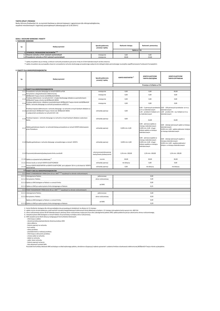 TARYFA OPŁAT I PROWIZJI Banku Ochrony Środowiska S.A. za czynności bankowe w obrocie krajowym i zagranicznym dla mikroprzedsiębiorstw, wspólnot mieszkaniowych i organizacji pozarządowych (obowiązująca od 12.05.2014 r) DZIAŁ I. RACHUNKI BANKOWE i PAKIETY 1. RACHUNKI BANKOWE Lp. Rodzaj czynności Sposób pobierania prowizji / opłaty Rachunek bieżący Rachunek pomocniczy Opłata w PLN 1) 2) 1. OTWARCIE I PROWADZENIE RACHUNKÓW 1.1 Otwarcie rachunku w PLN i walutach wymienialnych 1.2 Prowadzenie rachunku w PLN i walutach wymienialnych 1) 2) miesięcznie miesięcznie 0,00 30,00 0,00 25,00 opłaty nie pobiera się za miesiąc, w którym rachunek prowadzony jest przez mniej niż 10 dni kalendarzowych od dnia otwarcia opłaty nie pobiera się w przypadku otwarcia i prowadzenia rachunku bankowego prowadzonego wyłącznie do obsługi kredytu pomostowego na projekty współfinansowane Funduszami Europejskimi. 2. PAKIETY DLA MIKROPRZEDSIĘBIORSTW Lp. Rodzaj czynności Sposób pobierania prowizji / opłaty KONTO EKOSTARTER 1) KONTO ELASTYCZNE TARYFA OSZCZĘDNA KONTO ELASTYCZNE TARYFA OPTYMALNA Prowizja w %/Opłata w PLN 2.1 PAKIETY DLA MIKROPRZEDSIĘBIORSTW 2.1.1 Prowadzenie rachunku bieżącego w ramach KONTA w PLN Korzystanie z usług bankowości elektronicznej 2.1.2 (BOŚBank24 Twoje e-Konto lub BOŚBank24 iBOSS) Przelewy elektroniczne na rachunki ZUS i Urzędu Skarbowego składane za pośrednictwem 2.1.3 BOŚBank24 Twoje e-Konto lub BOŚBank24 iBOSS Przelewy elektroniczne składane za pośrednictwem BOŚBank24 Twoje e-Konto lub BOŚBank24 2.1.4 iBOSS z rachunku bieżącego na rachunki prowadzone w BOŚ S.A. miesięcznie 0,00 0,00 40,00 miesięcznie 0,00 0,00 0,00 miesięcznie 0,00 0,00 0,00 miesięcznie 0,00 0,00 0,00 0,00 - 5 pierwszych przelewów w m-cu kalendarzowym 1,50 - przelew 6 i kolejne w mcu kalendarzowym Przelewy krajowe elektroniczne z rachunku bieżącego na rachunki w innych bankach składane za 2.1.5 pośrednictwem BOŚBank24 Twoje e-Konto lub BOŚBank24 iBOSS (z wyłączeniem przelewów na rachunki ZUS i US) od każdej operacji 0,00 2.1.6 Przelewy krajowe z rachunku bieżącego na rachunki w innych bankach składane w placówce Banku od każdej operacji 8,00 Wpłaty gotówkowe otwarte na rachunek bieżący prowadzony w ramach KONTA dokonywane 2.1.7 przez Posiadacza 2.1.8 Wypłaty gotówkowe z rachunku bieżącego prowadzonego w ramach KONTA 2.1.9 Przyznanie/odnowienie/podwyższenie limitu overdraft 2.1.10 Opłata za używanie karty debetowej 2) 2.1.11 Zmiana taryfy w ramach KONTA ELASTYCZNEGO 2.1.12 Zmiana KONTA EKOSTARTER na KONTO ELASTYCZNE prze upływem 18 m-cy od otwarcia KONTA EKOSTARTER 0,00 - 100 pierwszych przelewów w m-cu kalendarzowym 1,00 - przelew 101 - szy i kolejne w m-cu kalendarzowym 16,00 16,00 0,30% min. 6,00 0,00 - pierwsza wpłata w miesiącu kalendarzowym 0,30% min. 6,00 - druga i kolejne wpłaty w miesiącu kalendarzowym 0,00 - dziesięć pierwszych wpłat w miesiącu kalendarzowym 0,30% min. 6,00 - wpłata jedenasta i kolejne w miesiącu kalendarzowym od każdej operacji 0,30% min. 6,00 0,00 - pierwsza wypłata w miesiącu kalendarzowym 0,30% min. 6,00 - druga i kolejne wypłaty w miesiącu kalendarzowym 0,00 - dziesięć pierwszych wypłat w miesiącu kalendarzowym 0,30% min. 6,00 - wypłata jedenasta i kolejne w miesiącu kalendarzowym od przyznanej/odnowionej kwoty/kwoty podwyższenia 1,5% min. 100,00 1,5% min. 100,00 1,5% min. 100,00 rocznie 30,00 30,00 30,00 od każdej operacji nie dotyczy 0,00 0,00 od każdej operacji 0,00 nie dotyczy nie dotyczy od każdej operacji 2.2 PAKIETY SMS DLA MIKROPRZEDSIĘBIORCÓW 2.2.1 PAKIET STANDARDOWY FIRMA (limit 20 szt. SMS3) 4) 5) wysyłanych w okresie rozliczeniowym) 2.2.1.1 Udostępnianie Pakietu jednorazowo 0,00 2.2.1.2 Korzystanie z Pakietu okres rozliczeniowy 5,00 0,00 2.2.1.3 Oplata za SMS dostępne w Pakiecie w ramach limitu od SMS 0,25 2.2.1.3 Opłata za SMS po wykorzystaniu limitu dostępnego w Pakiecie 2.2.2 PAKIET ROZSZERZONY FIRMA (limit 40 szt. SMS3) 4) 5) wysyłanych w okresie rozliczeniowym) 2.2.2.1 Udostępnianie Pakietu jednorazowo 0,00 2.2.2.2 Korzystanie z Pakietu okres rozliczeniowy 8,50 Oplata za SMS dostępne w Pakiecie w ramach limitu 2.2.2.3 Opłata za SMS po wykorzystaniu limitu dostępnego w Pakiecie od SMS 0,00 0,20 1) Konto EkoStarter dostępne dla mikroprzedsiębiorców prowadzących działalność nie dłużej niż 12 miesięcy 2) opłata roczna nie jest pobierana, jeżeli wartość transakcji bezgotówkowych dokonanych kartą debetową w każdym z 12 miesięcy (od wydania karty) wynosi min. 400 PLN 3) okres rozliczeniowy wynosi 30 dni kalendarzowych; pierwszy okres rozliczeniowy rozpoczyna się w dniu udostępnienia pakietu SMS; opłata pobierana jest po zakończeniu okresu rozliczeniowego, 4) niewykorzystane SMS dostępne w ramach Pakietu nie przechodzą na kolejny okres rozliczeniowy, 5) SMS wysyłane przez Bank dotyczą następujących komunikatów tekstowych: - informacja o saldzie - zlecenie przelewu/potwierdzenie złożenia przelewu SMS - dane odbiorcy - historia operacji na rachunku - kurs waluty - status przelewu - powiadomienie o realizacji przelewu - informacja o odrzuceniu przelewu - zmiana salda na rachunku - debet na rachunku - saldo i dane rachunku - historia operacji na karcie - lista aktywnych symboli SMS; Pozostałe komunikaty tekstowe SMS wchodzące w skład wybranego pakietu, określone w Dyspozycji nadania uprawnień i ustalenia limitów w bankowości elektronicznej BOŚBank24 Twoje e-Konto są bezpłatne. 3. PAKIETY DLA WSPÓLNOT MIESZKANIOWYCH I ZARZĄDCÓW Lp. Rodzaj czynności Sposób pobierania prowizji / opłaty KONTO WSPÓLNOTA KONTO WSPÓLNOTA PLUS KONTO ZARZĄDCA Prowizja w %/Opłata w PLN 3.1 PAKIETY DLA WSPÓLNOT MIESZKANIOWYCH I ZARZĄDCÓW 3.1.1 Prowadzenie rachunku bieżącego w złotych w ramach KONTA1 3.1.2 Prowadzenie rachunku pomocniczego w PLN Korzystanie z usług bankowości elektronicznej 3.1.3 (BOŚBank24 Twoje e-Konto lub BOŚBank24 