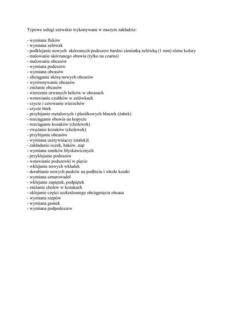Typowe usługi szewskie wykonywane w naszym zakładzie: - wymiana fleków - wymiana zelówek - podklejanie nowych skórzanych podeszew bardzo cieniutką zelówką (1 mm) różne kolory - malowanie skórzanego obuwia (tylko na czarno) - malowanie obcasów - wymiana podeszew - wymiana obcasów - obciąganie skórą nowych obcasów - wyrównywanie obcasów - zniżanie obcasów - wiercenie urwanych bolców w obcasach - wstawianie czubków w zelówkach - szycie i cerowanie wierzchów - szycie łatek - przybijanie metalowych i plastikowych blaszek (żabek) - rozciąganie obuwia na kopycie - rozciąganie kozaków (cholewek) - zwężanie kozaków (cholewek) - przybijanie obcasów - wymiana usztywniaczy (stalek)l. - zakładanie oczek, haków, nap - wymiana zamków błyskawicznych - przyklejanie podeszew - wstawianie podszewki w pięcie - wklejanie nowych wkładek - dorabianie nowych pasków na podbiciu i wkoło kostki - wymiana sznurowadeł - wklejanie zapiętek, podpiętek - zniżanie cholew w kozakach - oklejanie części uszkodzonego obciągnięcia obcasa - wymiana rzepów - wymiana gumek - wymiana podpodeszew
