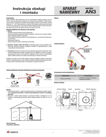Aparat nawiewny Instrukcja obsługi i montażu Przeznaczenie Aparat nawiewny AN3 przeznaczony jest do rozprowadzenia ciepłego powietrza (max do 150oC) z kapy nad paleniskiem kominkowym do pomieszczeń mieszkalnych. Posiada odizolowany termicznie i akustycznie wentylator nadmuchujący powietrze oraz termostat o zakresie nastaw od 10 - 150oC. Gdy temperatura w kapie kominka osiągnie nastawioną wartość aparat uruchamia się automatycznie wymuszając przepływ ciepłego powietrza, poniżej tej temperatury aparat samoczynnie się wyłącza (np. gdy w kominku się nie pali). wersja: AN3 Zdjęcie: Elementy dodatkowe (nie wliczone w cenę aparatu): 1. Bypass - zabezpiecza aparat nawiewny przed przegrzaniem: - ogranicza temperaturę gorącego powietrza płynącego z kominka przez zassanie dodatkowego (chłodnego) powietrza z otoczenia, - odcina przepływ gorącego powietrza do niepracującego (np. z powodu braku prądu) aparatu nawiewnego, - filtruje gorące powietrze, - podnosi sprawność systemu ogrzewania kominowego. Zasadza działania: 2. Regulator obrotów silnika RO-TR100 umożliwiający płynną zmianę prędkości obrotowej, daje możliwość ustawienia wydajności stosownie do zapotrzebowania na ciepło w ogrzewanych pomieszczeniach. 3.Termostat przeznaczony do sterowania pracą elektrycznego aparatu nawiewnego. Zastosowanie dodatkowego termostatu wymagane jest, gdy odległość od kominka do aparatu nawiewnego jest duża lub przed aparatem znajduje się zawór zwrotny uniemożliwiający dopływ ciepłego powietrza do czujnika zamontowanego w aparacie nawiewnym. Dodatkowy termostat lub RO-TR100 podłącza elektryk posiadający stosowne uprawnienia, zgodnie z instrukcją producenta. Aby zapewnić prawidłowe działanie dodatkowego termostatu, należy ustawić minimalną wartość na termostacie w aparacie nawiewnym. Schemat podłączenia elementów dodatkowych do aparatu nawiewnego: Zastosowanie wersji materiałowych: Zastosowanie blacha ocynkowana Przeznaczenie - wentylacja nawiewno-wywiewna - ogrzewanie powietrza Wymiary i budowa: Montaż: 1. Umiejscowienie aparatu - zapewnić wentylację silnika, nie zabudowywać aparatu nawiewnego, uszkodzenia powstałe w wyniku nieprawidłowego montażu nie podlegają gwarancji. 2. Ustawienie - ustawić aparat nawiewny na gumowych nóżkach w odległości do 4 m od paleniska, rozmieszczając jednocześnie wyloty ciepłego powietrza nie dalej niż 10 m od aparatu. Aparat nawiewny na poddaszu użytkowym 1 Darco Sp. z o.o. 39-200 Dębica, ul. Metalowców 43 tel.14 680 90 00, fax14 680 90 01 www.darco.com.pl, [email protected] Aparat nawiewny Instrukcja obsługi i montażu Uwaga: W żadnym przypadku aparatu nie wolno montować w kapie kominka, - zabrania się zabudowy aparatu nawiewnego materiałami izolacyjnymi (komora przepływowa aparatu jest izolowana), - aparat należy umieścić w miejscu łatwo dostępnym, w którym będzie zapewniony dopływ powietrza dla odpowiedniej wentylacji silnika, - aparatu nie należy montować w pomieszczeniach o dużej, nienaturalnej wilgotności oraz w miejscach, gdzie może dojść do zalania wodą, - nie wolno załączać aparatu, jeśli w aparacie lub w przewodach rozprowadzających ciepło znajdują się zanieczyszczenia lub jakiekolwiek przedmioty i ciecze, - nie wolno załączać aparatu przy dużym zapyleniu pomieszczenia, w którym znajduje się kominek np. podczas budowy kominka i cięcia piłą elementów z kamienia. wersja: AN3 Schemat elektryczny podłączenia aparatu: 3. Kapa kominka - połączyć rurą elastyczną wylot dystrybutora lub komorę grzewczą z wlotem aparatu nawiewnego (zaleca się zamontowanie pomiędzy tymi elementami bypassu lub zaworu zwrotnego wraz ze skrzynką filtracyjną). 4. Rozprowadzenie powietrza - wylot aparatu podłączyć z układem rozprowadzenia ciepłego powietrza stosując rurę elastyczną oraz potrzebne elementy długościowe, skrzynki rozdzielcze i kształtki. 5. Kratki wylotowe i anemostaty - nie zamykać całkowicie kratek i anemostatów, a jedynie zbilansować ilości napływającego ciepłego powietrza do pomieszczeń. Dla zapewnienia prawidłowej pracy systemu konieczne jest zapewnienie powrotu powietrza do pomieszczenia z kominkiem np. pod drzwiami lub poprzez otwory w drzwiach. Charakterystyka wydajności AN3: 6. Uruchomienie - ustawić minimalną wartość na pokrętle regulatora - na wprost wybitego na aparacie znacznika, co odpowiada załączeniu aparatu przy 10oC. Jeżeli termostat zostanie nastawiony na 50oC, to po osiągnięciu tej temperatury w przewodzie aparat zacznie pracować, a po obniżeniu poniżej 50oC wyłączy się. Parametry techniczne: Wydajność maksymalna 800 m3 / h Moc maksymalna 118 W Napięcie zasilania 230 / 50 V / Hz Bezpiecznik 1 A; 250 V~topikowy szybki; 20x5mm Natężenie 0,6 A Waga 7 kg Zakres nastaw termostatu 10-150 °C Temperatura otoczenia <50 °C Max. temp. czynnika 150 °C Uwaga: Producent zastrzega sobie prawo do zmiany parametrów technicznych, bez wcześniejszego powiadomienia. Wymogi bezpieczeństwa. 1. 2. 3. 4. 5. 6. 7. Każdorazowo przed montażem, przeglądem i konserwacją odłączyć zasilanie elektryczne. Unikać kontaktu kabla zasilania z obudową aparatu lub innymi gorącymi przedmiotami. Chronić przewód zasilania przed przecięciem, rozerwaniem lub wyrwaniem z aparatu. Nie umieszczać aparatu na powierzchni łatwopalnej i w otoczeniu substancji (materiałów) łatwopalnych. Nie przyłączać aparatu bez wyposażenia kominka w kratki dekompresyjne (kratki te nie mogą być przysłaniane na przykład żaluzją). Stosować przewody powietrzne izolowane, unikając jednocześnie dużych załamań powodujących zmniejszenie wydajności nawiewu. Niniejszy sprzęt nie jest przeznaczony do użytkowania przez osoby (w tym dzieci) o ograniczonej zdolności fizycznej, czuciowej lub psychicznej, lub osoby nie mające doświadczenia lub znajomości sprzętu, chyba że odbywa się to pod nadzorem i zgodnie z instrukcją u