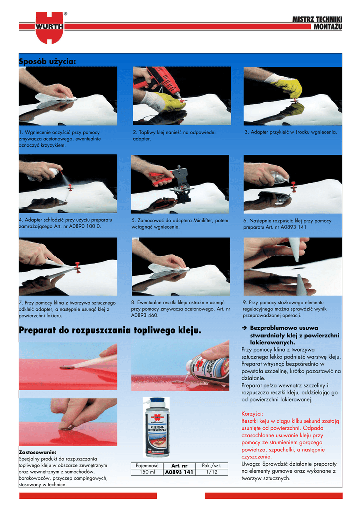 Sposób użycia: 1. Wgniecenie oczyścić przy pomocy zmywacza acetonowego, ewentualnie oznaczyć krzyzykiem. 2. Topliwy klej nanieść na odpowiedni adapter. 3. Adapter przykleić w środku wgniecenia. 4. Adapter schłodzić przy użyciu preparatu zamrażającego Art. nr A0890 100 0. 5. Zamocować do adaptera Minilifter, potem wciągnąć wgniecenie. 6. Następnie rozpuścić klej przy pomocy preparatu Art. nr A0893 141 7. Przy pomocy klina z tworzywa sztucznego odkleić adapter, a następnie usunąć klej z powierzchni lakieru. 8. Ewentualne resztki kleju ostrożnie usunąć przy pomocy zmywacza acetonowego. Art. nr A0893 460. 9. Przy pomocy stożkowego elementu regulacyjnego można sprawdzić wynik przeprowadzonej operacji. Preparat do rozpuszczania topliwego kleju. Zastosowanie: Specjalny produkt do rozpuszczania topliwego kleju w obszarze zewnętrznym oraz wewnętrznym z samochodów, barakowozów, przyczep campingowych, stosowany w technice. Pojemność 150 ml Art. nr A0893 141 ➔ Bezproblemowo usuwa stwardniały klej z powierzchni lakierowanych. Przy pomocy klina z tworzywa sztucznego lekko podnieść warstwę kleju. Preparat wtrysnąć bezpośrednio w powstała szczelinę, krótko pozostawić na działanie. Preparat pełza wewnątrz szczeliny i rozpuszcza resztki kleju, oddzielając go od powierzchni lakierowanej. Pak./szt. 1/12 Korzyści: Resztki keju w ciągu kilku sekund zostają usunięte od powierzchni. Odpada czasochłonne usuwanie kleju przy pomocy ze strumieniem gorącego powietrza, szpachelki, a następnie czyszczenie. Uwaga: Sprawdzić działanie preparaty na elementy gumowe oraz wykonane z tworzyw sztucznych.