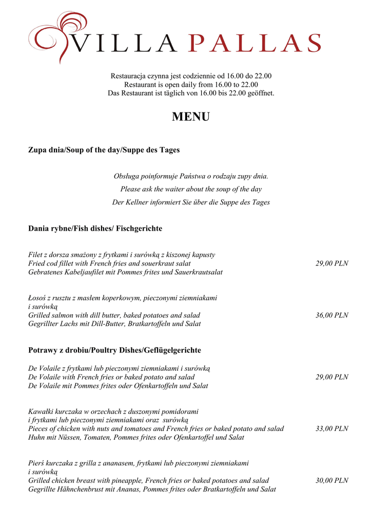 Restauracja czynna jest codziennie od 16.00 do 22.00 Restaurant is open daily from 16.00 to 22.00 Das Restaurant ist täglich von 16.00 bis 22.00 geöffnet. MENU Zupa dnia/Soup of the day/Suppe des Tages Obsługa poinformuje Państwa o rodzaju zupy dnia. Please ask the waiter about the soup of the day Der Kellner informiert Sie über die Suppe des Tages Dania rybne/Fish dishes/ Fischgerichte Filet z dorsza smażony z frytkami i surówką z kiszonej kapusty Fried cod fillet with French fries and souerkraut salat Gebratenes Kabeljaufilet mit Pommes frites und Sauerkrautsalat Łosoś z rusztu z masłem koperkowym, pieczonymi ziemniakami i surówką Grilled salmon with dill butter, baked potatoes and salad Gegrillter Lachs mit Dill-Butter, Bratkartoffeln und Salat 29,00 PLN 36,00 PLN Potrawy z drobiu/Poultry Dishes/Geflügelgerichte De Volaile z frytkami lub pieczonymi ziemniakami i surówką De Volaile with French fries or baked potato and salad De Volaile mit Pommes frites oder Ofenkartoffeln und Salat Kawałki kurczaka w orzechach z duszonymi pomidorami i frytkami lub pieczonymi ziemniakami oraz surówką Pieces of chicken with nuts and tomatoes and French fries or baked potato and salad Huhn mit Nüssen, Tomaten, Pommes frites oder Ofenkartoffel und Salat Pierś kurczaka z grilla z ananasem, frytkami lub pieczonymi ziemniakami i surówką Grilled chicken breast with pineapple, French fries or baked potatoes and salad Gegrillte Hähnchenbrust mit Ananas, Pommes frites oder Bratkartoffeln und Salat 29,00 PLN 33,00 PLN 30,00 PLN Kurczak pieczony glazurowany miodem frytkami lub pieczonymi ziemniakami i surówką Glazed roasted chicken with honey French fries or baked potatoes and salad Gebratenes Hähnchen mit Honig glasiert, Pommes frites oder Bratkartoffeln und Salat 28,00 PLN Potrawy z wieprzowiny/Pork dishes/Schweinefleisch Gerichte Kotlet schabowy panierowany z zapiekanymi ziemniakami i kapustą zasmażaną Breaded pork chop with mashed potatoes and fried cabbage Paniertes Schweinsschnitzel mit Kartoffelpüree und gebratenem Kohl 28,00 PLN Żeberka w sosie własnym z pieczonymi ziemniakami lub frytkami i surówką Spare ribs with gravy, mashed potatoes and salad Spare Ribs mit Soße, Kartoffelpüree and Salat 32,00 PLN Karkówka grillowana po grecku z tzacykami, pieczonymi ziemniakami lub frytkami Grilled pork neck with Greek tzatziki, baked potato or French fries Gegrillter Schopfbraten mit griechischem Tzaziki, Ofenkartoffeln oder Pommes frites Golonka jaśkowa w piwie z grochowym puree, z sosem chrzanowym oraz kapustą zasmażaną Knuckle in beer with mashed peas with horseradish sauce and fried cabbage In Bier mariniertes Eisbein mit Erbsenpüree, Meerrettichsauce und Kraut 32,00 PLN 10,00 PLN/100 g Potrawy z wołowiny/Beef dishes/ Rindfleisch Gerichte Zrazy wołowe zawijane z kaszą gryczaną i korniszonem Beef wrapped with buckwheat and gherkin Rindsroulade mit Buchweizen und Gewürzgurke 32,00 PLN Wołowina na dziko z pampuchami i zasmażanymi buraczkami Roastbeef with dumplings and fried beetroot Rindsbraten mit Knödel und gebratener Rote Beete 31,00 PLN Dania wegetariańskie/Vegetarian/Vegetarisch Ser Camembert zapiekany w sosie porzeczkowo-chrzanowym z sałatką owocową Camembert cheese baked in a horseradish-blackcurrant sauce and fruit salad Camembert gebacken in einer Meerrettich-Johannisbeersauce und Obstsalat 25,00 PLN Sałatka warzywna z serem feta, pomidorami, cebulą, oliwkami i sosem winegret Vegetable salad with feta cheese, tomatoes, onion, olives and vinaigrette Gemüsesalat mit Schafskäse, Tomaten, Zwiebeln, Olivien und Vinagrette 18,00 PLN Makarony/Pasta Spaghetti bolognese 25,00 PLN Pene z owocami morza, suszonymi pomidorami i kaparami Penne with seafood, sun-dried tomato’s and capers Penne mit Meeresfrüchten, getrockneten Tomaten und Kapern 38,00 PLN Desery/Desserts Puchar lodowy z owocami Ice cream with fruits Eis mit Früchte 16,00 PLN Owoce w bitej śmietanie Fruit whipped cream Früchte mit Schlagsahne 12,00 PLN Napoje gorące/Hot drinks/ Heiße Getränke Kawa/Coffee/Kaffee 7,00 PLN Cappuccino 7,00 PLN Herbata/Tea/Tee 5,00 PLN Zielona herbata/Green tea/ Grüner Tee 6,00 PLN Herbata owocowa/ Fruit tea/ Früchtetee 6,00 PLN Napoje zimne/Cold drinks/ kalte Getränke Sok owocowy/ Fruit juice/Fruchtsaft 6,00 PLN/250 ml Woda mineralna/Mineral water/ Mineralwasser 5,00 PLN/250 ml Coca Cola 6,00 PLN/300 ml Fanta 6,00 PLN/300 ml Sprite 6,00 PLN/300 ml Tonic 6,00 PLN/300 ml Napój energetyczny Tiger/ Energy drinks/ Energy Drink 6,00 PLN/250 ml