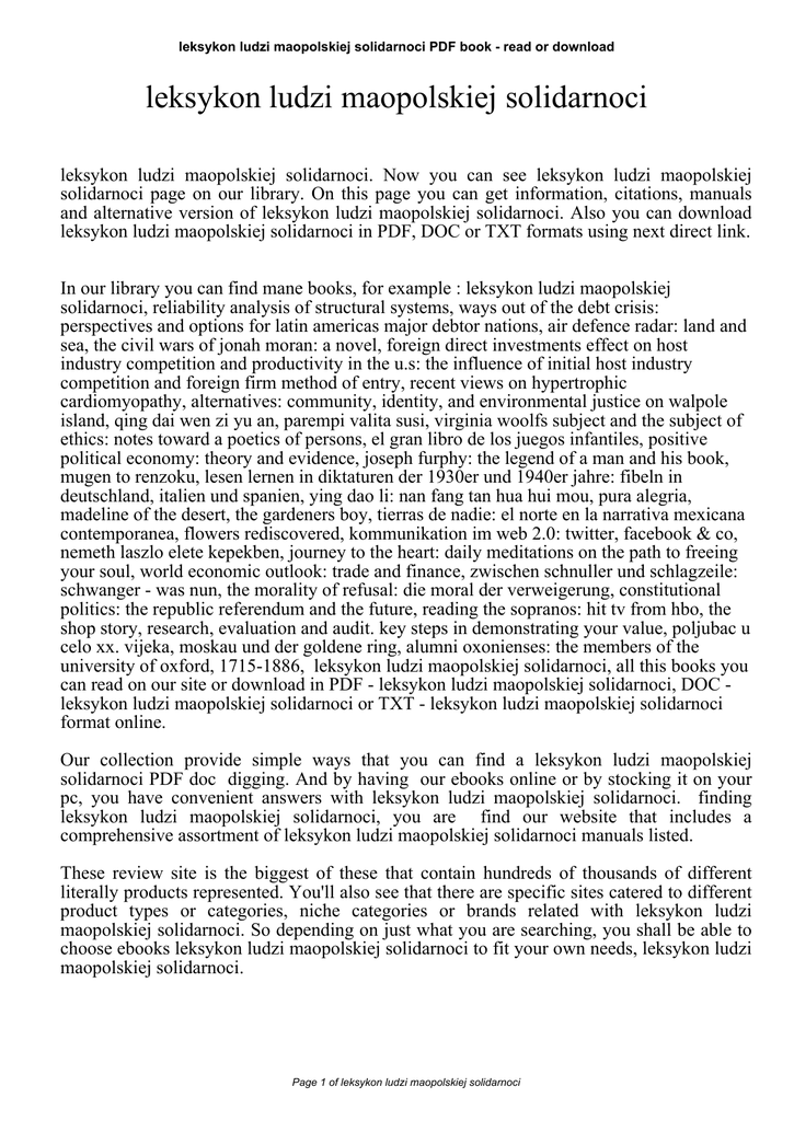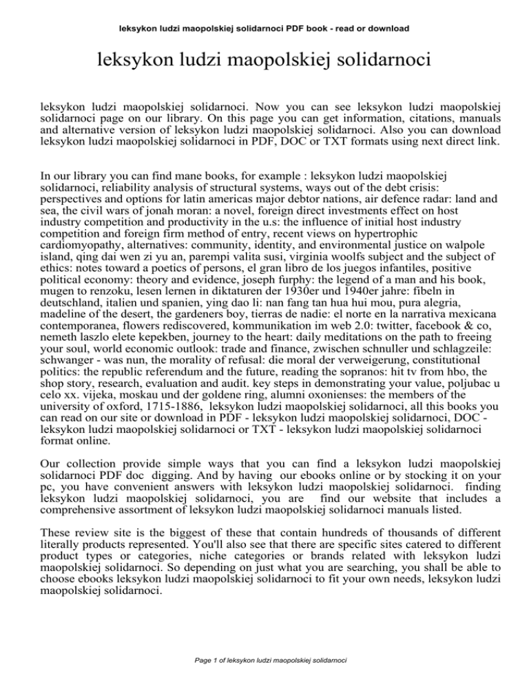 leksykon ludzi maopolskiej solidarnoci PDF book - read or download leksykon ludzi maopolskiej solidarnoci leksykon ludzi maopolskiej solidarnoci. Now you can see leksykon ludzi maopolskiej solidarnoci page on our library. On this page you can get information, citations, manuals and alternative version of leksykon ludzi maopolskiej solidarnoci. Also you can download leksykon ludzi maopolskiej solidarnoci in PDF, DOC or TXT formats using next direct link. In our library you can find mane books, for example : leksykon ludzi maopolskiej solidarnoci, reliability analysis of structural systems, ways out of the debt crisis: perspectives and options for latin americas major debtor nations, air defence radar: land and sea, the civil wars of jonah moran: a novel, foreign direct investments effect on host industry competition and productivity in the u.s: the influence of initial host industry competition and foreign firm method of entry, recent views on hypertrophic cardiomyopathy, alternatives: community, identity, and environmental justice on walpole island, qing dai wen zi yu an, parempi valita susi, virginia woolfs subject and the subject of ethics: notes toward a poetics of persons, el gran libro de los juegos infantiles, positive political economy: theory and evidence, joseph furphy: the legend of a man and his book, mugen to renzoku, lesen lernen in diktaturen der 1930er und 1940er jahre: fibeln in deutschland, italien und spanien, ying dao li: nan fang tan hua hui mou, pura alegria, madeline of the desert, the gardeners boy, tierras de nadie: el norte en la narrativa mexicana contemporanea, flowers rediscovered, kommunikation im web 2.0: twitter, facebook & co, nemeth laszlo elete kepekben, journey to the heart: daily meditations on the path to freeing your soul, world economic outlook: trade and finance, zwischen schnuller und schlagzeile: schwanger - was nun, the morality of refusal: die moral der verweigerung, constitutional politics: the republic referendum and the future, reading the sopranos: hit tv from hbo, the shop story, research, evaluation and audit. key steps in demonstrating your value, poljubac u celo xx. vijeka, moskau und der goldene ring, alumni oxonienses: the members of the university of oxford, 1715-1886, leksykon ludzi maopolskiej solidarnoci, all this books you can read on our site or download in PDF - leksykon ludzi maopolskiej solidarnoci, DOC leksykon ludzi maopolskiej solidarnoci or TXT - leksykon ludzi maopolskiej solidarnoci format online. Our collection provide simple ways that you can find a leksykon ludzi maopolskiej solidarnoci PDF doc digging. And by having our ebooks online or by stocking it on your pc, you have convenient answers with leksykon ludzi maopolskiej solidarnoci. finding leksykon ludzi maopolskiej solidarnoci, you are find our website that includes a comprehensive assortment of leksykon ludzi maopolskiej solidarnoci manuals listed. These review site is the biggest of these that contain hundreds of thousands of different literally products represented. You'll also see that there are specific sites catered to different product types or categories, niche categories or brands related with leksykon ludzi maopolskiej solidarnoci. So depending on just what you are searching, you shall be able to choose ebooks leksykon ludzi maopolskiej solidarnoci to fit your own needs, leksykon ludzi maopolskiej solidarnoci. Page 1 of leksykon ludzi maopolskiej solidarnoci