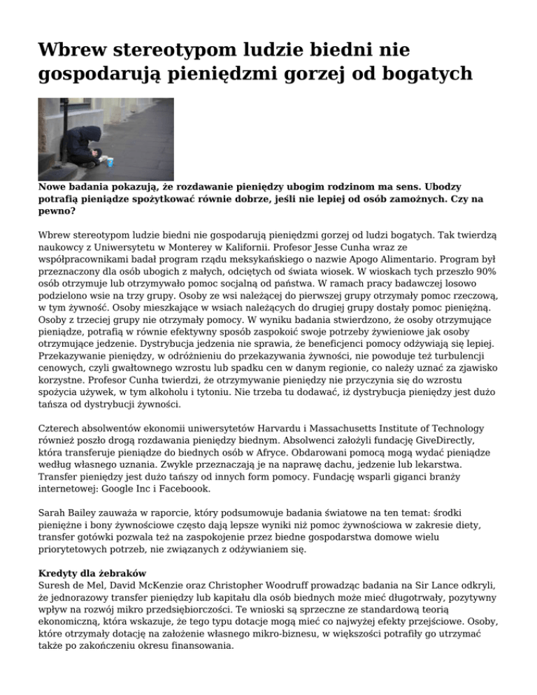 Wbrew stereotypom ludzie biedni nie gospodarują pieniędzmi gorzej od bogatych Nowe badania pokazują, że rozdawanie pieniędzy ubogim rodzinom ma sens. Ubodzy potrafią pieniądze spożytkować równie dobrze, jeśli nie lepiej od osób zamożnych. Czy na pewno? Wbrew stereotypom ludzie biedni nie gospodarują pieniędzmi gorzej od ludzi bogatych. Tak twierdzą naukowcy z Uniwersytetu w Monterey w Kalifornii. Profesor Jesse Cunha wraz ze współpracownikami badał program rządu meksykańskiego o nazwie Apogo Alimentario. Program był przeznaczony dla osób ubogich z małych, odciętych od świata wiosek. W wioskach tych przeszło 90% osób otrzymuje lub otrzymywało pomoc socjalną od państwa. W ramach pracy badawczej losowo podzielono wsie na trzy grupy. Osoby ze wsi należącej do pierwszej grupy otrzymały pomoc rzeczową, w tym żywność. Osoby mieszkające w wsiach należących do drugiej grupy dostały pomoc pieniężną. Osoby z trzeciej grupy nie otrzymały pomocy. W wyniku badania stwierdzono, że osoby otrzymujące pieniądze, potrafią w równie efektywny sposób zaspokoić swoje potrzeby żywieniowe jak osoby otrzymujące jedzenie. Dystrybucja jedzenia nie sprawia, że beneficjenci pomocy odżywiają się lepiej. Przekazywanie pieniędzy, w odróżnieniu do przekazywania żywności, nie powoduje też turbulencji cenowych, czyli gwałtownego wzrostu lub spadku cen w danym regionie, co należy uznać za zjawisko korzystne. Profesor Cunha twierdzi, że otrzymywanie pieniędzy nie przyczynia się do wzrostu spożycia używek, w tym alkoholu i tytoniu. Nie trzeba tu dodawać, iż dystrybucja pieniędzy jest dużo tańsza od dystrybucji żywności. Czterech absolwentów ekonomii uniwersytetów Harvardu i Massachusetts Institute of Technology również poszło drogą rozdawania pieniędzy biednym. Absolwenci założyli fundację GiveDirectly, która transferuje pieniądze do biednych osób w Afryce. Obdarowani pomocą mogą wydać pieniądze według własnego uznania. Zwykle przeznaczają je na naprawę dachu, jedzenie lub lekarstwa. Transfer pieniędzy jest dużo tańszy od innych form pomocy. Fundację wsparli giganci branży internetowej: Google Inc i Faceboook. Sarah Bailey zauważa w raporcie, który podsumowuje badania światowe na ten temat: środki pieniężne i bony żywnościowe często dają lepsze wyniki niż pomoc żywnościowa w zakresie diety, transfer gotówki pozwala też na zaspokojenie przez biedne gospodarstwa domowe wielu priorytetowych potrzeb, nie związanych z odżywianiem się. Kredyty dla żebraków Suresh de Mel, David McKenzie oraz Christopher Woodruff prowadząc badania na Sir Lance odkryli, że jednorazowy transfer pieniędzy lub kapitału dla osób biednych może mieć długotrwały, pozytywny wpływ na rozwój mikro przedsiębiorczości. Te wnioski są sprzeczne ze standardową teorią ekonomiczną, która wskazuje, że tego typu dotacje mogą mieć co najwyżej efekty przejściowe. Osoby, które otrzymały dotację na założenie własnego mikro-biznesu, w większości potrafiły go utrzymać także po zakończeniu okresu finansowania. Tradycyjne banki na całym świecie nie udzielają kredytów i pożyczek osobom biednym. Biedacy, argumentują, nie będą w stanie spłacać należnych bankowi rat. Tymczasem w Bangladeszu powstał Grameen Bank (w dosłownym tłumaczeniu bank wiejski). Udziela on kredytów w wysokości około 200 dolarów, na ogół na rozpoczęcie działalności gospodarczej osobom biednym, nawet żebrakom. Bank twierdzi, że jego wskaźnik spłaty zadłużenia wynosi 98%, a więc jest wyższy od wskaźników banków udzielających kredytów klasie średniej. Czy program sprawdziłby się w Polsce? Czy transfer pieniędzy sprawdziłoby się w Polsce? Rzecznik prasowy Caritas Paweł Kęska stwierdza: problem przekazywania środków finansowych w Polsce wiąże się również z ryzykiem wspierania uzależnień u osób mających trudności socjalne, ale zarazem psychologiczne i społeczne. Regularny dostęp do środków finansowych, których człowiek sam poprzez pracę sobie nie zapewni, może deprawować i powodować szybszą degradację społeczną. Wsparcie takie ma sens w obszarach, które obejmują ubóstwo oraz stabilną, pozytywną postawę społeczną. Pomoc w postaci przekazywania pieniędzy ma ograniczony zakres działania. Nie zapobiega wojnom, głodowi, anomalią pogodowym. Działa w grupach osób, które choć są biedne postępują etycznie. Ale co zrobić, by ludzi nauczyć etyki? Andrzej Berezowski fot. morguefile.com