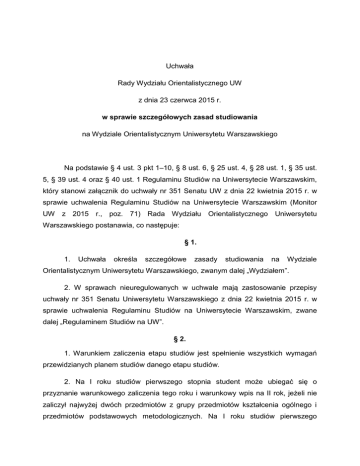 Uchwała Rady Wydziału Orientalistycznego UW z dnia 23 czerwca 2015 r. w sprawie szczegółowych zasad studiowania na Wydziale Orientalistycznym Uniwersytetu Warszawskiego Na podstawie § 4 ust. 3 pkt 1–10, § 8 ust. 6, § 25 ust. 4, § 28 ust. 1, § 35 ust. 5, § 39 ust. 4 oraz § 40 ust. 1 Regulaminu Studiów na Uniwersytecie Warszawskim, który stanowi załącznik do uchwały nr 351 Senatu UW z dnia 22 kwietnia 2015 r. w sprawie uchwalenia Regulaminu Studiów na Uniwersytecie Warszawskim (Monitor UW z 2015 r., poz. 71) Rada Wydziału Orientalistycznego Uniwersytetu Warszawskiego postanawia, co następuje: § 1. 1. Uchwała określa szczegółowe zasady studiowania na Wydziale Orientalistycznym Uniwersytetu Warszawskiego, zwanym dalej „Wydziałem”. 2. W sprawach nieuregulowanych w uchwale mają zastosowanie przepisy uchwały nr 351 Senatu Uniwersytetu Warszawskiego z dnia 22 kwietnia 2015 r. w sprawie uchwalenia Regulaminu Studiów na Uniwersytecie Warszawskim, zwane dalej „Regulaminem Studiów na UW”. § 2. 1. Warunkiem zaliczenia etapu studiów jest spełnienie wszystkich wymagań przewidzianych planem studiów danego etapu studiów. 2. Na I roku studiów pierwszego stopnia student może ubiegać się o przyznanie warunkowego zaliczenia tego roku i warunkowy wpis na II rok, jeżeli nie zaliczył najwyżej dwóch przedmiotów z grupy przedmiotów kształcenia ogólnego i przedmiotów podstawowych metodologicznych. Na I roku studiów pierwszego stopnia w wypadku niezaliczenia przedmiotu z grupy przedmiotów podstawowych orientalistycznych i specjalnościowych uzyskanie warunkowego zaliczenia tego roku i warunkowego wpisu na II rok jest niemożliwe. Nie dotyczy to Studium Stosunków Międzykulturowych i Studium Europy Wschodniej, gdzie student na I roku studiów pierwszego stopnia może ubiegać się o przyznanie warunkowego zaliczenia tego roku i warunkowy wpis na II rok, jeżeli nie zaliczył najwyżej dwóch dowolnych przedmiotów. 3. Na II roku studiów pierwszego stopnia i na I roku studiów II stopnia student może ubiegać się o przyznanie warunkowego zaliczenia danego etapu studiów i warunkowy wpis na kolejny etap studiów, jeżeli nie zaliczył najwyżej dwóch przedmiotów, z zastrzeżeniem, że w poszczególnych jednostkach Wydziału niemożliwe jest uzyskanie warunkowego zaliczenia danego etapu studiów i warunkowego wpisu na kolejny etap studiów w wypadku niezaliczenia przedmiotów określonych w uchwale Rady Wydziału. 4. Wniosek o warunkowe zaliczenie etapu studiów i warunkowy wpis na kolejny etap studiów wraz z uzasadnieniem składa się nie później niż 7 dni po zakończeniu poprawkowej sesji egzaminacyjnej. 5. Decyzję o przyznaniu warunkowego zaliczenia etapu studiów i warunkowym wpisie na kolejny etap studiów podejmuje Dziekan, biorąc pod uwagę w szczególności opinię kierownika odpowiedniej jednostki Wydziału. § 3. 1. Osoba skreślona z listy studentów może ubiegać się o wznowienie studiów. 2. Podjęcie studiów w trybie wznowienia może nastąpić od II roku studiów pierwszego stopnia i od I roku studiów drugiego stopnia. 3. Wznowienie następuje na tych samych studiach, z których student został skreślony, pod warunkiem, że studia te są nadal prowadzone. W przypadku wygaśnięcia studiów Dziekan może podjąć decyzję o wznowieniu na innych studiach utworzonych w wyniku przekształcenia studiów wygasłych. 4. O wznowienie studiów stacjonarnych może się ubiegać wyłącznie były student studiów stacjonarnych lub były student studiów niestacjonarnych, które nie są już prowadzone. 5. Wniosek o wznowienie studiów wraz z uzasadnieniem składa się nie później niż 14 dni przed rozpoczęciem roku akademickiego. Nie dotyczy to osób, które spełniły wszystkie wymagania określone w programie kształcenia, z wyjątkiem zaliczenia ostatniego cyklu seminarium dyplomowego z powodu niezłożenia pracy dyplomowej przewidzianej w programie kształcenia i w okresie nieprzekraczającym dwóch lat od daty skreślenia z listy studentów ubiegają się o wznowienie studiów bez obowiązku uzupełniania różnic programowych; osoby takie mogą złożyć wniosek o wznowienie studiów również w trakcie roku akademickiego. 6. Osoba, która ubiega się o wznowienie studiów po przerwie, zobowiązana jest przystąpić do egzaminu sprawdzającego z języka kierunkowego/języków kierunkowych, chyba że w poprzednim roku akademickim przebywała w regionie będącym przedmiotem studiów na danym kierunku i może ten pobyt udokumentować. Nie dotyczy to osób, które spełniły wszystkie wymagania określone w programie kształcenia, z wyjątkiem zaliczenia ostatniego cyklu seminarium dyplomowego z powodu niezłożenia pracy dyplomowej przewidzianej w programie kształcenia i w okresie nieprzekraczającym dwóch lat od daty skreślenia z listy studentów ubiegają się o wznowienie studiów bez obowiązku uzupełniania różnic programowych. 7. Decyzję w sprawie wznowienia studiów podejmuje Dziekan, biorąc pod uwagę w szczególności: 1) wynik egzaminu sprawdzającego z języka kierunkowych; 2) opinię kierownika odpowiedniej jednostki Wydziału; 3) opinię kierującego pracą dyplomową. kierunkowego/języków § 4. 1. Student po zaliczeniu co najmniej I roku studiów, który uzyskał średnią ocenę dotychczas zaliczonych etapów studiów nie niższą niż 4,50, może ubiegać się o zgodę Dziekana na podjęcie indywidualnego toku studiów (ITS). 2. Opiekunem naukowym dla studenta studiującego według ITS powinien być nauczyciel akademicki mający co najmniej stopień doktora. 3. Wniosek o ITS wraz z uzasadnieniem oraz wskazaniem proponowanego opiekuna naukowego składa się nie później niż 14 dni przed rozpoczęciem roku akademickiego. Do wniosku dołącza się projekt programu kształcenia i planu studiów, który miałby być realizowany w ramach ITS, ustalony przez studenta wraz z proponowanym opiekunem tak, aby spełni