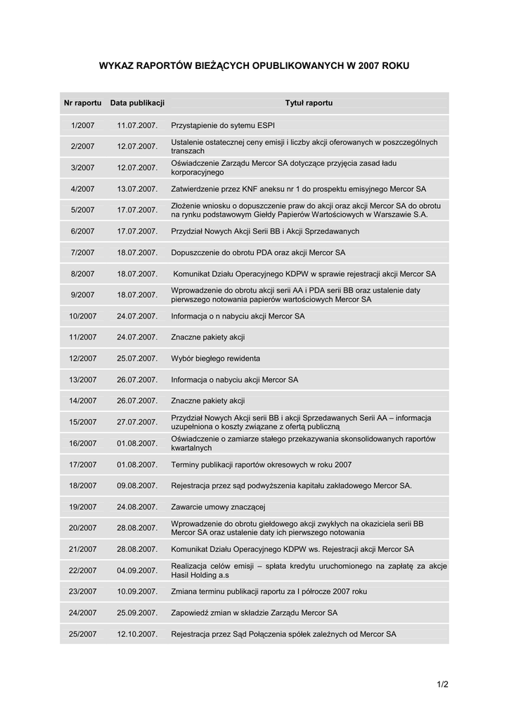WYKAZ RAPORTÓW BIEśĄCYCH OPUBLIKOWANYCH W 2007 ROKU Nr raportu Data publikacji Tytuł raportu 1/2007 11.07.2007. Przystąpienie do sytemu ESPI 2/2007 12.07.2007. Ustalenie ostatecznej ceny emisji i liczby akcji oferowanych w poszczególnych transzach 3/2007 12.07.2007. Oświadczenie Zarządu Mercor SA dotyczące przyjęcia zasad ładu korporacyjnego 4/2007 13.07.2007. Zatwierdzenie przez KNF aneksu nr 1 do prospektu emisyjnego Mercor SA 5/2007 17.07.2007. ZłoŜenie wniosku o dopuszczenie praw do akcji oraz akcji Mercor SA do obrotu na rynku podstawowym Giełdy Papierów Wartościowych w Warszawie S.A. 6/2007 17.07.2007. Przydział Nowych Akcji Serii BB i Akcji Sprzedawanych 7/2007 18.07.2007. Dopuszczenie do obrotu PDA oraz akcji Mercor SA 8/2007 18.07.2007. Komunikat Działu Operacyjnego KDPW w sprawie rejestracji akcji Mercor SA 9/2007 18.07.2007. Wprowadzenie do obrotu akcji serii AA i PDA serii BB oraz ustalenie daty pierwszego notowania papierów wartościowych Mercor SA 10/2007 24.07.2007. Informacja o n nabyciu akcji Mercor SA 11/2007 24.07.2007. Znaczne pakiety akcji 12/2007 25.07.2007. Wybór biegłego rewidenta 13/2007 26.07.2007. Informacja o nabyciu akcji Mercor SA 14/2007 26.07.2007. Znaczne pakiety akcji 15/2007 27.07.2007. Przydział Nowych Akcji serii BB i akcji Sprzedawanych Serii AA – informacja uzupełniona o koszty związane z ofertą publiczną 16/2007 01.08.2007. Oświadczenie o zamiarze stałego przekazywania skonsolidowanych raportów kwartalnych 17/2007 01.08.2007. Terminy publikacji raportów okresowych w roku 2007 18/2007 09.08.2007. Rejestracja przez sąd podwyŜszenia kapitału zakładowego Mercor SA. 19/2007 24.08.2007. Zawarcie umowy znaczącej 20/2007 28.08.2007. Wprowadzenie do obrotu giełdowego akcji zwykłych na okaziciela serii BB Mercor SA oraz ustalenie daty ich pierwszego notowania 21/2007 28.08.2007. Komunikat Działu Operacyjnego KDPW ws. Rejestracji akcji Mercor SA 22/2007 04.09.2007. Realizacja celów emisji – spłata kredytu uruchomionego na zapłatę za akcje Hasil Holding a.s 23/2007 10.09.2007. Zmiana terminu publikacji raportu za I półrocze 2007 roku 24/2007 25.09.2007. Zapowiedź zmian w składzie Zarządu Mercor SA 25/2007 12.10.2007. Rejestracja przez Sąd Połączenia spółek zaleŜnych od Mercor SA 1/2 26/2007 16.11.2007. Zawarcie umowy i transakcji na łączną wartość umowy znaczącej 27/2007 16.11.2007. Wybór biegłego rewidenta 2/2