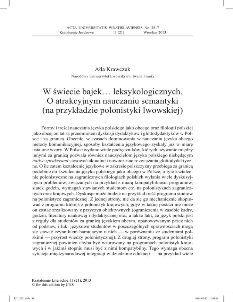 ACTA UNIVERSITATIS WRATISLAVIENSIS No 3517 Kształcenie Językowe 11 (21) Wrocław 2013 Ałła Krawczuk Narodowy Uniwersytet Lwowski im. Iwana Franki W świecie bajek… leksykologicznych. O atrakcyjnym nauczaniu semantyki (na przykładzie polonistyki lwowskiej) Formy i treści nauczania języka polskiego jako obcego oraz filologii polskiej jako obcej od lat są przedmiotem dyskusji dydaktyków i glottodydaktyków w Polsce i za granicą. Obecnie, w czasach dominowania w nauczaniu języka obcego metody komunikacyjnej, sposoby kształcenia językowego zyskały już w miarę ustalone wzory. W Polsce wydano wiele podręczników, których używanie między innymi za granicą pozwala również nauczycielom języka polskiego niebędącym native speakerami stosować aktualne i nowoczesne rozwiązania glottodydaktyczne. O ile zatem kształcenie językowe w zakresie polszczyzny przebiega za granicą podobnie do kształcenia języka polskiego jako obcego w Polsce, o tyle kształcenie polonistyczne na zagranicznych filologiach polskich wyłania wiele dyskusyjnych problemów, związanych na przykład z miarą kompatybilności programów, siatek godzin, wymagań stawianych studentom etc. na polonistykach zagranicznych oraz krajowych. Dyskusje może budzić na przykład treść programu studiów na polonistyce zagranicznej. Z jednej strony, nie da się go mechanicznie skopiować z programu którejś z polonistyk krajowych, gdyż w takiej postaci nie może on zostać zrealizowany z przyczyn obiektywnych (ograniczenia w zasobie kadry, godzin, literatury naukowej i dydaktycznej etc., a także fakt, że język polski jest z reguły dla studentów za granicą językiem obcym, opanowywanym przez nich od podstaw, i luki językowe studentów w poszczególnych sprawnościach mogą się stawać czynnikiem hamującym u nich — w porównaniu ze studentami polskimi — przyrost wiedzy polonistycznej). Z drugiej strony, program polonistyki zagranicznej powinien chyba być wzorowany na programach polonistyk krajowych i w jakimś stopniu musi być z nimi kompatybilny. Tego wymaga obecna sytuacja międzynarodowej integracji w dziedzinie edukacji — na przyklad wiele Kształcenie Literackie 11 (21), 2013 © for this edition by CNS KJ 11(21).indb 41 2014-02-13 11:43:06 42 Ałła Krawczuk osób z Ukrainy kontynuuje dzisiaj studia w Polsce, dlatego dyplomy polonistyk krajowych i zagranicznych powinny być w miarę porównywalne1. Znalezienie najwłaściwszych proporcji w dawkowaniu w programie akademickim „klasycznych” treści polonistycznych oraz materiału, związanego ze specyfiką dydaktyki języka obcego w otoczeniu konkretnego języka będącego dla uczących się językiem rodzimym, jest dla polonistów zagranicznych trudnym zadaniem. Stworzenie dobrego programu wymaga od nauczyciela akademickiego nie tylko głębokiej merytorycznej wiedzy polonistycznej, lecz także dużego doświadczenia w pracy ze studentami, zwłaszcza że osobowość studenta — co możemy obserwować nawet w ciągu ostatniego tylko dziesięciolecia — dynamicznie się zmienia. Dzisiaj przeciętny student z reguły jest bardzo wymagający wobec wykładowcy2 (i mniej wobec siebie), a jednocześnie nastawiony na ludyczny charakter nauki. W sytuacji studiowania filologii polskiej jako obcej chęć nauki atrakcyjnej, wzbogaconej o elementy gry, wynika chyba stąd, że na początku studiów uniwersyteckich studenci mają zajęcia z praktycznej nauki polskiego, które przebiegają zazwyczaj w ciekawych, często zabawowych formach. Przyzwyczajeni do takich zajęć, w czasie których wiedzę czasami „przemyca się” poprzez zabawę, piosenkę, inscenizację etc., w czasie następujących po lektoratowym kursie wykładach i ćwiczeniach językoznawczych — z morfologii, fonetyki, składni, lesykologii i innych — studenci stwierdzają brak atrakcyjności tych zajęć. Na Narodowym Uniwersytecie Lwowskim im. Iwana Franki studenci filologii polskiej — w zdecydowanej większości Ukraińcy, którzy wcześniej z polszczyzną nie mieli kontaktu — przez trzy semestry (około 350–400 godzin) uczą się praktycznej polszczyzny od poziomu zerowego, a dopiero w drugim semestrze drugiego roku studiów rozpoczynają systematyczną naukę gramatyki opisowej języka polskiego3. Cykl przedmiotów językoznawczych na poziomie licencjackim kończą wykłady i ćwiczenia z leksykologii i frazeologii. Początek nauki przedmiotów językoznawczych jest dla większości studentów trudny — nie tyle raczej ze względu na zawartość merytoryczną programu, ile przez swoistą barierę psychologiczną. Pra1 Więcej o obecnym wzroście popularności języka polskiego na Ukrainie, a także o problemie „obcości” języka polskiego na Wschodzie, jak również o zapleczu teoretyczno-metodycznym dydaktyka języka polskiego pracującego z grupami z pierwszym językiem wschodniosłowiańskim piszę w: A. Krawczuk, Od gramatyki do pragmatyki. Problemy polszczyzny na Wschodzie, [w:] Sztuka to rzemiosło. Nauczyć Polski i polskiego, t. 3, red. J. Tambor, A. Achtelik, Katowice 2013, s. 49–65. 2 Por. np. M.A. Packalen, „Maestro” czy „mentor”? (O prowadzeniu prac dyplomowych przez polonistów zagranicznych), [w:] Inne optyki. Nowe programy, nowe metody, nowe technologie w nauczaniu kultury polskiej i języka polskiego jako obcego, red. R. Cudak, J. Tambor, Katowice 2001, s. 69–75; E. Lipińska, Nauczyciel języka polskiego jako obcego / drugiego w Polsce i na obczyźnie, [w:] Nauczanie języka polskiego jako obcego i polskiej kultury w nowej rzeczywistości europejskiej. Materiały z VI Międzynarodowej Konferencji Glottodydaktycznej, red. P. Garncarek, Warszawa 2005, s. 78–87. 3 Dokładniej o osobliwościach studiów polonistycznych we Lwowie zob. np. A. Krawczuk, Kultura języka polskiego w nauczaniu studentów polonistyki lwowskiej, [w:] Polonistyka za granicą. Tradycje i perspektywy, red. A. Kietlińska, Białystok 2012, s. 84–96. Kształcenie 