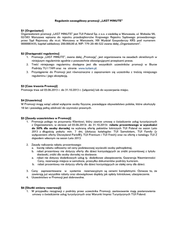 Regulamin szczegółowy promocji „LAST MINUTE” §1 [Organizator] Organizatorem promocji „LAST MINUTE” jest TUI Poland Sp. z o.o. z siedzibą w Warszawie, ul. Wołoska 9A, 02/583 Warszawa wpisana do rejestru przedsiębiorców Krajowego Rejestru Sądowego prowadzonego przez Sąd Rejonowy dla m.st. Warszawy w Warszawie, XIII Wydział Gospodarczy KRS pod numerem 0000083435, kapitał zakładowy 200.000,00 zł, NIP: 779-20-48-522 zwana dalej „Organizatorem”. §2 [Dostępność regulaminu] 1. Promocja „LAST MINUTE”, zwana dalej „Promocją”, jest organizowana na zasadach określonych w niniejszym regulaminie zgodnie z powszechnie obowiązującymi przepisami prawa. 2. Treść niniejszego regulaminu dostępna jest dla wszystkich uczestników promocji w Biurze Podróży TU I TAM oraz na stronie www.tuitam.pl. 3. Przystąpienie do Promocji jest równoznaczne z zapoznaniem się uczestnika z treścią niniejszego regulaminu i jego akceptacją. §3 [Czas trwania Promocji] Promocja trwa od 03.06.2013 r. do 31.10.2013 r. (włącznie) lub do wyczerpania miejsc. §4 [Uczestnicy] W Promocji mogą wziąć udział wyłącznie osoby fizyczne, posiadające obywatelstwo polskie, które ukończyły 18 lat i posiadają pełną zdolność do czynności prawnych. §5 [Zasady uczestnictwa w Promocji] 1. Promocja polega na przyznaniu Klientowi, który zawrze umowę o świadczenie usług turystycznych z Organizatorem, w okresie od 03.06.2013r. do 31.10.2013r. rabatu procentowego w wysokości do 50% dla osoby dorosłej na wybraną ofertę pakietów lotniczych TUI Poland na sezon Lato 2013 z długością pobytu min. 7 dni, (dotyczy katalogów: TUI Samolotem, TUI Family (z wyłączeniem oferty Disneyland Paris®), TUI Premium i TUI Fresh) oraz na ofertę z katalogu TUI Z dojazdem własnym na sezon Lato 2013. 2. Zasady naliczania rabatu procentowego: a. kwotę rabatu odliczamy od ceny podstawowej wycieczki osoby pełnopłatnej. b. rabat procentowy nie dotyczy oferty dla dzieci korzystających ze zniżki procentowej z tytułu dostawki, zniżki dla osoby dorosłej na dostawce. a. rabat nie dotyczy dodatkowych usług tj.: dodatkowe ubezpieczenie, Gwarancja Niezmienności Ceny, rezerwacja miejsca w samolocie, przesyłka dokumentów podróży kurierem. b. rabat procentowy nie dotyczy oferty dla dzieci korzystających ze stałej ceny dla dzieci. 3. Ceny zaprezentowane w systemie rezerwacyjnym są cenami kompletnymi. Oznacza to, że zawierają już wszystkie rabaty oraz obowiązkowe dopłaty jak opłaty lotniskowe, ubezpieczenie. 4. Uczestnictwo w Promocji jest dobrowolne. §6 [Skutki zmiany rezerwacji] 1. W przypadku rezygnacji z podróży przez uczestnika Promocji, zastosowanie mają postanowienia umowy o świadczenie usług turystycznych oraz Warunki Imprez Turystycznych TUI Poland. 2. W przypadku zmian rezerwacji dokonywanych przez uczestnika Promocji już po zarezerwowaniu wycieczki, zastosowanie mają postanowienia umowy o świadczenie usług turystycznych oraz Warunki Imprez Turystycznych TUI Poland. §7 [Reklamacje] 1. Wszystkie roszczenia, reklamacje, uwagi i zastrzeżenia do przebiegu Promocji można składać wyłącznie pisemnie na adres Organizatora: ul. Wołoska 9A, 02-583 Warszawa przez cały czas trwania Promocji, nie później jednak niż w terminie 14 dni od dnia zakończenia Promocji – listem poleconym (o rozpatrzeniu reklamacji decyduje data stempla pocztowego). 2. Reklamacja powinna zawierać: imię, nazwisko, adres, jak również dokładny opis i powód reklamacji. 3. Reklamacje złożone po upływie terminu, o którym mowa w ust. 1 powyżej nie będą rozpatrywane. 4. Reklamacje Organizator rozpatruje w terminie 14 dni od dnia ich otrzymania. Reklamacje będą rozpatrywane w oparciu o postanowienia niniejszego regulaminu. Uczestnik zostanie poinformowany o decyzji Organizatora listem poleconym na adres wskazany w reklamacji. §8 [Postanowienia końcowe] 1. Przystąpienie do udziału w Promocji jest równoznaczne z wyrażeniem zgody na przetwarzanie danych osobowych przez Organizatora zgodnie z przepisami ustawy z dnia 29 sierpnia 1997 r. o ochronie danych osobowych. 2. Administratorem danych osobowych jest Organizator. 3. Organizator informuje uczestników, że ich dane osobowe będą przetwarzane wyłącznie w związku z wykonaniem postanowień niniejszego regulaminu, w celu przeprowadzenia Promocji. 4. Uczestnicy mają prawo dostępu do treści swoich danych osobowych oraz do ich poprawiania. Podanie danych osobowych w celu realizacji Promocji jest dobrowolne, choć niezbędne dla prawidłowego przeprowadzenia Promocji. 5. Niniejszy regulamin wchodzi w życie z dniem 03.06.2013r.