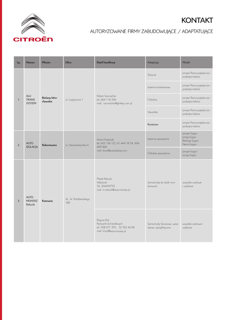 KONTAKT AUTORYZOWANE FIRMY ZABUDOWUJĄCE / ADAPTATUJĄCE Lp. 1. 2. 3. Nazwa ALU TRANS SYSTEM AUTO IZOLACJA AUTO MONTAŻ Rekucki Miasto Bielany Wrocławskie Rakoniewice Katowice Ulica ul. Logistyczna 1 ul. Starowolsztyńska 4 Dział handlowy Adaptacja Model Skrzynia Jumper Rama pojedyncza i podwójna kabina Izoterma kontenerowa Jumper Rama pojedyncza i podwójna kabina Chłodnia Jumper Rama pojedyncza i podwójna kabina Wywrotka Jumper Rama pojedyncza i podwójna kabina Kontener Jumper Rama pojedyncza i podwójna kabina Izotermy wewnętrzne Jumper furgon Jumpy furgon Berlingo furgon Nemo furgon Chłodnie wewnętrzne Jumper furgon Jumpy furgon Marek Rekucki Właściciel Tel: 504293793 mail: [email protected] Samochody do służb mundurowych wszystkie osobowe i użytkowe Bogusz Bryl Kierownik ds.handlowych tel: 508 017 370, 32 762 44 06 mail: [email protected] Samochody Serwisowe, warsztatowe, specjalistyczne wszystkie osobowe i użytkowe Robert Szumacher tel: 664 118 206 mail: [email protected] Antoni Kasprzak tel: 602 136 122, 61 444 18 54, 604 409 860 mail: [email protected] AL. W. Roździeńskiego 188 KONTAKT AUTORYZOWANE FIRMY ZABUDOWUJĄCE / ADAPTATUJĄCE Marcin Krysiak Dyrektor ds Handlu tel: 691 849 988, 24 357 99 05; mail: [email protected] 4. AMZ KUTNO Kutno ul. Sklęczkowska 18 Karol Szadkowski Dodatkowe miejsca, autobusy tel: 695 940 233, 24 357 99 05; mail:[email protected] Samochody do służb mundurowych wszystkie osobowe i użytkowe Dodatkowy przewóz osób- 34 osób jako baza do adaptacji samochoodó specjalistycznych Jumper furgon, Przewóz osób na wózkach inwalidzkich Autobusy Piotr Ślepecki Bankowozy Tel: 609 772 511, 24 357 99 04; mail: [email protected] Bogdan Kieruńczak Pojazdy sanitarne tel: 609 576 400, 24 357 99 05; mail: [email protected] 5. 6. BCC Polska Sp. z o.o. BMB Nowa Sól Lublin ul. Ekonomiczna 8 ul. Frezerów 11a Kacper Przywecki Dyreltor Handlowy tel 693 542 067 mail: [email protected] Marek Suger Dyrektor ds. Sprzedaży tel 783 376 663, (081) 4608221, (081) 3077766; mail : [email protected] Samochody Serwisowe, warsz tatowe, specjalistyczne Bankowóz Jumper Kombi, Jumpy osobowy, Jumper furgon, Jumper furgon przeszklony wszystkie osobowe i użytkowe Jumper furgon, Berlingo furgon Ambulas Jumper furgon, Jumpy furgon i osobowy, Berlingo furgon L2 Izoterma wewnętrzna "Jumper furgon Jumpy furgon Berlingo furgon Nemo furgon" Sklep Mobilny Jumper Platforma Dodatkowy przewóz osób3- 4 osób Jumper furgon, Izoterma wewnętrzna Jumper furgon Jumpy furgon Berlingo furgon Nemo furgon Kontener Jumper Rama pojedyncza i podwójna kabina Izoterma kontenerowa Jumper Rama pojedyncza i podwójna kabina Wyłożenie wnętrza-sklejka Jumper furgon Jumpy furgon Berlingo furgon Nemo furgon Skrzynia Jumper Rama pojedyncza i podwójna kabina Wywrotka Jumper Rama pojedyncza i podwójna kabina Przewóz osób na wózkach inwalidzkich Jumper Kombi, Jumpy osobowy, KONTAKT AUTORYZOWANE FIRMY ZABUDOWUJĄCE / ADAPTATUJĄCE Dodatkowy przewóz osób3- 4 osób 7. BW Auto 87-134 Zławieś Wielka Zławieś Mała 60 A Paweł Łochański Właściciel tel 601 334 844, (56) 678 04 01; mail: [email protected] Wyłożenie wnętrza-sklejka Jumper furgon Jumpy furgon Berlingo furgon Nemo furgon Kabiny sypialniane Jumper furgon Specjalistyczne przegrody oddzielające kabinę kierowcy od przestrzeni ładunkowej Wszystkie modele typu Van/ furgon Dodatkowy przewóz osób3- 4 osób 8. 9. CARPOL Sp. z o.o. GEFCO Grodzisk Mazowiecki Łajski Natolin, ul. Logistyczna 9 ul.Fabryczna 3 Grzegorz Karwański Dyrektor Działu Handlowego tel: 603 081 966 Mail: [email protected] Dariusz Chlewicki tel: (22) 768 68 13, 601 316 666, mail: [email protected] Jumper furgon, Jumper furgon Izoterma wewnętrzna Jumper furgon Jumpy furgon Berlingo furgon Nemo furgon Wyłożenie wnętrza-sklejka Jumper furgon Jumpy furgon Berlingo furgon Nemo furgon Skrzynia Jumper Rama pojedyncza i podwójna kabina Wywrotka Jumper Rama pojedyncza i podwójna kabina Bankowóz Jumper furgon Berlingo furgon Autobusy Jumper furgon, Jumper furgon przeszklony Przewóz osób na wózkach inwalidzkich Jumper Kombi, Jumpy osobowy, Samochody Serwisowe, warsztatowe, specjalistyczne wszystkie osobowe i użytkowe Skrzynia Jumper Rama pojedyncza i podwójna kabina Wyłożenie wnętrza-sklejka "Jumper furgon Jumpy furgon Berlingo furgon Nemo furgon" Wywrotka Jumper Rama pojedyncza i podwójna kabina Izoterma kontenerowa Jumper Rama pojedyncza i podwójna kabina Kontener Jumper Rama pojedyncza i podwójna kabina KONTAKT AUTORYZOWANE FIRMY ZABUDOWUJĄCE / ADAPTATUJĄCE Michał Zajączkowski Dyrektor Handlowy tel: 507 010 580 mail: [email protected] Krystian Topiński- Strefa zachodnia tel: (24) 389 09 03; 507 010 583 mail : [email protected] 10. GRUAU Daszyna k/ Łodzi Artur Dymek- Przetargi i pojazdy specjalistyczne tel: 507 010 585 mail: [email protected] 11. Dębica Jumper furgon, Jumpy furgon Przewóz osób na wózkach inwalidzkich Jumper Kombi, Jumpy osobowy, Berlingo osobowy Samochody Serwisowe,warsz tatowe, specjalistyczne wszystkie osobowe i użytkowe Wyłożenie wnętrza-sklejka Jumper furgon Jumpy furgon Berlingo furgon Nemo furgon Bankowóz Jumper furgon, Berlingo furgon Izoterma wewnętrzna Jumper furgon, Jumpy furgon, Berlingo furgon, Nemo furgon Chłodnie wewnętrzen Jumper furgon, Jumpy furgon, Samochody do służb mundurowych wszystkie osobowe i użytkowe Kontener Jumper Rama pojedyncza i podwójna kabina Izoterma kontenerowa Jumper Rama pojedyncza i podwójna kabina Skrzynia Jumper Rama pojedyncza i podwójna kabina Wywrotka Jumper Rama pojedyncza I podwójna kabina Izoterma kontenerowa Jumper Rama pojedyncza i podwójna kabina Chłodnia Jumper Rama pojedyncza i podwójna kabina Daszyna 29 Artur Gajewsji- Strefa wschodnia tel: 507 010 581 mail [email protected] IGLOOCAR Dębica Sp. z o.o. Dodatkowy przewóz osób3- 4 osób ul. Jana Pawła II 11 Igloocar Dębica : www.igloocar.com.pl zależy od siedziby Koncesjonera KONTAKT AUTORYZOWANE F