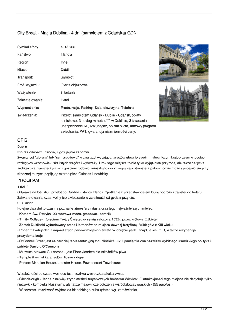 City Break - Magia Dublina - 4 dni (samolotem z Gdańska) GDN Symbol oferty: 431/9083 Państwo: Irlandia Region: Inne Miasto: Dublin Transport: Samolot Profil wyjazdu: Oferta objazdowa Wyżywienie: śniadanie Zakwaterowanie: Hotel Wyposażenie: Restauracja, Parking, Sala telewizyjna, Telefaks świadczenia: Przelot samolotem Gdańsk - Dublin - Gdańsk, opłaty lotniskowe, 3 noclegi w hotelu*** w Dublinie, 3 śniadania, ubezpieczenie KL, NW, bagaż, opieka pilota, ramowy program zwiedzania, VAT, gwarancja niezmienności ceny. OPIS Dublin Kto raz odwiedzi Irlandię, nigdy jej nie zapomni. Zwana jest "zieloną" lub "szmaragdową" krainą zachwycającą turystów głównie swoim malowniczym krajobrazem w postaci rozległych wrzosowisk, skalistych wzgórz i wybrzeży. Urok tego miejsca to nie tylko wyjątkowa przyroda, ale także celtycka architektura, zawsze życzliwi i gościnni rodowici mieszkańcy oraz wspaniała atmosfera pubów, gdzie można pobawić się przy skocznej muzyce popijając czarne piwo Guiness lub whisky. PROGRAM 1 dzień: Odprawa na lotnisku i przelot do Dublina - stolicy Irlandii. Spotkanie z przedstawicielem biura podróży i transfer do hotelu. Zakwaterowanie, czas wolny lub zwiedzanie w zależności od godzin przylotu. 2 - 3 dzień: Kolejne dwa dni to czas na poznanie atmosfery miasta oraz jego najważniejszych miejsc: - Katedra Św. Patryka- 93-metrowa wieża, grobowce, pomniki - Trinity College - Kolegium Trójcy Świętej, uczelnia założona 1592r. przez królową Elżbietę I. - Zamek Dubliński wybudowany przez Normanów na miejscu dawnej fortyfikacji Wikingów z XIII wieku - Phoenix Park-jeden z największych parków miejskich świata.W obrębie parku znajduje się ZOO, a także rezydencja prezydenta kraju - O'Connell Street jest najbardziej reprezentacyjną z dublińskich ulic.Upamiętnia ona nazwisko wybitnego irlandzkiego polityka i patrioty Daniela O'Connella - Muzeum browaru Guinnessa - jest Disneylandem dla miłośników piwa - Temple Bar-mekka artystów, liczne sklepy - Pałace: Mansion House, Leinster House, Powerscourt Townhouse W zależności od czasu wolnego jest możliwa wycieczka fakultatywna: - Glendalough - Jedna z największych atrakcji turystycznych hrabstwa Wicklow. O atrakcyjności tego miejsca nie decyduje tylko niezwykły kompleks klasztorny, ale także malownicze położenie wśród zboczy górskich - (55 euro/os.) - Wieczorami możliwość wyjścia do irlandzkiego pubu (płatne wg. zamówienia). 1/2 4 dzień: Wykwaterowanie z hotelu, czas wolny w zależności od godzin wylotu, transfer na lotnisko, przelot do Polski. ZAKWATEROWANIE - Hotele *** - Położone w Dublinie z dogodnym dojazdem komunikacją miejską do centrum miasta. Pokoje 2 osobowe (możliwość dostawki) z łazienką. Wyżywienie: śniadania kontynentalne CENA ZAWIERA - Przelot samolotem - Opłaty i podatki lotniskowe - 3 noclegi w hotelu - 3 śniadania - Opieka pilota - Ubezpieczenie KL, NW, bagaż - Ramowy program zwiedzania - Podatek VAT - Gwarancja niezmienności ceny CENA NIE ZAWIERA - Orientacyjnego kosztu uczestnictwa w w/w programie ramowym: ok.100 euro (transfery z/na lotnisko, bilety wstępów do zwiedzanych atrakcji, bilety komunikacji miejskiej, lokalni przewodnicy). - Wycieczek fakultatywnych i propozycji pozaprogramowych (wizyty w pubie płatne indywidualnie wg. zamówienia) INFORMACJE DODATKOWE - Kolejność zwiedzania może ulec zmianie. - Pilot nie oprowadza wewnątrz obiektów. - Wycieczki fakultatywne z pilotem są organizowane w zależności od ilości chętnych oraz wolnego czasu. - Transfery z/na lotnisko w zależności od ilości osób są realizowane busem lub komunikacją miejską i/lub podmiejską. - Przejazdy podczas zwiedzania i wycieczek fakultatywnych odbywają się komunikacją miejską i/lub podmiejską. - Spotkanie z przedstawicielem biura podróży nastąpi na lotnisku w Polsce lub po przylocie w Dublinie. - Linia lotnicza i godziny przelotów mogą ulec zmianie. - Pierwszy i ostatni dzień w zależności od godzin przelotu może być dniem zwiedzania. - Aktualne godziny wylotów i zbiórki klient zobowiązany jest potwierdzić w swoim biurze podróży na 2 dni przed wylotem. - SINGLE - bez dopłaty (przy dokwaterowaniu do pokoju 2 lub 3 osobowego). - DZIECI TANIEJ - dotyczy dziecka do 12 lat zakwaterowanego wspólnie z 2 osobami pełnopłatnymi. - W niektórych terminach hotel może ulec zmianie. ROZKŁAD LOTÓW - Linie lotnicze: Ryanair TERMINY: od: 2012-04-07 do: 2012-04-10 (4 dni), miejsca: sprawdź miejsca cena od: 1990 PLN od: 2012-04-28 do: 2012-05-01 (4 dni), miejsca: sprawdź miejsca cena od: 1990 PLN od: 2012-06-09 do: 2012-06-12 (4 dni), miejsca: sprawdź miejsca cena od: 1790 PLN od: 2012-07-07 do: 2012-07-10 (4 dni), miejsca: sprawdź miejsca cena od: 1790 PLN od: 2012-08-11 do: 2012-08-14 (4 dni), miejsca: sprawdź miejsca cena od: 1790 PLN od: 2012-09-15 do: 2012-09-18 (4 dni), miejsca: sprawdź miejsca cena od: 1790 PLN od: 2012-10-06 do: 2012-10-09 (4 dni), miejsca: sprawdź miejsca cena od: 1790 PLN 2/2