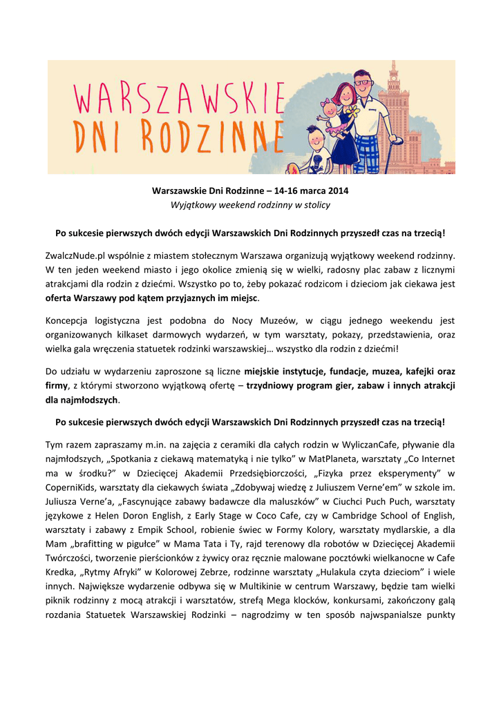 Warszawskie Dni Rodzinne – 14-16 marca 2014 Wyjątkowy weekend rodzinny w stolicy Po sukcesie pierwszych dwóch edycji Warszawskich Dni Rodzinnych przyszedł czas na trzecią! ZwalczNude.pl wspólnie z miastem stołecznym Warszawa organizują wyjątkowy weekend rodzinny. W ten jeden weekend miasto i jego okolice zmienią się w wielki, radosny plac zabaw z licznymi atrakcjami dla rodzin z dziećmi. Wszystko po to, żeby pokazać rodzicom i dzieciom jak ciekawa jest oferta Warszawy pod kątem przyjaznych im miejsc. Koncepcja logistyczna jest podobna do Nocy Muzeów, w ciągu jednego weekendu jest organizowanych kilkaset darmowych wydarzeń, w tym warsztaty, pokazy, przedstawienia, oraz wielka gala wręczenia statuetek rodzinki warszawskiej… wszystko dla rodzin z dziećmi! Do udziału w wydarzeniu zaproszone są liczne miejskie instytucje, fundacje, muzea, kafejki oraz firmy, z którymi stworzono wyjątkową ofertę – trzydniowy program gier, zabaw i innych atrakcji dla najmłodszych. Po sukcesie pierwszych dwóch edycji Warszawskich Dni Rodzinnych przyszedł czas na trzecią! Tym razem zapraszamy m.in. na zajęcia z ceramiki dla całych rodzin w WyliczanCafe, pływanie dla najmłodszych, „Spotkania z ciekawą matematyką i nie tylko” w MatPlaneta, warsztaty „Co Internet ma w środku?” w Dziecięcej Akademii Przedsiębiorczości, „Fizyka przez eksperymenty” w CoperniKids, warsztaty dla ciekawych świata „Zdobywaj wiedzę z Juliuszem Verne’em” w szkole im. Juliusza Verne’a, „Fascynujące zabawy badawcze dla maluszków” w Ciuchci Puch Puch, warsztaty językowe z Helen Doron English, z Early Stage w Coco Cafe, czy w Cambridge School of English, warsztaty i zabawy z Empik School, robienie świec w Formy Kolory, warsztaty mydlarskie, a dla Mam „brafitting w pigułce” w Mama Tata i Ty, rajd terenowy dla robotów w Dziecięcej Akademii Twórczości, tworzenie pierścionków z żywicy oraz ręcznie malowane pocztówki wielkanocne w Cafe Kredka, „Rytmy Afryki” w Kolorowej Zebrze, rodzinne warsztaty „Hulakula czyta dzieciom” i wiele innych. Największe wydarzenie odbywa się w Multikinie w centrum Warszawy, będzie tam wielki piknik rodzinny z mocą atrakcji i warsztatów, strefą Mega klocków, konkursami, zakończony galą rozdania Statuetek Warszawskiej Rodzinki – nagrodzimy w ten sposób najwspanialsze punkty rodzinne w mieści. I to właśnie mieszkańcy stolicy wybiorą je w głosowaniu między 10 lutego, a 10 marca – zapraszamy do konkursu! Różnorodność zajęć jest ogromna, wszystko odbywa się za darmo dla posiadaczy Karty Warszawiaka, oraz karty Młodego Warszawiaka, a dla pozostałych przy symbolicznej opłacie 2 PLN. Projekt jest współfinansowany ze środków m.st. Warszawy. Projekt odbywa się od patronatem TVP Warszawa. W ramach III edycji organizatorzy przygotowali też konkurs na najwspanialsze miejsce rodzinne w Warszawie. Spośród ponad 300 zgłoszonych punktów kapituła wybrała 25, po 5 w każdej z kategorii. Teraz to mieszkańcy Warszawy zadecydują które miejsca zasługują na wyróżnienie – wygrani otrzymają 10.000 PLN w postaci kampanii promocyjnej dla punktu w największych mediach rodzinnych w Warszawie. Zapraszamy też do głosowania na najwspanialsze miejsca dla rodzinki warszawskiej. Dla głosujących przygotowaliśmy moc wspaniałych nagród: klocki mega bloks, oraz pudełeczna BrandQ! Zapisy rozpoczną się już 24 lutego. Więcej na www.warszawskiednirodzinne.pl. Serdecznie zapraszamy! Kontakt do organizatora: [email protected] 501 104 087