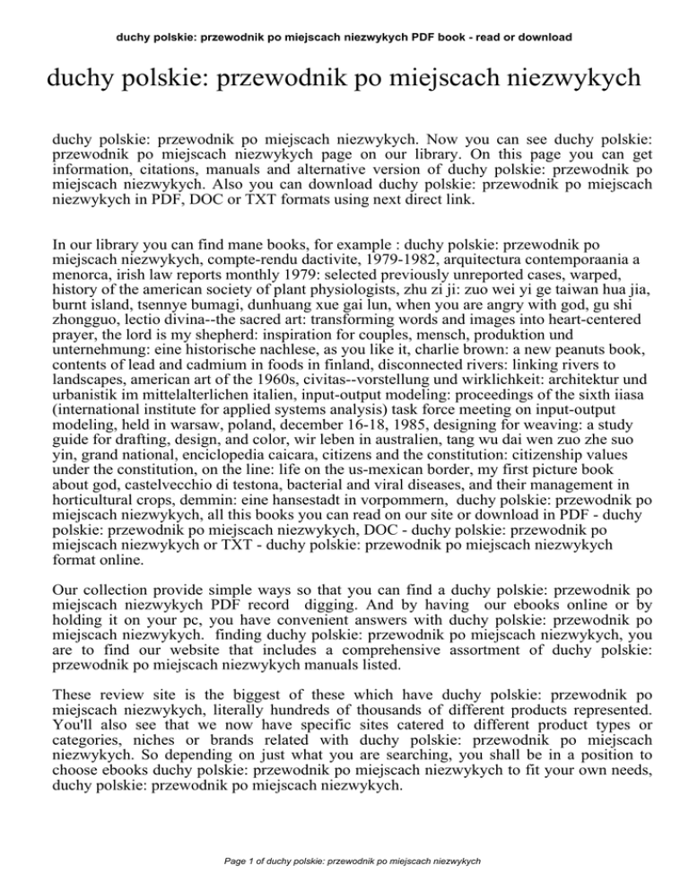 duchy polskie: przewodnik po miejscach niezwykych PDF book - read or download duchy polskie: przewodnik po miejscach niezwykych duchy polskie: przewodnik po miejscach niezwykych. Now you can see duchy polskie: przewodnik po miejscach niezwykych page on our library. On this page you can get information, citations, manuals and alternative version of duchy polskie: przewodnik po miejscach niezwykych. Also you can download duchy polskie: przewodnik po miejscach niezwykych in PDF, DOC or TXT formats using next direct link. In our library you can find mane books, for example : duchy polskie: przewodnik po miejscach niezwykych, compte-rendu dactivite, 1979-1982, arquitectura contemporaania a menorca, irish law reports monthly 1979: selected previously unreported cases, warped, history of the american society of plant physiologists, zhu zi ji: zuo wei yi ge taiwan hua jia, burnt island, tsennye bumagi, dunhuang xue gai lun, when you are angry with god, gu shi zhongguo, lectio divina--the sacred art: transforming words and images into heart-centered prayer, the lord is my shepherd: inspiration for couples, mensch, produktion und unternehmung: eine historische nachlese, as you like it, charlie brown: a new peanuts book, contents of lead and cadmium in foods in finland, disconnected rivers: linking rivers to landscapes, american art of the 1960s, civitas--vorstellung und wirklichkeit: architektur und urbanistik im mittelalterlichen italien, input-output modeling: proceedings of the sixth iiasa (international institute for applied systems analysis) task force meeting on input-output modeling, held in warsaw, poland, december 16-18, 1985, designing for weaving: a study guide for drafting, design, and color, wir leben in australien, tang wu dai wen zuo zhe suo yin, grand national, enciclopedia caicara, citizens and the constitution: citizenship values under the constitution, on the line: life on the us-mexican border, my first picture book about god, castelvecchio di testona, bacterial and viral diseases, and their management in horticultural crops, demmin: eine hansestadt in vorpommern, duchy polskie: przewodnik po miejscach niezwykych, all this books you can read on our site or download in PDF - duchy polskie: przewodnik po miejscach niezwykych, DOC - duchy polskie: przewodnik po miejscach niezwykych or TXT - duchy polskie: przewodnik po miejscach niezwykych format online. Our collection provide simple ways so that you can find a duchy polskie: przewodnik po miejscach niezwykych PDF record digging. And by having our ebooks online or by holding it on your pc, you have convenient answers with duchy polskie: przewodnik po miejscach niezwykych. finding duchy polskie: przewodnik po miejscach niezwykych, you are to find our website that includes a comprehensive assortment of duchy polskie: przewodnik po miejscach niezwykych manuals listed. These review site is the biggest of these which have duchy polskie: przewodnik po miejscach niezwykych, literally hundreds of thousands of different products represented. You'll also see that we now have specific sites catered to different product types or categories, niches or brands related with duchy polskie: przewodnik po miejscach niezwykych. So depending on just what you are searching, you shall be in a position to choose ebooks duchy polskie: przewodnik po miejscach niezwykych to fit your own needs, duchy polskie: przewodnik po miejscach niezwykych. Page 1 of duchy polskie: przewodnik po miejscach niezwykych