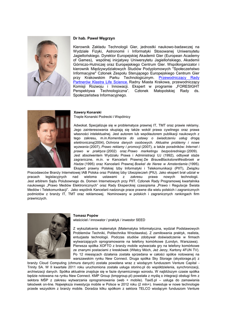 Dr hab. Paweł Węgrzyn Kierownik Zakładu Technologii Gier, jednostki naukowo-badawczej na Wydziale Fizyki, Astronomii i Informatyki Stosowanej Uniwersytetu Jagiellońskiego. Dyrektor Europejskiej Akademii Gier (European Academy of Games), wspólnej inicjatywy Uniwersytetu Jagiellońskiego, Akademii Górniczo-Hutniczej oraz Europejskiego Centrum Gier. Współorganizator i kierownik Międzywydziałowych Studiów Podyplomowych "Społeczeństwo Informacyjne" Członek Zespołu Sterującego Europejskiego Centrum Gier przy Krakowskim Parku Technologicznym. Przewodniczący Rady Partnerów Klastra Life Science. Radny Miasta Krakowa, przewodniczący Komisji Rozwoju i Innowacji. Ekspert w programie „FORESIGHT Perspektywa Technologiczna”. Członek Małopolskiej Rady ds. Społeczeństwa Informacyjnego. Xawery Konarski Traple Konarski Podrecki i Wspólnicy Adwokat. Specjalizuje się w problematyce prawnej IT, TMT oraz prawie reklamy. Jego zainteresowania skupiają się także wokół prawa cywilnego oraz prawa własności intelektualnej. Jest autorem lub współautorem publikacji naukowych z tego zakresu, m.in.Komentarza do ustawy o świadczeniu usług drogą elektroniczną(2004), Ochrona danych osobowych. Aktualne problemy i nowe wyzwania (2007), Prawo reklamy i promocji (2007), a także poradników: Internet i prawo w praktyce (2002) oraz Prawo marketingu bezpośredniego (2009). Jest absolwentem Wydziału Prawa i Administracji UJ (1992), odbywał staże zagraniczne, m.in. w Kancelarii Prawnej De BrauwBlackstoneWestbroek w Hadze (1995) oraz Kancelarii Prawnej Boekel de Neree w Amsterdamie (1995). Ekspert prawny Polskiej Izby Informatyki i Telekomunikacji (PIIT), Związku Pracodawców Branży Internetowej IAB Polska oraz Polskiej Izby Ubezpieczeń (PIU). Jako ekspert brał udział w pracach legislacyjnych nad wieloma ustawami z zakresu prawa nowych technologii. Jest arbitrem Sądu Polubownego ds. Domen Internetowych przy PIIT. Członek Rady Programowej kwartalnika naukowego „Prawo Mediów Elektronicznych” oraz Rady Eksperckiej czasopisma „Prawo i Regulacje Świata Mediów i Telekomunikacji”. Jako wspólnik Kancelarii nadzoruje prace prawne dla wielu polskich i zagranicznych podmiotów z branży IT, TMT oraz reklamowej. Nominowany w polskich i zagranicznych rankingach firm prawniczych. Tomasz Popów właściciel / innowator / praktyk / inwestor SEED Z wykształcenia matematyk (Matematyka Informatyczna, wydział Podstawowych Problemów Techniki, Politechnika Wrocławska). Z zamiłowania praktyk, realista, entuzjasta technologii. Podczas studiów zdobywał doświadczenie w firmach wytwarzających oprogramowanie na telefony komórkowe (Londyn, Warszawa). Pierwsza spółka XOFTO z branży mobile wytwarzała gry na telefony komórkowe ze znanymi postaciami z kreskówek (Włatcy Móch, Jeż Jerzy, Kartony 4FUN TV). Po 12 miesiącach działania została sprzedana w całości spółce notowanej na warszawskim rynku New Connect. Druga spółka Sky Storage (skystorage.pl) z branży Cloud Computing (chmura danych) została powołana wraz z wiodącym funduszem Venture Capital Trinity SA. W II kwartale 2011 roku uruchomiona została usługa storino.pl do współdzielenia, synchronizacji, archiwizacji danych. Spółka aktualnie znajduje się w fazie dynamicznego wzrostu. W najbliższym czasie spółka będzie notowana na rynku New Connect. KMP Group (kmpgroup.pl) powstała z myślą o integracji obsługi firm z sektora MŚP z zakresu wytwarzania oprogramowania (web + mobile). Taxi5.pl – usługa do zamawiania taksówek on-line. Największa inwestycja mobile w Polsce w 2012 roku (2 mln+). Inwestuje w nowe technologie przede wszystkim z branży mobile. Doradza kilku spółkom z sektora TELCO wiodącym funduszom Venture Capital w zakresie optymalizacji modeli biznesowych i adaptacji technologii do sprostania wymaganiom wybranego modelu biznesowego. Tomasz Popów jest jedynym panelistą z Polski na największych europejskich targach mobile (Mobile World Congress w Barcelonie). www.tomaszpopow.pl , http://www.linkedin.com/pub/tomasz-popow/34/71a/b0a Paweł Nowacki Dyrektor Sprzedaży ds. Aplikacji IT (Mobiltek SA) Absolwent studiów Executive MBA na Uniwersytecie Ekonomicznym w Krakowie oraz Stockholm University School of Business. Obecnie Dyrektor Sprzedaży Aplikacji IT w firmie Mobiltek SA, odpowiedzialny za współpracę z klientami i pomaganie im w osiąganiu celów biznesowych. Posiada ponad 10-letnie doświadczenie w realizowaniu projektów dla klientów B2B na poziomie korporacji oraz z sektora MŚP. Pasjonat marketingu internetowego i mobilnego. Poszukuje i odkrywa możliwości oraz szanse rynkowe jakie dają nowe technologie a potem bardzo chętnie dzieli się wiedzą i pomaga klientom dawnym, obecnym oraz przyszłym. Marcin Papiński Dyrektor ds. Rozwoju Biznesu w Infobip Informatyk – Absolwent Polsko-Japońskiej Wyższej Szkoły Technik Komputerowych. Pierwsze doświadczenia zdobywał w Hewlett-Packard i Microsoft gdzie nauczył się prowadzić międzynarodowe projekty z zakresu Change Managementu czy Six-Sigma. Przez wiele lat zajmował się wprowadzaniem i rozwojem obcych marek na rynku lokalnym. Był całościowo odpowiedzialny za wizerunek, sprzedaż i pozycjonowanie produktów. Obecnie związany z firmą jako dyrektor ds. rozwoju biznesu odpowiedzialny jest za rozwój marki Infobip na terenie Polski. Prywatnie pasjonat nowych technologii i entuzjasta jazdy konnej. Michał Kubowicz redaktor portalu myApple Od kilku lat blisko związany z portalem MyApple. Z branża mobilną związany od 2008 roku, kiedy tworzył nieistniejący już portal se-center.info. Aktualnie pracuje także przy zagadnieniach dotyczących marketingu aplikacji mobilnych i marketingu skierowanego do studentów (grupa 18-26 lat).