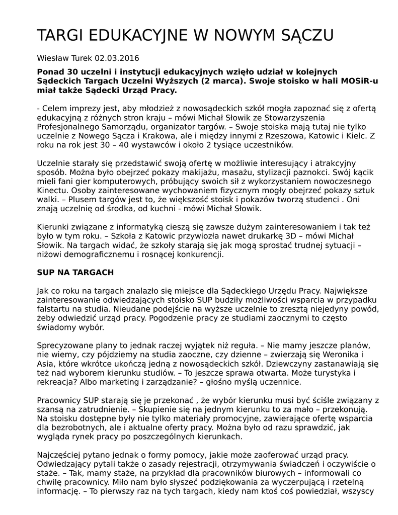 TARGI EDUKACYJNE W NOWYM SĄCZU Wiesław Turek 02.03.2016 Ponad 30 uczelni i instytucji edukacyjnych wzięło udział w kolejnych Sądeckich Targach Uczelni Wyższych (2 marca). Swoje stoisko w hali MOSiR-u miał także Sądecki Urząd Pracy. - Celem imprezy jest, aby młodzież z nowosądeckich szkół mogła zapoznać się z ofertą edukacyjną z różnych stron kraju – mówi Michał Słowik ze Stowarzyszenia Profesjonalnego Samorządu, organizator targów. – Swoje stoiska mają tutaj nie tylko uczelnie z Nowego Sącza i Krakowa, ale i między innymi z Rzeszowa, Katowic i Kielc. Z roku na rok jest 30 – 40 wystawców i około 2 tysiące uczestników. Uczelnie starały się przedstawić swoją ofertę w możliwie interesujący i atrakcyjny sposób. Można było obejrzeć pokazy makijażu, masażu, stylizacji paznokci. Swój kącik mieli fani gier komputerowych, próbujący swoich sił z wykorzystaniem nowoczesnego Kinectu. Osoby zainteresowane wychowaniem fizycznym mogły obejrzeć pokazy sztuk walki. – Plusem targów jest to, że większość stoisk i pokazów tworzą studenci . Oni znają uczelnię od środka, od kuchni - mówi Michał Słowik. Kierunki związane z informatyką cieszą się zawsze dużym zainteresowaniem i tak też było w tym roku. – Szkoła z Katowic przywiozła nawet drukarkę 3D – mówi Michał Słowik. Na targach widać, że szkoły starają się jak mogą sprostać trudnej sytuacji – niżowi demograficznemu i rosnącej konkurencji. SUP NA TARGACH Jak co roku na targach znalazło się miejsce dla Sądeckiego Urzędu Pracy. Największe zainteresowanie odwiedzających stoisko SUP budziły możliwości wsparcia w przypadku falstartu na studia. Nieudane podejście na wyższe uczelnie to zresztą niejedyny powód, żeby odwiedzić urząd pracy. Pogodzenie pracy ze studiami zaocznymi to często świadomy wybór. Sprecyzowane plany to jednak raczej wyjątek niż reguła. – Nie mamy jeszcze planów, nie wiemy, czy pójdziemy na studia zaoczne, czy dzienne – zwierzają się Weronika i Asia, które wkrótce ukończą jedną z nowosądeckich szkół. Dziewczyny zastanawiają się też nad wyborem kierunku studiów. – To jeszcze sprawa otwarta. Może turystyka i rekreacja? Albo marketing i zarządzanie? – głośno myślą uczennice. Pracownicy SUP starają się je przekonać , że wybór kierunku musi być ściśle związany z szansą na zatrudnienie. – Skupienie się na jednym kierunku to za mało – przekonują. Na stoisku dostępne były nie tylko materiały promocyjne, zawierające ofertę wsparcia dla bezrobotnych, ale i aktualne oferty pracy. Można było od razu sprawdzić, jak wygląda rynek pracy po poszczególnych kierunkach. Najczęściej pytano jednak o formy pomocy, jakie może zaoferować urząd pracy. Odwiedzający pytali także o zasady rejestracji, otrzymywania świadczeń i oczywiście o staże. – Tak, mamy staże, na przykład dla pracowników biurowych – informowali co chwilę pracownicy. Miło nam było słyszeć podziękowania za wyczerpującą i rzetelną informację. – To pierwszy raz na tych targach, kiedy nam ktoś coś powiedział, wszyscy tylko wciskają ulotki – żali się Weronika. W tym roku Sądeckie Targi Edukacyjne były dwudniowe. 1 marca w hali MOSiR-u odbyła się Giełda Szkół Ponadgimnazjalnych połączona z festiwalem zawodów. Więcej o Targach w najbliższym wydaniu miesięcznika Sądecki Rynek Pracy.