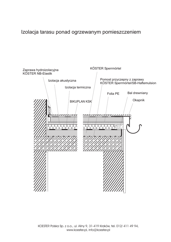 Izolacja tarasu ponad ogrzewanym pomieszczeniem KÖSTER Sperrmörtel Zaprawa hydroizolacyjna KÖSTER NB-Elastik Izolacja akustyczna Pomost przyczepny z zaprawy KÖSTER Sperrmörtel/SB-Haftemulsion Izolacja termiczna Folia PE BIKUPLAN KSK Bal drewniany Okapnik KOESTER Polska Sp. z o.o., ul. Aliny 9, 31-419 Kraków, tel. 012/ 411 49 94, www.koester.pl, [email protected]