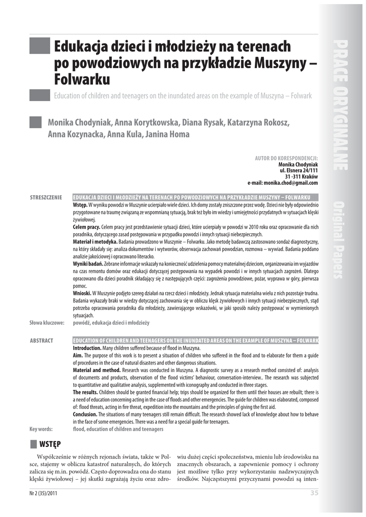 Edukacja dzieci i młodzieży na terenach po powodziowych na przykładzie Muszyny – Folwarku Education of children and teenagers on the inundated areas on the example of Muszyna – Folwark Monika Chodyniak, Anna Korytkowska, Diana Rysak, Katarzyna Rokosz, Anna Kozynacka, Anna Kula, Janina Homa AUTOR DO KORESPONDENCJI: Monika Chodyniak ul. Elsnera 24/111 31 -311 Kraków e-mail: [email protected] STRESZCZENIE Słowa kluczowe: ABSTRACT Key words: WSTĘP EDUKACJA DZIECI I MŁODZIEŻY NA TERENACH PO POWODZIOWYCH NA PRZYKŁADZIE MUSZYNY FOLWARKU Wstęp. W wyniku powodzi w Muszynie ucierpiało wiele dzieci. Ich domy zostały zniszczone przez wodę. Dzieci nie były odpowiednio przygotowane na traumę związaną ze wspomnianą sytuacją, brak też było im wiedzy i umiejętności przydatnych w sytuacjach klęski żywiołowej. Celem pracy. Celem pracy jest przedstawienie sytuacji dzieci, które ucierpiały w powodzi w 2010 roku oraz opracowanie dla nich poradnika, dotyczącego zasad postępowania w przypadku powodzi i innych sytuacji niebezpiecznych. Materiał i metodyka. Badania prowadzono w Muszynie – Folwarku. Jako metodę badawczą zastosowano sondaż diagnostyczny, na który składały się: analiza dokumentów i wytworów, obserwacja zachowań powodzian, rozmowa – wywiad. Badania poddano analizie jakościowej i opracowano literacko. Wyniki badań. Zebrane informacje wskazały na konieczność udzielenia pomocy materialnej dzieciom, organizowania im wyjazdów na czas remontu domów oraz edukacji dotyczącej postępowania na wypadek powodzi i w innych sytuacjach zagrożeń. Dlatego opracowano dla dzieci poradnik składający się z następujących części: zagrożenia powodziowe, pożar, wyprawa w góry, pierwsza pomoc. Wnioski. W Muszynie podjęto szereg działań na rzecz dzieci i młodzieży. Jednak sytuacja materialna wielu z nich pozostaje trudna. Badania wykazały braki w wiedzy dotyczącej zachowania się w obliczu klęsk żywiołowych i innych sytuacji niebezpiecznych, stąd potrzeba opracowania poradnika dla młodzieży, zawierającego wskazówki, w jaki sposób należy postępować w wymienionych sytuacjach. powódź, edukacja dzieci i młodzieży EDUCATION OF CHILDREN AND TEENAGERS ON THE INUNDATED AREAS ON THE EXAMPLE OF MUSZYNA FOLWARK Introduction. Many children suffered because of flood in Muszyna. Aim. The purpose of this work is to present a situation of children who suffered in the flood and to elaborate for them a guide of procedures in the case of natural disasters and other dangerous situations. Material and method. Research was conducted in Muszyna. A diagnostic survey as a research method consisted of: analysis of documents and products, observation of the flood victims’ behaviour, conversation-interview.. The research was subjected to quantitative and qualitative analysis, supplemented with iconography and conducted in three stages. The results. Children should be granted financial help; trips should be organized for them until their houses are rebuilt; there is a need of education concerning acting in the case of floods and other emergencies. The guide for children was elaborated, composed of: flood threats, acting in fire threat, expedition into the mountains and the principles of giving the first aid. Conclusion. The situations of many teenagers still remain difficult. The research showed lack of knowledge about how to behave in the face of some emergencies. There was a need for a special guide for teenagers. flood, education of children and teenagers Współcześnie w różnych rejonach świata, także w Polsce, stajemy w obliczu katastrof naturalnych, do których zalicza się m.in. powódź. Często doprowadza ona do stanu klęski żywiołowej – jej skutki zagrażają życiu oraz zdroNr 2 (35)/2011 wiu dużej części społeczeństwa, mieniu lub środowisku na znacznych obszarach, a zapewnienie pomocy i ochrony jest możliwe tylko przy wykorzystaniu nadzwyczajnych środków. Najczęstszymi przyczynami powodzi są inten- 35 Edukacja dzieci i młodzieży na terenach po powodziowych na przykładzie Muszyny – Folwarku sywne, często długotrwałe, opady oraz wiosną gwałtowne topnienie pokrywy śnieżnej. Choć podejmuje się działania na rzecz ochrony przed powodzią i zmniejszenia jej skutków, to nie jesteśmy w stanie w pełni zapanować nad tym żywiołem [1, 2]. Powódź powoduje ogromne straty materialne, wiele osób w jej wyniku traci dorobek całego życia, stąd mogą wystąpić u nich negatywne zmiany w sferze psychicznej w postaci stresu pourazowego. Szczególnie trudna staje się sytuacja dzieci i młodzieży. Są one świadkami drastycznych scen i wydarzeń, doświadczają bezradności, desperacji i strachu dorosłych. Uraz ten powoduje zmiany w przeżywaniu rzeczywistości. W oczach dzieci świat postrzegany do tej pory jako przyjazny staje się wrogi, niebezpieczny i niszczący. Dodatkowo nastolatki pragną w wielu wypadkach sprostać roli dorosłego, nie mając właściwego doświadczenia i możliwości, co niekorzystnie wpływa na ich stan psychiczny [2]. Reakcje emocjonalne zależą od: wieku dziecka (im młodsze tym, trudnej nazwać mu to, co się z nim dzieje), rodzaju i jakości przeżyć, zachowania rodziców. Duża rolę w takich okolicznościach odgrywa wczesna pomoc psychologiczna, polegająca na odbudowaniu poczucia bezpieczeństwa [2]. Często na terenach zniszczonych przez powódź organizowane są wyjazdy dla dzieci, na których mają one możliwość odreagowania i powrotu do równowagi emocjonalnej, podczas gdy dorośli zajmują się usuwaniem zniszczeń i odbudowywaniem domu. Należy przy tym pamiętać, że dzieci po takich doświadczeniach odczuwają silną potrzebę bliskości fizycznej rodziców, dlatego: nie wolno zabierać dzieci, które nie chcą jechać, przed wyjazdem powinny być zorganizowane zajęcia odreagowujące, wychowawcy kolonii powinni posiadać podstawowe informacje na temat zaburzeń stresu pourazow
