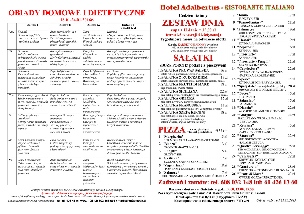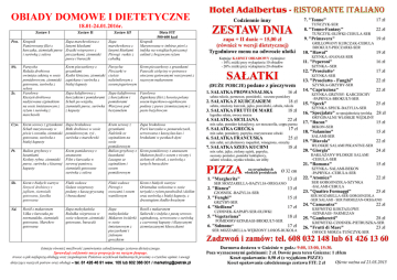 OBIADY DOMOWE I DIETETYCZNE 18.01-24.01.2016r. Zestaw I Zestaw II Zestaw III Dieta FIT 500-600 kcal Pon. Krupnik Panierowany filet z kurczaka, ziemniaki puree i surówką z selera Zupa marchewkowa z lanymi kluskami Zraziki wieprzowe z pieczarkami, ziemniaki puree i buraczki Zupa marchewkowa z lanymi kluskami Pierogi ruskie z cebulką Krupnik Marynowana w imbirze pierś z indyka na wstąŜkach pieczonej cukinii z brązowym ryŜem Wt. Parzycha Rolada drobiowa owinięta cukinią w sosie pomidorowym, ziemniaki gotowane, surówka z selera Fasolowa Kieszeń drobiowa nadziewana szpinakiem na sosie śmietanowym z ryŜem i surówką z marchewki Krem pieczarkowy z grzankami Kotlet Gniezno, ziemniaki zapiekane i surówka z białej kapusty Parzycha Pieczarki w cieście naleśnikowym z sosem jogurtowym Krem pieczarkowy z grzankami Paseczki cielęciny w potrawce otoczone gotowanymi warzywami z razowym makaronem Zupa kalafiorowa z kurczakiem i pomidorami Schab po wiejsku, ziemniaki puree, surówka z kapusty Zupa kalafiorowa z kurczakiem i pomidorami Warzywa pod beszamelem Fasolowa Zapiekany filet z łososia polany sosem koperkowo-ogórkowym podany z puree ziemniaczanym z pesto bazyliowym Czw. Krem serowy z grzankami Schab marynowany w piwie i czosnku, ziemniaki gotowane, surówka z białej kapusty Zupa brokułowa Bitki drobiowe w sosie pomidorowym, ryŜ , surówka z marchewki Zupa brokułowa Pierś kurczaka w pomarańczach, serwowana z kaszą kus-kus i brokułami w pestkach dyni Pt. Bulion grzybowy z łazankami Kotlety rybne, ziemniaki puree, surówka z kiszonej kapusty Krem pomidorowy z ananasem Filet z kurczaka w serowej panierce, ziemniaki gotowane surówka z selera Krem serowy z grzankami Naleśnik ze szpinakiem na sosie pomidorowym Bulion grzybowy z łazankami Lazagne ze szpinakiem i sosem pomidorowym Sb. Krem z białych warzyw Sznycel drobiowy z jajkiem, ziemniaki gotowane, fasolka gotowana Flaki wołowe Gulasz wieprzowy podany z kaszą gryczaną i buraczkami Flaki wołowe Pierogi z owocami i sosem waniliowym Krem z białych warzyw Orientalna wołowina w sosie teriyaki z ryŜem paraboiled i dzikim oraz surówką z białej kapusty, z dressingiem słodko-kwaśnym Nd. Rosół z makaronem Udka z kurczaka po normandzku, ziemniaki gotowane, Marchew gotowana Zupa meksykańska Roladka wieprzowa w sosie własnym ,ziemniaki gotowane, buraczki Zupa meksykańska Makaron świderki w sosie śmietanowym z pieczarkami i zielonym groszkiem Rosół z makaronem Sakiewki z indyka z pastą serowoszpinakową, serwowane z surówką z czerwonej kapusty i klasycznymi ziemniaczanymi kluseczkami Śr. Krem pomidorowy z ananasem Makaron fusili z sosem z ricotty i zielonych oliwek, z surówką z tartych buraczków Istnieje równieŜ moŜliwość zamówienia całodziennego zestawu dietetycznego. Sprawdzaj codziennie nasze propozycje na naszym fanpage. trosce o jak najlepszą obsługę oraz zaspokojenie Państwa oczekiwań kulinarnych prosimy o rzetelne opinie i uwagi dotyczące naszych potraw oraz obsługi – tel. 61 426 46 91 wew. 105 lub 602 366 001 / [email protected]