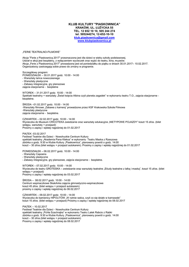 KLUB KULTURY "PIASKOWNICA” KRAKÓW, UL. ŁUŻYCKA 55 TEL. 12 652 10 10, 505 244 274 tel. 505244274, 12-652-10-10 [email protected] www.klubpiaskownica.pl „FERIE TEATRALNO-FILMOWE” Akcja "Ferie z Piaskownicą 2017" przeznaczona jest dla dzieci w wieku szkoły podstawowej. Udział w akcji jest bezpłatny, z wyłączeniem wycieczek oraz wyjść do teatru, kina, muzeów. Akcja „Ferie z Piaskownicą 2017” prowadzona jest od poniedziałku do piątku w dniach 30.01.2017– 10.02.2017. Organizatorzy zastrzegają sobie prawo do zmiany w programie. Szczegółowy program: PONIEDZIAŁEK – 30.01.2017 godz. 10:00 - 14:00 - Warsztaty tańca nowoczesnego - Warsztaty plastyczne - Zabawy integracyjne, gry planszowe zajęcia stacjonarne - bezpłatne WTOREK – 31.01.2017 godz. 10:00 - 14:00 Spektakl teatralny + warsztaty „Świat księcia Albina czyli planeta zagadek” w wykonaniu teatru T.O., zajęcia stacjonarne bezpłatne. ŚRODA –01.02.2017 godz. 10:00 - 14:00 -Warsztaty filmowe „Zabawa z kamerą” prowadzone przez KSF Krakowska Szkoła Filmowa -Warsztaty plastyczne zajęcia stacjonarne - bezpłatne. CZWARTEK – 02.02.2017 godz. 10:00 - 14:00 Wycieczka do Muzeum CRICOTEKA zwiedzanie oraz warsztaty edukacyjne „NIETYPOWE POJAZDY” koszt 15 zł/os. (bilet wstępu, warsztaty + przejazd) Prosimy o zapisy i wpłatę najpóźniej do 01.02.2017 PIĄTEK -03.02.2017 Festiwal Teatrów dla Dzieci - Nowohuckie Centrum Kultury spektakl teatralny „Akademia Pana Kleksa” w wykonaniu Teatru Maska z Rzeszowa zbiórka o godz. 9:30 w Klubie Kultury „Piaskownica”, planowany powrót o godz. 14:00 koszt – 30 zł/os.(bilet wstępu + przejazd autokarem). Prosimy o zapisy i wpłatę najpóźniej do 01.02.2017 PONIEDZIAŁEK – 06.02.2017 godz. 10:00 - 14:00 - Warsztaty Capoeira - Warsztaty plastyczne - Zabawy integracyjne, gry planszowe, zajęcia stacjonarne - bezpłatne. WTOREK – 07.02.2017 godz. 10:00 - 14:00 Wycieczka do teatru GROTESKA – zwiedzanie oraz warsztaty teatralne „Etiudy teatralne z lalką i maską”, koszt 15 zł/os. (bilet wstępu + przejazd) Prosimy o zapisy i wpłatę najpóźniej do 03.02.2017 ŚRODA – 08.02.2017 godz. 10:00 - 14:00 Centrum wspinaczkowe SkakAnka zajęcia gimnastyczno-wspinaczkowe koszt 45 zł/os. (bilet wstępu + przejazd autokarem) prosimy o zapisy i wpłatę najpóźniej do 06.02.2017 CZWARTEK – 09.02.2017 godz. 10:00 - 14:00 Wycieczka do kamienicy HIPOLITÓW „W rytmie walca, czyli co się działo w karnawale” koszt 15 zł/os. (bilet wstępu + przejazd) Prosimy o zapisy i wpłatę najpóźniej do 08.02.2017 PIĄTEK – 10.02.2017 Festiwal Teatrów dla Dzieci - Nowohuckie Centrum Kultury spektakl teatralny „Pchła Szachrajka” w wykonaniu Teatru Lalek Rabcio z Rabki zbiórka o godz. 9:30 w Klubie Kultury „Piaskownica”, planowany powrót o godz. 14:00 koszt – 30 zł/os.(bilet wstępu + przejazd autokarem) Prosimy o zapisy i wpłatę najpóźniej do 08.02.2017