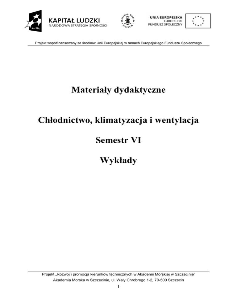 Projekt współfinansowany ze środków Unii Europejskiej w ramach Europejskiego Funduszu Społecznego Materiały dydaktyczne Chłodnictwo, klimatyzacja i wentylacja Semestr VI Wykłady Projekt „Rozwój i promocja kierunków technicznych w Akademii Morskiej w Szczecinie” Akademia Morska w Szczecinie, ul. Wały Chrobrego 1-2, 70-500 Szczecin 1 Projekt współfinansowany ze środków Unii Europejskiej w ramach Europejskiego Funduszu Społecznego Temat 1 (1h): Chłodnictwo i jego zastosowanie w okrętownictwie Zagadnienie 1.A: Metody chłodzenia i rodzaje urządzeń chłodniczych Podstawowe rodzaje chłodzenia stosowane w technice to chłodzenie przez zmianę stanu skupienia i chłodzenie przez rozprężanie. W związku z problemami ekologicznymi na etapie badań lub wdrażania na skalę przemysłową znajdują się modyfikacje podstawowych metod chłodzenia związane z wykorzystaniem obiegu CO2 z ponadkrytycznym lub kaskadowym sprężaniem par oraz specjalnych układów absorpcyjnych. Ze względu na niską efektywność energetyczną dalekie od zastosowanie praktycznego do urządzeń dużych mocy wydają się obecnie metody chłodzenia termoelektrycznego, magnetycznego, termoplastycznego i termoakustycznego. Chłodzenie przez zmianę stanu skupienia obejmuje: topnienie, sublimację oraz parowanie i wrzenie. Chłodzenie przez rozprężanie polega na obniżeniu energii gazu przez wykorzystanie energii ciśnienia do pokonania sił wzajemnego przyciągania cząsteczek w procesie adiabatycznego dławienia. Podstawowe rodzaje urządzeń chłodniczych stosowanych w przechowalnictwie i przemyśle to urządzenia sprężarkowe i absorpcyjne. Zagadnienie 1.B: Zastosowanie chłodnictwa na statkach Zastosowanie urządzeń chłodniczych na statkach obejmuje chłodzony przewóz towarów w ładowniach i kontenerach, przewóz ładunków płynnych w stanie skroplonym, przechowywanie zapasów okrętowych w chłodniach prowiantowych, przechowywanie skroplonych środków gaśniczych, oraz obróbkę powietrza w instalacjach klimatyzacyjnych. Każde z zastosowań posiada specyficzny rodzaj instalacji i urządzeń potrzebnych do realizacji procesu chłodzenia. Projekt „Rozwój i promocja kierunków technicznych w Akademii Morskiej w Szczecinie” Akademia Morska w Szczecinie, ul. Wały Chrobrego 1-2, 70-500 Szczecin 2 Projekt współfinansowany ze środków Unii Europejskiej w ramach Europejskiego Funduszu Społecznego Temat 2 (2h): Obiegi chłodnicze i układy chłodnicze stosowane na statkach Zagadnienie 2.A: Podstawy termodynamiczne obiegów chłodniczych Termodynamiczny obieg chłodniczy to zespół cyklicznych przemian stanu ziębnika podczas których ciepło przenoszone jest od źródła o niższej temperaturze do źródła o wyższej temperaturze, a więc przeciwnie do naturalnego ruchu ciepła, kosztem energii sprężania lub energii cieplnej doprowadzonej do ziębnika. Stan ziębnika po zakończeniu ostatniej przemiany pokrywa się ze stanem na początku cyklu. Stan ziębnika wyrażony jest zbiorem wartości parametrów fizykochemicznych. Przemiany można zobrazować w wybranym dwuwymiarowym układzie współrzędnych. Do analizy obiegów teoretycznych najczęściej używany jest układ współrzędnych entropia- temperatura (T- s). Najchętniej stosowanym praktycznie jest układ współrzędnych entalpia- ciśnienie (lgp- i) i do niego najczęściej będzie odwołanie podczas zajęć. Na rys. 2.1 przedstawiono w układzie współrzędnych lgp- i teoretyczny, sprężarkowy suchy obieg chłodniczy z dławieniem a na rys. 2.2 przebieg linii obrazujących stan ziębnika. Rys.2.1 Obieg termodynamiczny ziębnika w układzie współrzędnych lgp- i Projekt „Rozwój i promocja kierunków technicznych w Akademii Morskiej w Szczecinie” Akademia Morska w Szczecinie, ul. Wały Chrobrego 1-2, 70-500 Szczecin 3 Projekt współfinansowany ze środków Unii Europejskiej w ramach Europejskiego Funduszu Społecznego Jak wynika z rys. 2.1 teoretyczny obieg chłodniczy jest obiegiem lewobieżnym. W zależności od relacji temperatury otoczenia do temperatury źródła dolnego i górnego obiegi lewobieżne dzieli się na Obiegi chłodnicze (temperatura otoczenia = temperaturze źródła górnego) Obiegi pompy ciepła (temperatura otoczenia = temperaturze źródła dolnego) Obiegi kombinowane (temperatura otoczenia pomiędzy temperaturą źródła dolnego i górnego) Najważniejszym pojęciem energetycznym obiegu jest skutek użyteczny. W obiegu chłodniczym skutkiem użytecznym jest ilość ciepła odebrana od źródła o niskiej temperaturze przez jeden kilogram ziębnika czyli jednostkowa wydajność chłodnicza qo. W obiegu pompy ciepła skutkiem użytecznym jest ilość ciepła dostarczonego do źródła górnego przez ten sam kilogram ziębnika. Miarą efektywności termodynamicznej obiegu jest stosunek wartości skutku użytecznego do ilości energii doprowadzonej do kilograma ziębnika po to, aby ten skutek osiągnąć zwany współczynnikiem wydajności chłodniczej ε. Gdy wszystkie przemiany obiegu termodynamicznego są odwracalne a wymiana ciepła pomiędzy ziębnikiem a źródłami ciepła odbywa się przy nieskończenie małej różnicy temperatur obieg nazywany jest odwracalnym. Wszystkie rzeczywiste obiegi lewobieżne są obiegami nieodwracalnymi. Efektywność egzergetyczną obiegu nieodwracalnego określa się porównując go z teoretycznym obiegiem odwracalnym, który posiada równoważny skutek użyteczny. Powszechnie stosowanym obiegiem porównawczym jest obieg Carnota. Podstawowe teoretyczne obiegi chłodnicze to mokry i suchy obieg Lindego oraz jego modyfikacje wynikające ze sposobu rozprężania ziębnika oraz obecności dochłodzenia, przegrzania i regeneracji. Podstawowe układy chłodnicze stosowane na statkach to układy ciśnieniowe i pompowe, z jednym lub wieloma poziomami parowania. Podział wynika ze sposobu zasilania wymienników ciepła w których realizowany jest skutek użyteczn