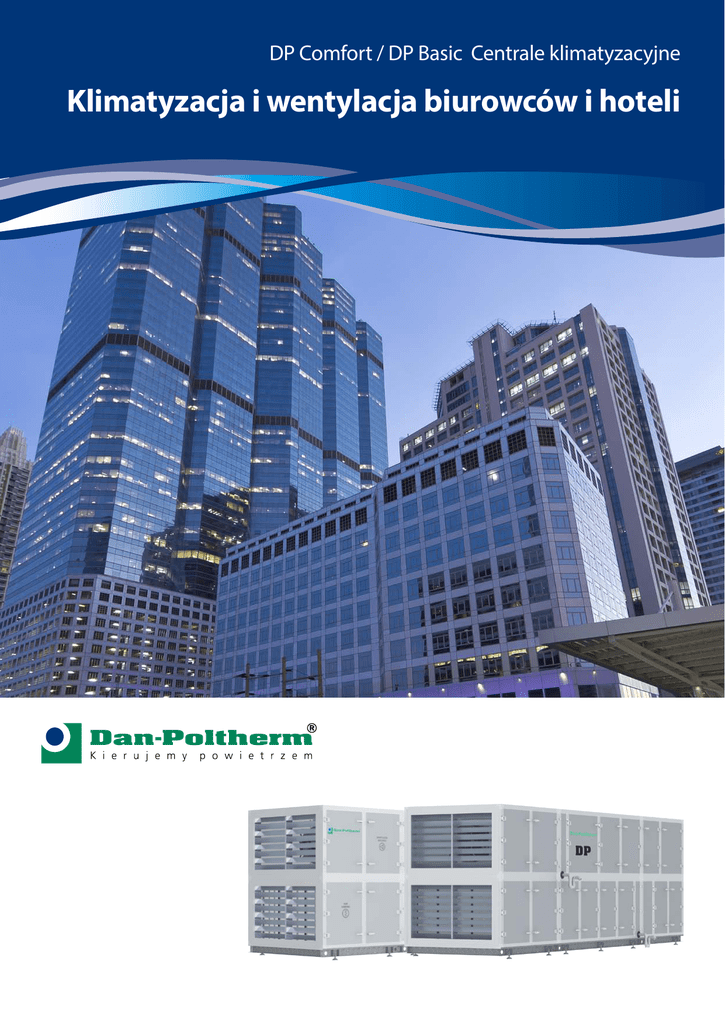 DP Comfort / DP Basic Centrale klimatyzacyjne Klimatyzacja i wentylacja biurowców i hoteli Opis ogólny Klimatyzacja budynków biurowych, hotelowych i edukacyjnych Wymienniki obrotowe central DP R oferują wysoki stopień odzysku ciepła zimą i chłodu latem, a dzięki higroskopijnej powierzchni w maksymalnym stopniu również odzyskują wilgoć tak pożądaną zimą dla zachowania pełnego komfortu przebywającym w pomieszczeniach ludziom. Wyższe wymagania odnośnie poziomu wilgoci w pomieszczeniach można zapewnić stosując jeden z wielu parowych systemów nawilżania brytyjskiej firmy VAPAC lub zabudowany wewnątrz urządzenia nawilżacz adiabatyczny firmy Dan-Poltherm. Głównym zadaniem central klimatyzacyjnych obiektów biurowych, hotelowych oraz edukacyjnych jest zapewnienie odpowiedniej ilości świeżego powietrza przebywającym w budynku osobom. Czasem zdarza się, iż centrale klimatyzacyjne / wentylacyjne stanowią główne źródło chłodu lub ciepła dla obsługiwanych pomieszczeń, ale zazwyczaj ich podstawową a zarazem główną rolą jest 100-procentowa wymiana powietrza w obsługiwanej przestrzeni, co wynika z warunków higienicznych. Hotel „SHERATON SOPOT HOTEL, CONFERENCE CENTER & SPA” Centrale klimatyzacyjne współpracujące z wewnętrznymi systemami klimatyzacyjnymi i grzewczymi budynku muszą zapewniać wysoki poziom odzysku ciepła / chłodu, a dostarczane do pomieszczeń powietrze powinno mieć temperaturę przynajmniej równą temperaturze wyciągowej (zadanej w pomieszczeniu). Zapewnienie odpowiedniej temperatury nawiewu wymusza konieczność zastosowania w centrali, oprócz odzysku ciepła, dodatkowej funkcji chłodzenia, grzania oraz nawilżania powietrza. Do klimatyzacji i wentylacji obiektów typu biurowego i hotelowego firma Dan-Poltherm proponuje centrale klimatyzacyjne typu DP R Comfort wyposażone w rewersyjne pompy ciepła lub centrale typu DP R Basic współpracujące z zewnętrznym źródłem chłodu i ciepła, z możliwością zastosowania zintegrowanego w urządzeniu chłodzenia. Rozwiązania DP R Comfort i DP R Basic można stosować w systemach, gdzie wymagana jest 100-procentowa wymiana powietrza oraz w systemach z recyrkulacją, gdzie centrale stanowią jedyne źródło chłodu i ogrzewania dla obsługiwanej przestrzeni (brak wewnętrznych systemów, np. klimakonwektorów). Funkcje chłodzenia oraz grzania zazwyczaj realizowane są poprzez urządzenia wewnętrzne współpracujące z kotłownią i systemem wody lodowej (klimakonwektory) np. firmy VENCO i VENTILCLIMA. Dzięki takiemu układowi, każde z pomieszczeń zyskuje niezależność temperaturową od reszty budynku wraz z wentylacją realizowaną przez centrale klimatyzacyjne. Biurowiec „TRINITY PARK III” w Warszawie Istotnym elementem w systemie klimatyzacyjnym np. biurowców, jest odpowiednie zaprojektowanie systemu dystrybucji powietrza w pomieszczeniach tak, aby zapewnić komfort temperaturowy przebywających w nich ludzi. Nawiewniki oraz pozostałe elementy dystrybucji powietrza belgijskiej firmy GRADA zapewniają pełny komfort temperaturowy i akustyczny. Pełna gama produktów w ofercie firmy Dan-Poltherm daje możliwość zaprojektowania nowoczesnych pomieszczeń a jakość produktów firmy GRADA została potwierdzona w ciągu kilku ostatnich dziesięcioleci w nowoczesnych i reprezentacyjnych budynkach na całym Świecie. Użytkownicy dowolnie sterują klimatem w obsługiwanej przestrzeni (strefie) dzięki niezależnym sterownikom w pomieszczeniach lub poprzez zintegrowany system BMS budynku np. DP ViewNet firmy DanPoltherm, z możliwością zdalnej wizualizacji przy użyciu dowolnego urządzenia mobilnego czy komputera z przeglądarką internetową. Centrale klimatyzacyjne mogą dostarczać powietrze ze stałym bądź zmiennym wydatkiem powietrza. Kompleks handlowo-biurowo-rozrywkowy „ZŁOTE TARASY” w Warszawie DP Comfort – Centrale klimatyzacyjne z rewersyjną pompą ciepła DP Basic – Centrale klimatyzacyjne ze zintegrowanym chłodzeniem Centrale DP to gotowe zespoły z zabudowaną kompletną automatyką. Praca centrali w oparciu o testowane fabrycznie autorskie oprogramowanie zapewnia optymalną pod kątem energooszczędności pracę urządzenia. Urządzenia po podłączeniu kanałów oraz zasilania elektrycznego są gotowe do pracy, a dla jednostek z pompą ciepła nie wymagają kosztownych prac przyłączeniowych do zewnętrznych mediów grzewczych i chłodniczych, redukując moc kotłowni i agregatów zainstalowanych w budynku. Zwrócić należy uwagę na fakt, iż centrale z pompą ciepła nie wymagają zwiększonego przyłącza elektrycznego, które wynika wprost z warunku chłodniczego w trybie pracy latem. Dodatkową zaletą zintegrowanej automatyki (rozdzielnica elektryczna wewnątrz urządzenia) jest redukcja długości przewodów elektrycznych i tras kablowych na potrzeby zasilania oraz konieczności wydzielenia miejsca w budynku na zewnętrzne rozdzielnice. Centrale DP R Comfort oraz DP R Basic wyposażone są standardowo w wysokosprawne higroskopijne wymienniki obrotowe o płynnej regulacji obrotów, produkowane przez Klingenburg lub Heatex – producentów posiadających Certyfikat Eurovent: www.eurovent-certification.com. Hotel „WARSAW MARRIOTT HOTEL” Centrale przeznaczone do 100-procentowej wymiany powietrza w budynkach biurowych oraz hotelowych, bez możliwości recyrkulacji, zazwyczaj współpracują z wewnętrznymi systemami klimatyzacyjno-grzewczymi, a ich głównym zadaniem jest dostarczanie powietrza o odpowiednich parametrach w ilości wynikającej z przepisów sanitarnych. Centrale z funkcją recyrkulacji, oprócz dostarczania powietrza ze względów sanitarnych, mogą (dzięki zwiększonej ilości wymian) zapewnić pełną klimatyzację i ogrzewanie eliminując tym samym instalacje towarzyszące, co ma istotne znaczenie dla przestrzeni, gdzie montaż np. klimakonwektorów nie jest możliwy. DP Comfort DP Basic DP Comfort to gru