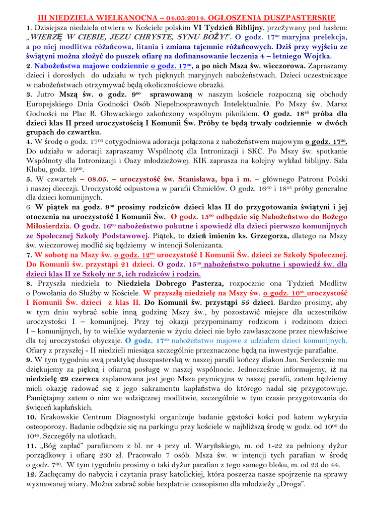 III NIEDZIELA WIELKANOCNA – 04.05.2014. OGŁOSZENIA DUSZPASTERSKIE 1. Dzisiejsza niedziela otwiera w Kościele polskim VI Tydzień Biblijny, przeżywany pod hasłem: „WIERZĘ W CIEBIE, JEZU CHRYSTE, SYNU BOŻY!”. O godz. 1700 maryjna prelekcja, a po niej modlitwa różańcowa, litania i zmiana tajemnic różańcowych. Dziś przy wyjściu ze świątyni można złożyć do puszek ofiarę na dofinansowanie leczenia 4 – letniego Wojtka. 2. Nabożeństwa majowe codziennie o godz. 1730, a po nich Msza św. wieczorowa. Zapraszamy dzieci i dorosłych do udziału w tych pięknych maryjnych nabożeństwach. Dzieci uczestniczące w nabożeństwach otrzymywać będą okolicznościowe obrazki. 3. Jutro Mszą św. o godz. 900 sprawowaną w naszym kościele rozpoczną się obchody Europejskiego Dnia Godności Osób Niepełnosprawnych Intelektualnie. Po Mszy św. Marsz Godności na Plac B. Głowackiego zakończony wspólnym piknikiem. O godz. 1845 próba dla dzieci klas II przed uroczystością I Komunii Św. Próby te będą trwały codziennie w dwóch grupach do czwartku. 4. W środę o godz. 1700 cotygodniowa adoracja połączona z nabożeństwem majowym o godz. 1730. Do udziału w adoracji zapraszamy Wspólnotę dla Intronizacji i SKC. Po Mszy św. spotkanie Wspólnoty dla Intronizacji i Oazy młodzieżowej. KIK zaprasza na kolejny wykład biblijny. Sala Klubu, godz. 1900. 5. W czwartek – 08.05. – uroczystość św. Stanisława, bpa i m. – głównego Patrona Polski i naszej diecezji. Uroczystość odpustowa w parafii Chmielów. O godz. 1630 i 1845 próby generalne dla dzieci komunijnych. 6. W piątek na godz. 900 prosimy rodziców dzieci klas II do przygotowania świątyni i jej otoczenia na uroczystość I Komunii Św. O godz. 1500 odbędzie się Nabożeństwo do Bożego Miłosierdzia. O godz. 1600 nabożeństwo pokutne i spowiedź dla dzieci pierwszo komunijnych ze Społecznej Szkoły Podstawowej. Piątek, to dzień imienin ks. Grzegorza, dlatego na Mszy św. wieczorowej modlić się będziemy w intencji Solenizanta. 7. W sobotę na Mszy św. o godz. 1200 uroczystość I Komunii Św. dzieci ze Szkoły Społecznej. Do Komunii św. przystąpi 21 dzieci. O godz. 1530 nabożeństwo pokutne i spowiedź św. dla dzieci klas II ze Szkoły nr 3, ich rodziców i rodzin. 8. Przyszła niedziela to Niedziela Dobrego Pasterza, rozpocznie ona Tydzień Modlitw o Powołania do Służby w Kościele. W przyszłą niedzielę na Mszy św. o godz. 1030 uroczystość I Komunii Św. dzieci z klas II. Do Komunii św. przystąpi 55 dzieci. Bardzo prosimy, aby w tym dniu wybrać sobie inną godzinę Mszy św., by pozostawić miejsce dla uczestników uroczystości I – komunijnej. Przy tej okazji przypominamy rodzicom i rodzinom dzieci I – komunijnych, by to wielkie wydarzenie w życiu dzieci nie było zawłaszczone przez niewłaściwe dla tej uroczystości obyczaje. O godz. 1730 nabożeństwo majowe z udziałem dzieci komunijnych. Ofiary z przyszłej - II niedzieli miesiąca szczególnie przeznaczone będą na inwestycje parafialne. 9. W tym tygodniu swą praktykę duszpasterską w naszej parafii kończy diakon Jan. Serdecznie mu dziękujemy za piękną i ofiarną posługę w naszej wspólnocie. Jednocześnie informujemy, iż na niedzielę 29 czerwca zaplanowana jest jego Msza prymicyjna w naszej parafii, zatem będziemy mieli okazję radować się z jego sakramentu kapłaństwa do którego nadal się przygotowuje. Pamiętajmy zatem o nim we wdzięcznej modlitwie, szczególnie w tym czasie przygotowania do święceń kapłańskich. 10. Krakowskie Centrum Diagnostyki organizuje badanie gęstości kości pod katem wykrycia osteoporozy. Badanie odbędzie się na parkingu przy kościele w najbliższą środę w godz. od 1000 do 1045. Szczegóły na ulotkach. 11. „Bóg zapłać” parafianom z bl. nr 4 przy ul. Waryńskiego, m. od 1-22 za pełniony dyżur porządkowy i ofiarę 230 zł. Pracowało 7 osób. Msza św. w intencji tych parafian w środę o godz. 700. W tym tygodniu prosimy o taki dyżur parafian z tego samego bloku, m. od 23 do 44. 12. Zachęcamy do nabycia i czytania prasy katolickiej, która poszerza nasze spojrzenie na sprawy wyznawanej wiary. Można zabrać sobie bezpłatnie czasopismo dla młodzieży „Droga”.