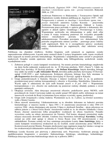 Leszek Kocoń, Zaginieni 1939 – 1945. Postępowania o uznanie za zmarłego i stwierdzenie zgonu, tom – powiat łomżyński, Białystok 2008, ss. 230 Archiwum Państwowe w Białymstoku i Towarzystwo Opieki nad Majdankiem wydały drukiem publikację pt. Zaginieni 1939 – 1945. Postępowania o uznanie za zmarłego i stwierdzenie zgonu, tom – powiat łomżyński autorstwa Leszka Koconia – pracownika Archiwum Państwowego w Białymstoku Oddział w Łomży. Prezentowana praca powstała w oparciu głównie o dokumenty dot. zgonów w aktach sądów: Grodzkiego i Powiatowego w Łomży. Wspomniane archiwalia nie dokumentują w pełni skali ofiar w czasie II wojny światowej ponieważ nie wszystkie przypadki śmierci mieszkańców powiatu łomżyńskiego zostały udokumentowane. Powodem powstania ww. dokumentacji była potrzeba uregulowania statusu cywilno – prawnego przez rodziny osób zaginionych. Były to w szczególności sprawy: uzyskania renty, odszkodowania po zaginionych, chęć założenia nowej rodziny. Publikacja ma charakter źródłowy. Krótkie biogramy osób uznanych za zaginione zostały zaprezentowane alfabetycznie. Łącznie autor zestawił około 2 tysięcy biogramów osób, często zwykłych ludzi żyjących na terenie powiatu łomżyńskiego. Wyjaśnienia i uzupełniania autor zawarł w przypisach naukowych. Książka została opatrzona także niezbędną notą bibliograficzną; aczkolwiek zostały wyodrębnione serie: 1. Żołnierze polegli w czasie kampanii wrześniowej. Na terenie powiatu łomżyńskiego znajdowała się duża liczba jednostek wojskowych (m. in. 18 Dywizja piechoty, SGO „Narew”). Udało się ustalić losy dowódcy 18 Dywizji piechoty – płk Stefana Koseckiego. Innym dowódcą, którego losy udało się ustalić to płk Aleksander Hertel, dowódca pułku piechoty dywizyjnej 18 Dywizji: zginął 13.09.1939 r. pod Andrzejewem. Kolejnym oficerem, którego losy były nieznane to płk Kaganowicz dowódca pułku piechoty dywizyjnej 41 Dywizji: zginął w Katyniu. 2. Grupa pomordowanych w Katyniu. Decyzje o śmierci wydawane były m. in. na podstawie przedstawionej przez rodzinę korespondencji z obozów w Kozielsku, Starobielsku, Ostaszkowie. Wyrok sądu w odniesieniu do tych osób brzmiał zmarli w II poł. 1941 r. Wspomniana korespondencja z ww. obozów nie zachowała się ponieważ rodziny składały podania o zwrot pamiątek rodzinnych. 3. Okupacja sowiecka. Akta dotyczące aresztowań oficerów, podoficerów przez NKWD, osób powołanych do Armii Czerwonej (udało się ustalić ponad 100 takich osób), informacje na temat masowych wywózek do Rosji (wymieniane bywa miejsce wywózki, zgonu, pochówku). 4. Grupa osób związanych z armią Andersa. Wymienieni są m. in. 2 piloci, są również uczestnicy walk o Monte Cassino. 5. Okres niewoli niemieckiej. Udokumentowane są tu zbrodnie dokonane na ludności powiatu łomżyńskiego: a/ masowe mordy z lipca 1941 r. b/ zanotowano aresztowań w roku 1944 (15 czerwca 1944 - akcja obejmująca cały powiat; 8 lipca w okolicach Serafina – akcja odwetowa za odbicie jeńców z z obozu Gross Rosen. Aresztowani trafiali m. in. do obozów Sztuthofie i Gross Rosen; chociaż zanotowano kilka przypadków wysłanych do obozu Auschwitz. Ponadto wywożono osoby na roboty przymusowe do Niemiec. Pod koniec okupacji niemieckiej miało miejsce niszczenie dowodów zbrodni. Ustalono losy burmistrza Jedwabnego Karolaka; według zeznań jej córki miał zginąć w obozie w Gross Rosen wraz 100 aresztowanymi z nim zakładnikami. Poznane zostały też losy ostatniego prezydenta Łomży Jana Janickiego, który w czasie kampanii wrześniowej ewakuował się na wschód; został aresztowany przez NKWD w Kostrowiczach powiat Słonim. Poznanie okoliczności jego zaginięcia mogą być istotne z uwagi na los ewakuowanych dokumentów archiwalnych Urzędu Miejskiego w Łomży. Publikacja Leszka Koconia jest pierwszą z planowanej serii. Pracownicy Archiwum pracują nad opublikowaniem biogramów z powiatów: białostockiego, bielskiego, sokolskiego, kolneńskiego. Publikacja dotycząca powiatu białostockiego ukaże się w połowie 2009 r.