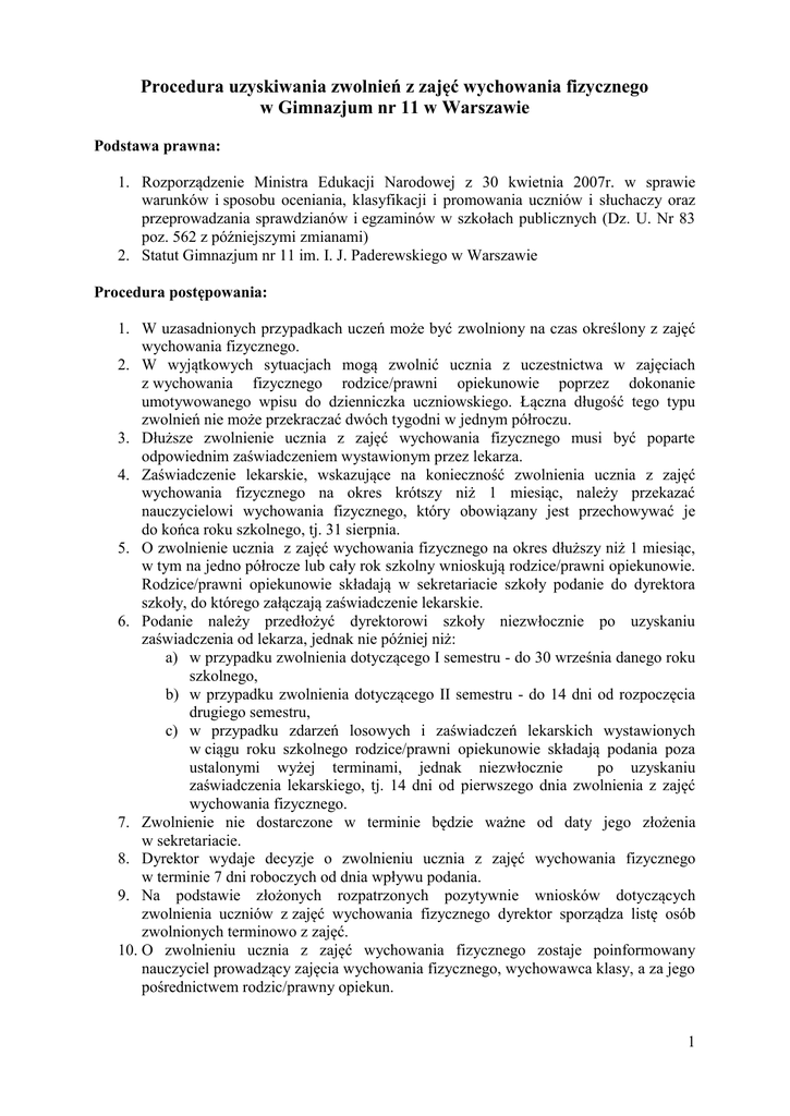 Procedura uzyskiwania zwolnień z zajęć wychowania fizycznego w Gimnazjum nr 11 w Warszawie Podstawa prawna: 1. Rozporządzenie Ministra Edukacji Narodowej z 30 kwietnia 2007r. w sprawie warunków i sposobu oceniania, klasyfikacji i promowania uczniów i słuchaczy oraz przeprowadzania sprawdzianów i egzaminów w szkołach publicznych (Dz. U. Nr 83 poz. 562 z późniejszymi zmianami) 2. Statut Gimnazjum nr 11 im. I. J. Paderewskiego w Warszawie Procedura postępowania: 1. W uzasadnionych przypadkach uczeń może być zwolniony na czas określony z zajęć wychowania fizycznego. 2. W wyjątkowych sytuacjach mogą zwolnić ucznia z uczestnictwa w zajęciach z wychowania fizycznego rodzice/prawni opiekunowie poprzez dokonanie umotywowanego wpisu do dzienniczka uczniowskiego. Łączna długość tego typu zwolnień nie może przekraczać dwóch tygodni w jednym półroczu. 3. Dłuższe zwolnienie ucznia z zajęć wychowania fizycznego musi być poparte odpowiednim zaświadczeniem wystawionym przez lekarza. 4. Zaświadczenie lekarskie, wskazujące na konieczność zwolnienia ucznia z zajęć wychowania fizycznego na okres krótszy niż 1 miesiąc, należy przekazać nauczycielowi wychowania fizycznego, który obowiązany jest przechowywać je do końca roku szkolnego, tj. 31 sierpnia. 5. O zwolnienie ucznia z zajęć wychowania fizycznego na okres dłuższy niż 1 miesiąc, w tym na jedno półrocze lub cały rok szkolny wnioskują rodzice/prawni opiekunowie. Rodzice/prawni opiekunowie składają w sekretariacie szkoły podanie do dyrektora szkoły, do którego załączają zaświadczenie lekarskie. 6. Podanie należy przedłożyć dyrektorowi szkoły niezwłocznie po uzyskaniu zaświadczenia od lekarza, jednak nie później niż: a) w przypadku zwolnienia dotyczącego I semestru - do 30 września danego roku szkolnego, b) w przypadku zwolnienia dotyczącego II semestru - do 14 dni od rozpoczęcia drugiego semestru, c) w przypadku zdarzeń losowych i zaświadczeń lekarskich wystawionych w ciągu roku szkolnego rodzice/prawni opiekunowie składają podania poza ustalonymi wyżej terminami, jednak niezwłocznie po uzyskaniu zaświadczenia lekarskiego, tj. 14 dni od pierwszego dnia zwolnienia z zajęć wychowania fizycznego. 7. Zwolnienie nie dostarczone w terminie będzie ważne od daty jego złożenia w sekretariacie. 8. Dyrektor wydaje decyzje o zwolnieniu ucznia z zajęć wychowania fizycznego w terminie 7 dni roboczych od dnia wpływu podania. 9. Na podstawie złożonych rozpatrzonych pozytywnie wniosków dotyczących zwolnienia uczniów z zajęć wychowania fizycznego dyrektor sporządza listę osób zwolnionych terminowo z zajęć. 10. O zwolnieniu ucznia z zajęć wychowania fizycznego zostaje poinformowany nauczyciel prowadzący zajęcia wychowania fizycznego, wychowawca klasy, a za jego pośrednictwem rodzic/prawny opiekun. 1 11. Jeżeli uczeń uzyskuje zwolnienie w trakcie roku szkolnego, a jego nieobecności na lekcjach nie przekroczyły 50 % i są podstawy do wystawienia oceny, uczeń podlega klasyfikacji z danego przedmiotu. 12. W przypadku zwolnienia ucznia z zajęć wychowania fizycznego przez cały rok szkolny, na świadectwie ukończenia nauki w danym roku szkolnym oraz w arkuszu ocen wpisuje się "zwolniony". 13. Jeżeli uczeń uzyskał ocenę w jednym półroczu, a decyzją dyrektora szkoły został zwolniony z zajęć wychowania fizycznego w drugim półroczu, na świadectwie i w arkuszu ocen wpisuję się ocenę z tego półrocza. 14. Uczeń zwolniony z zajęć wychowania fizycznego ma obowiązek być pod opieką nauczyciela. W przypadku dłuższego zwolnienia uczeń za zgodą nauczyciela wychowania fizycznego może przebywać pod opieką innego nauczyciela np. w bibliotece szkolnej. W szczególnych przypadkach, gdy zajęcia wychowania fizycznego są pierwszymi lub ostatnimi planowymi lekcjami ucznia w danym dniu, uczeń może być zwolniony z tego obowiązku na pisemnego oświadczenia rodzica/prawnego opiekuna, które to oświadczenie należy załączyć do podania i zaświadczenia lekarskiego. 15. Uczeń zwalniany z zajęć do domu ma odznaczone w dzienniku nieobecności usprawiedliwione. 16. Zawarte w zaświadczeniu lekarskim ewentualne ograniczenia, skutkujące zwolnieniem z wykonywanej grupy ćwiczeń, nie stanowią podstawy do zwolnienia ucznia z zajęć wychowania fizycznego. Takie zaświadczenie rodzic składa nauczycielowi wychowania fizycznego, który ma obowiązek uwzględnić zalecenia lekarza w pracy z uczniem. 17. W przypadku odmownej decyzji dyrektora szkoły dotyczącej zwolnienia ucznia z zajęć wychowania fizycznego rodzicowi/prawnemu opiekunowi przysługuje prawo do odwołania się za pośrednictwem dyrektora szkoły do Mazowieckiego Kuratora Oświaty. 18. Z niniejszą procedurą uczniów zapoznaje nauczyciel wychowania fizycznego na pierwszych zajęciach w danym roku szkolnym, natomiast wychowawca klasy rodziców/prawnych opiekunów na pierwszym zebraniu. 2